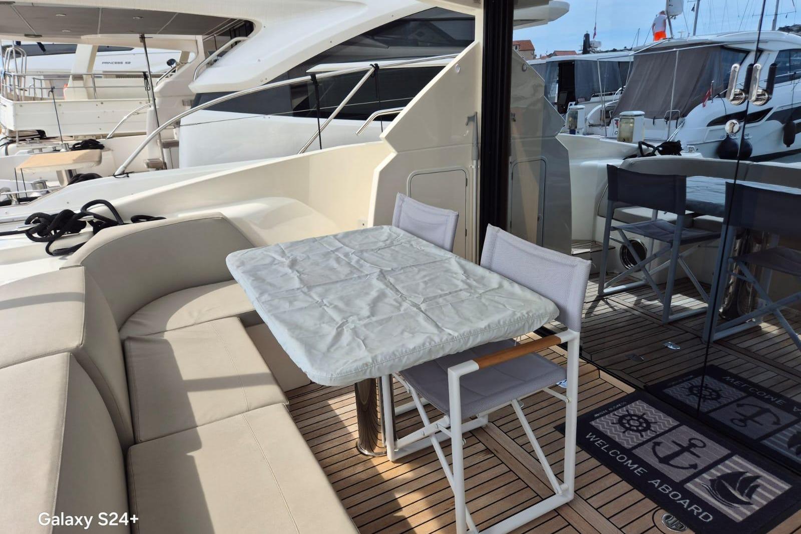 On the upper deck, an outdoor lounge that includes a table and a wet bar, can comfortably accommodate up to eight guests. Moreover, the technological and ergonomic helm station allows navigating surrounded by friends, always with everything under control.