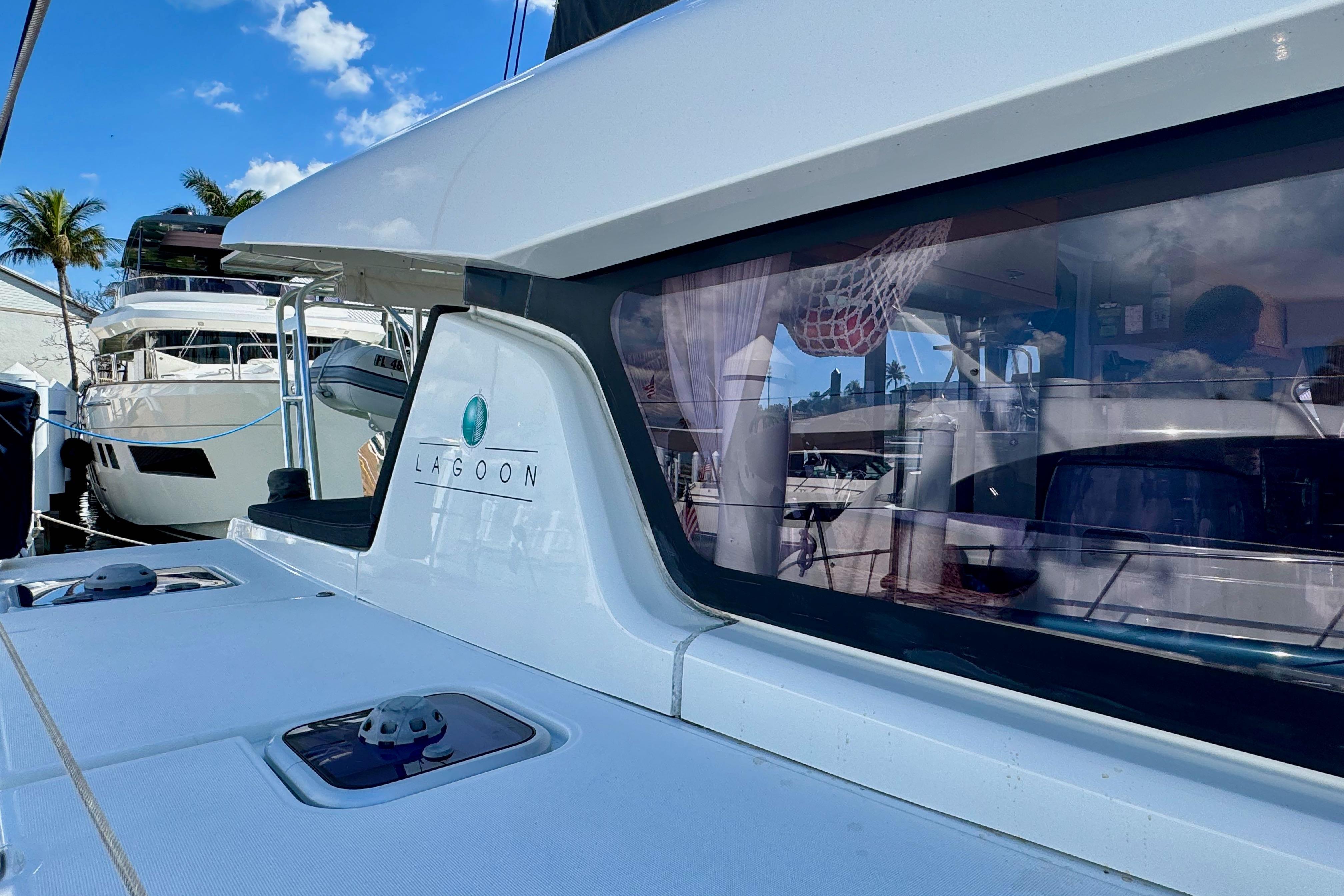 Oversized windows flood the saloon and cabins with natural light, framing whatever view lies beyond. The single-level cockpit flows seamlessly from the aft swim platform to the saloon, creating an effortless indoor-outdoor living space. The coachroof helm station keeps the skipper connected to both the cockpit conversation and the sails above — a layout that rewards passage-making and lazy afternoons at anchor in equal measure.