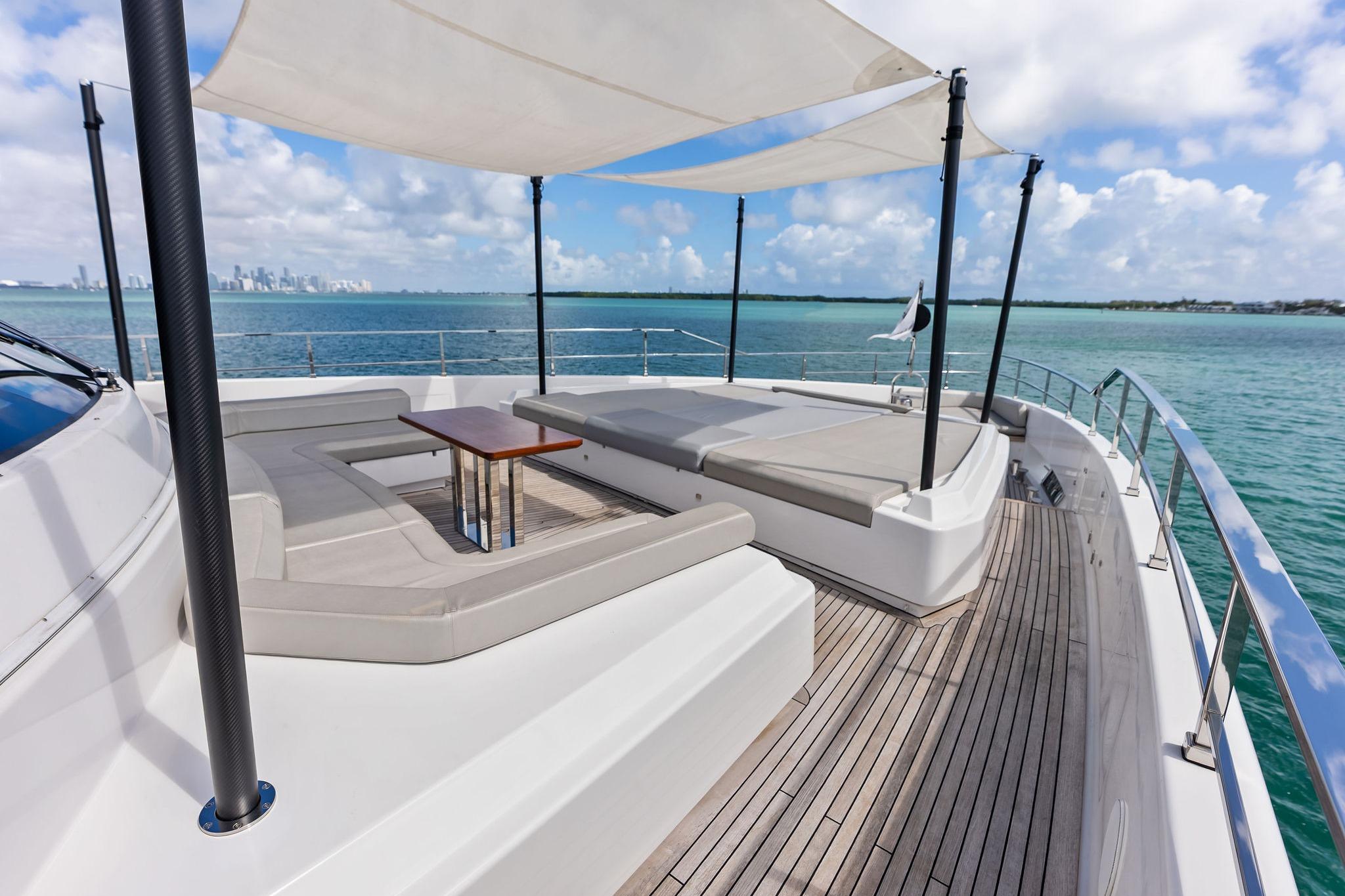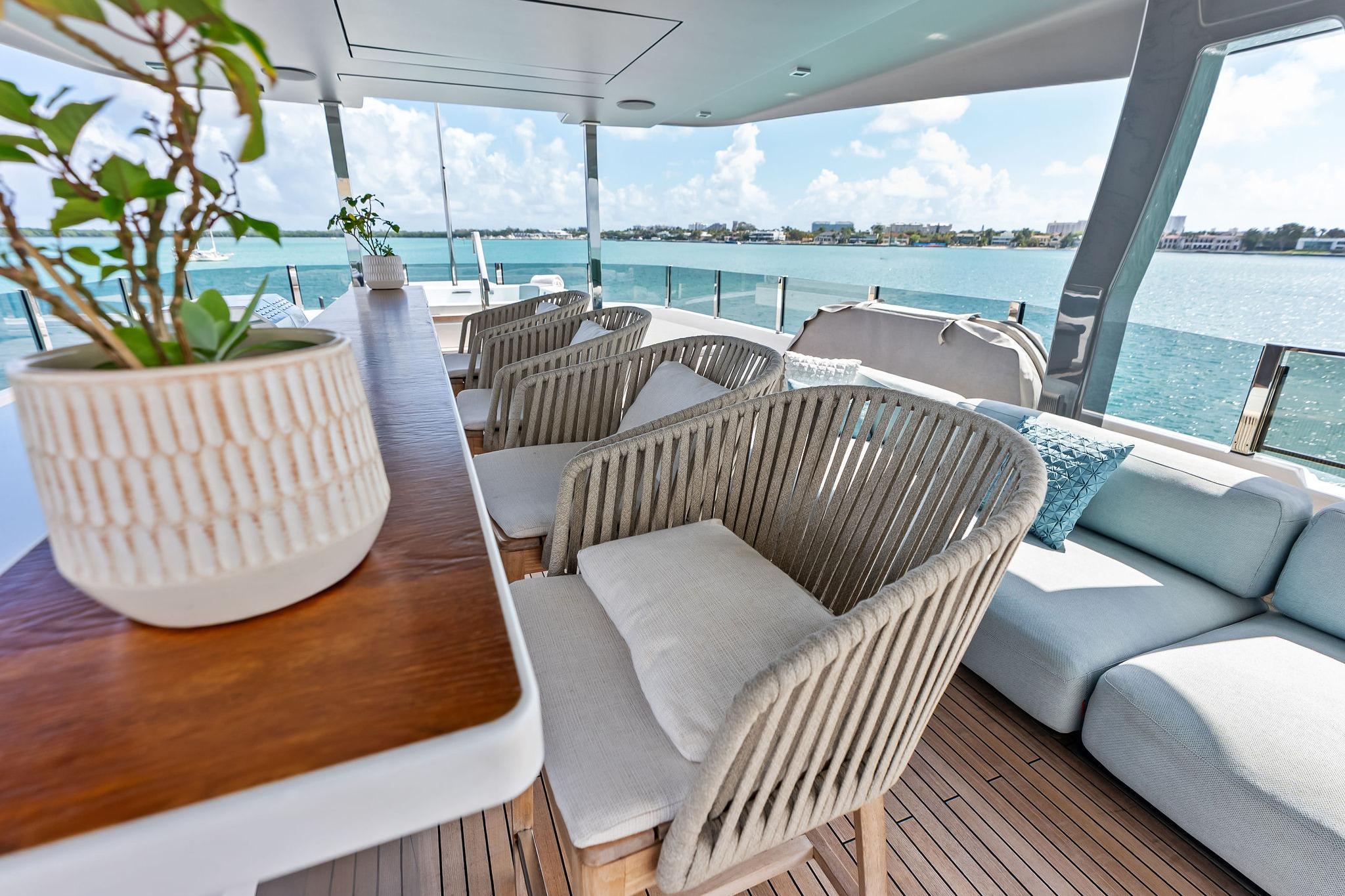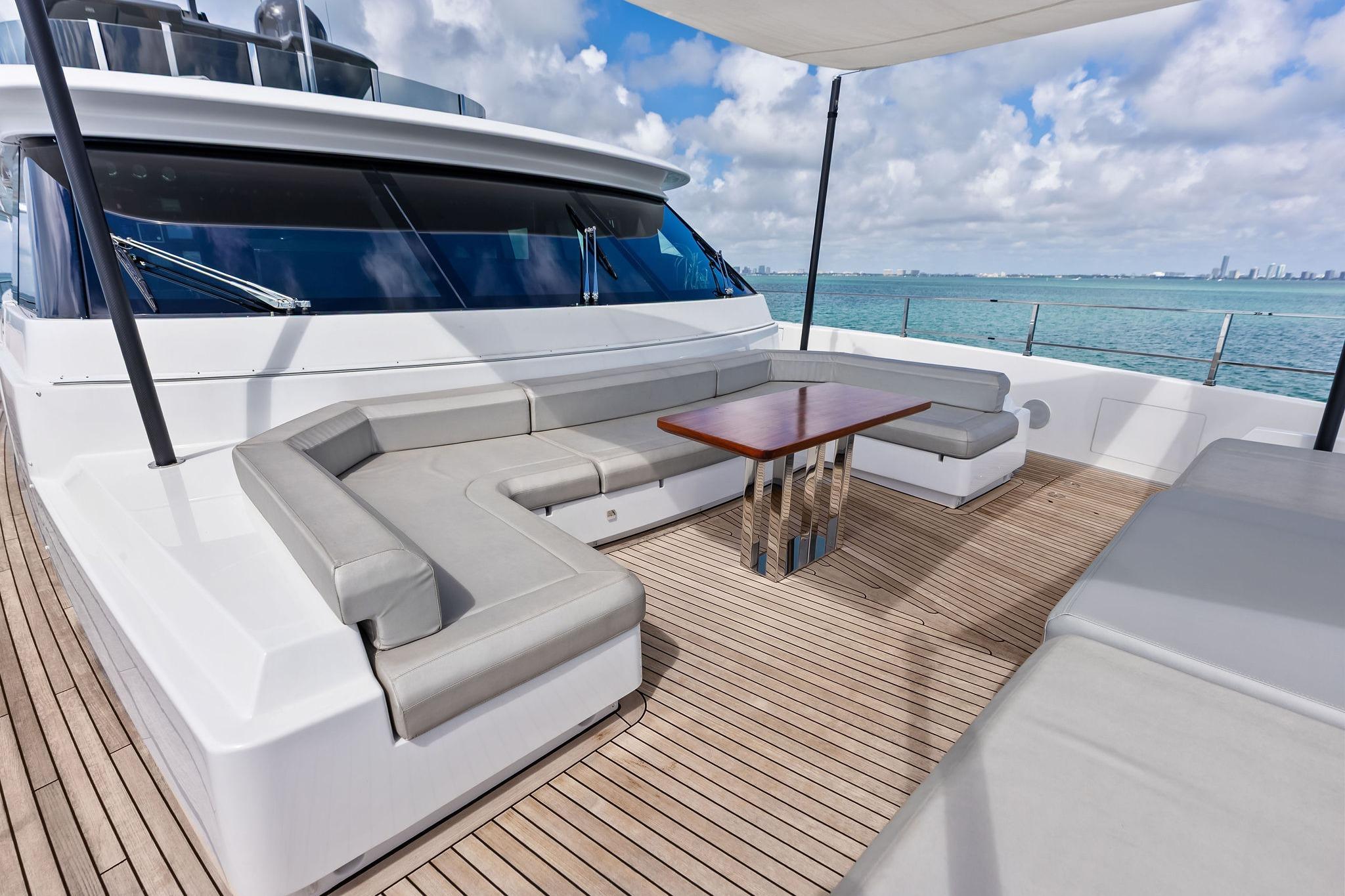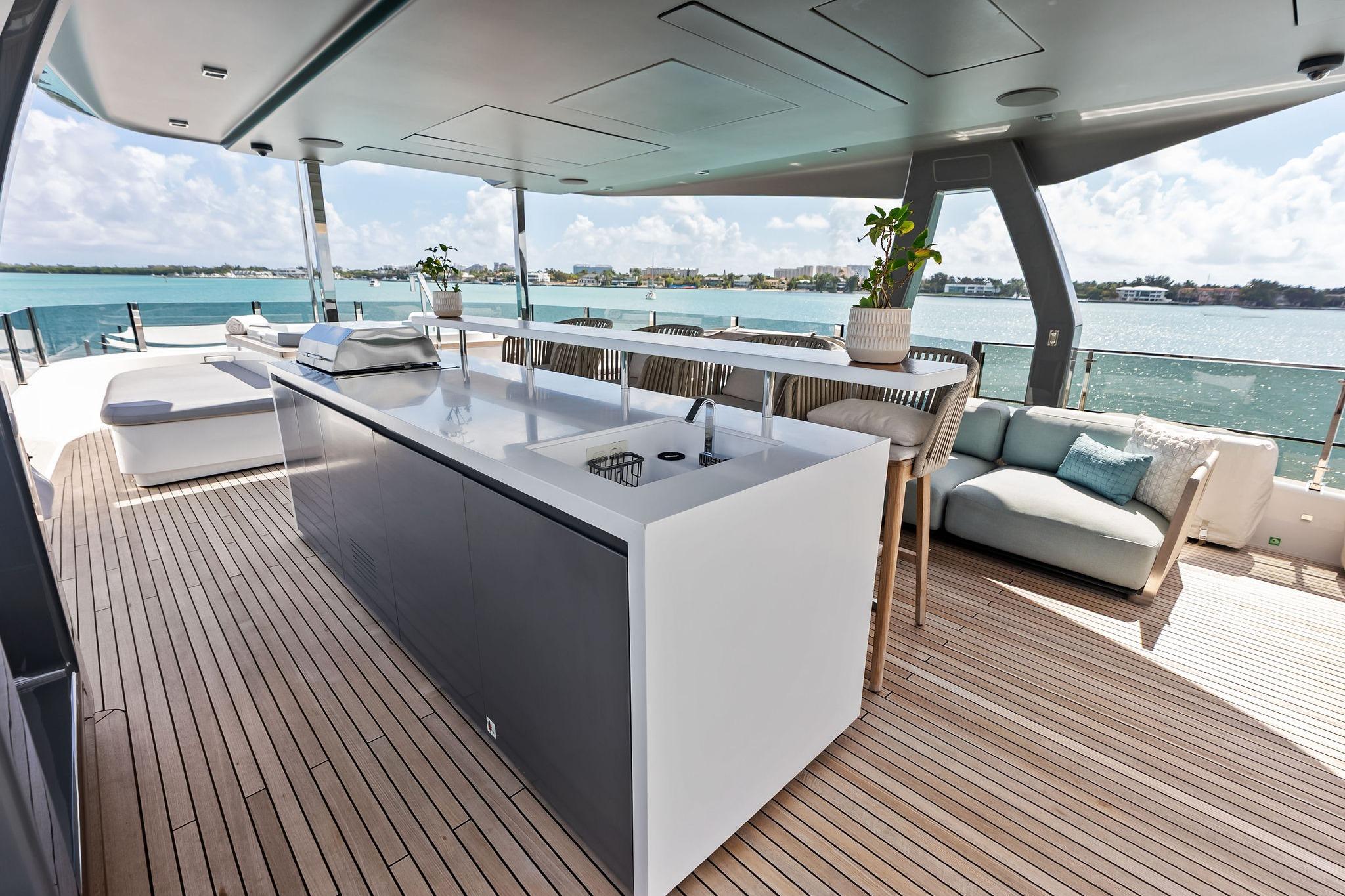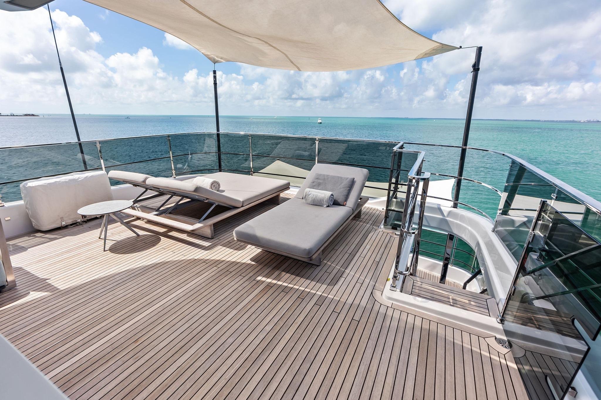 - Bimini top with carbon fibre poles on aft sun deck