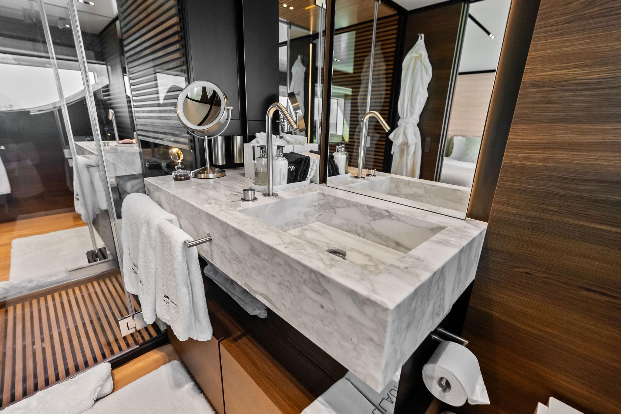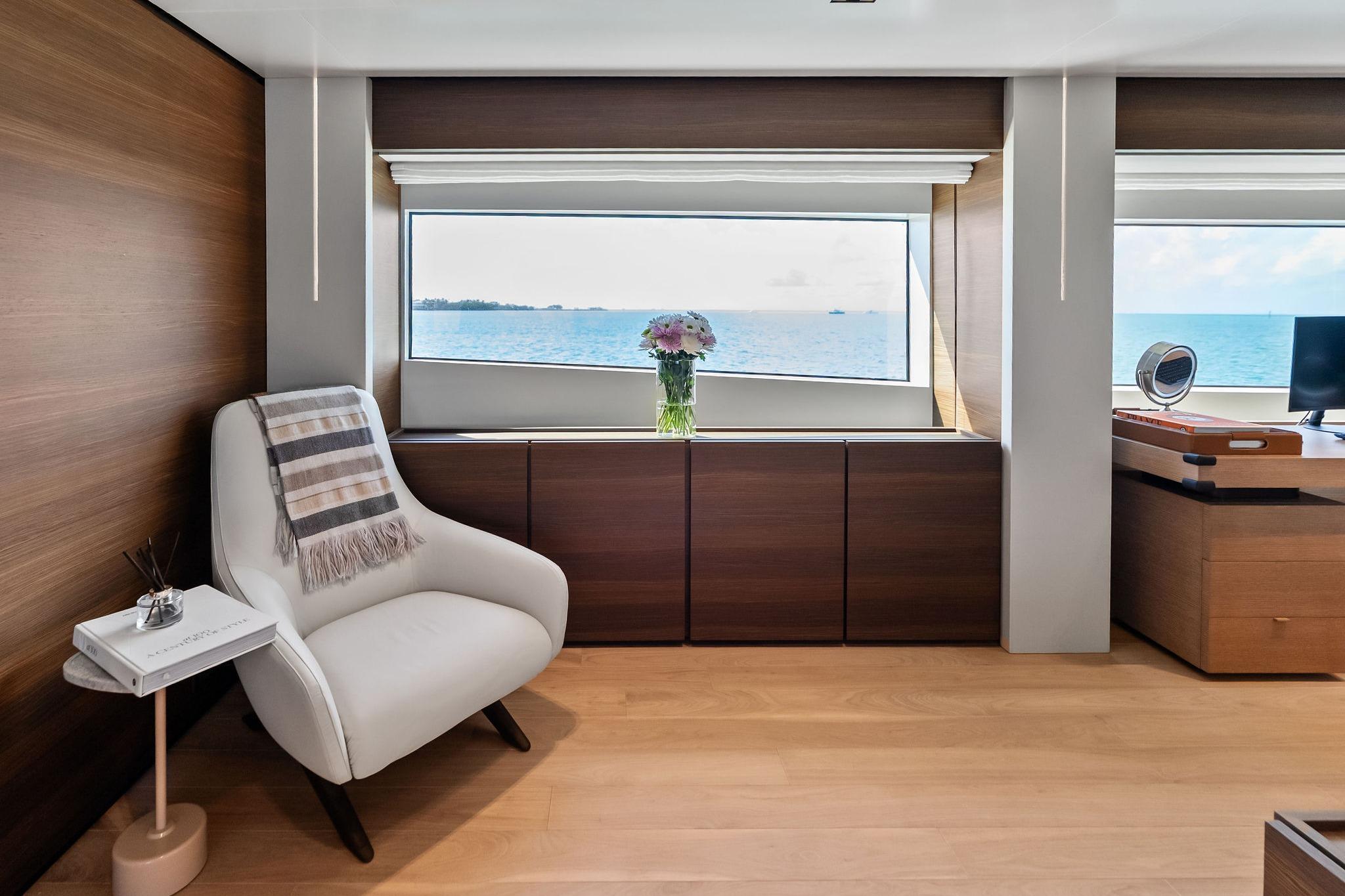- Master cabin: TV frame in same leather as the columns
