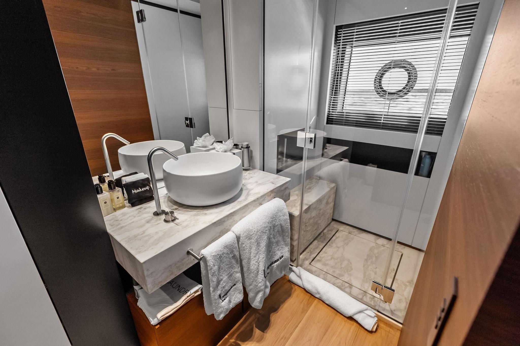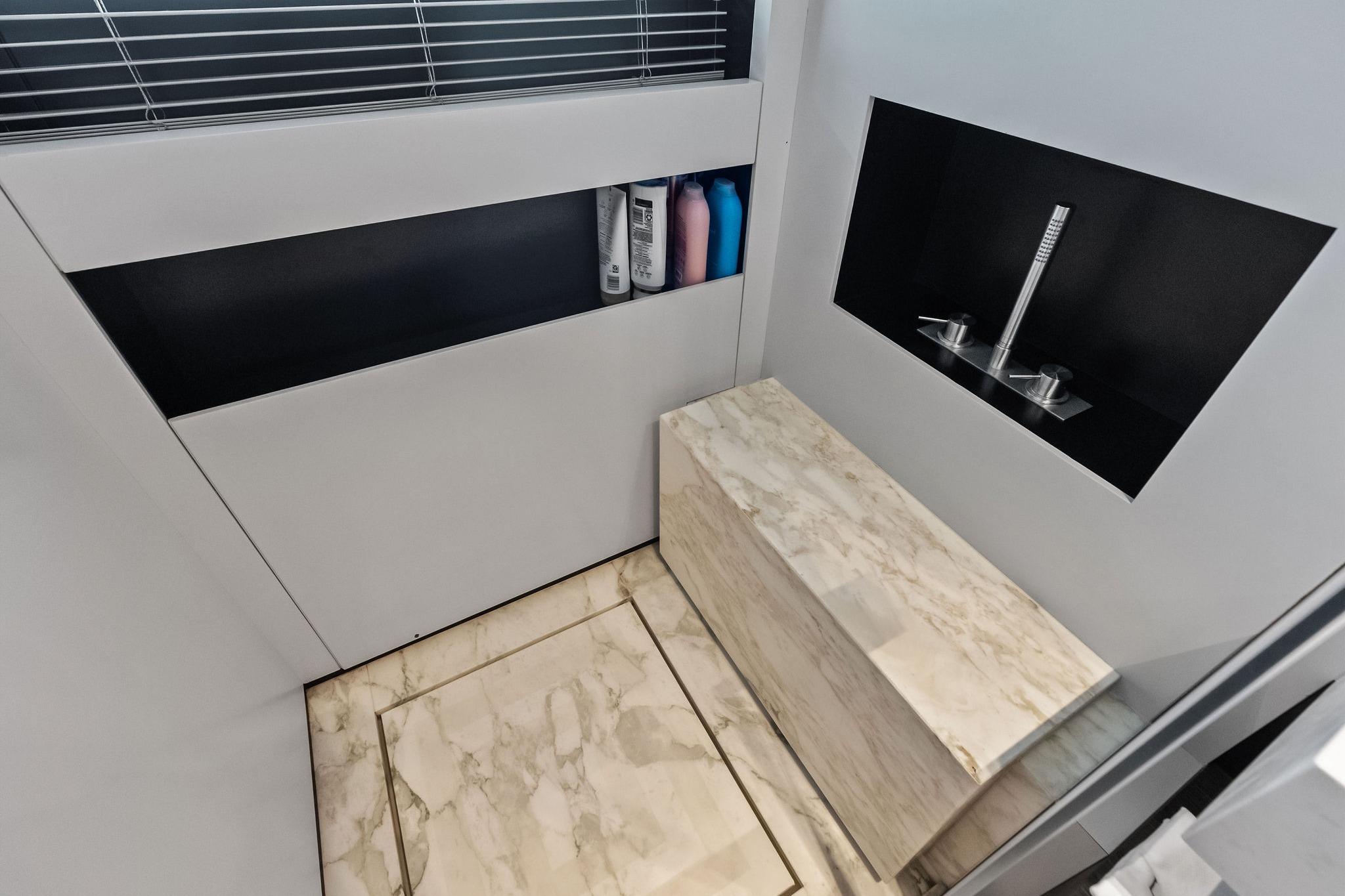 - Master bathroom: built-in wash basins and bench shower in marble Calacatta Oro