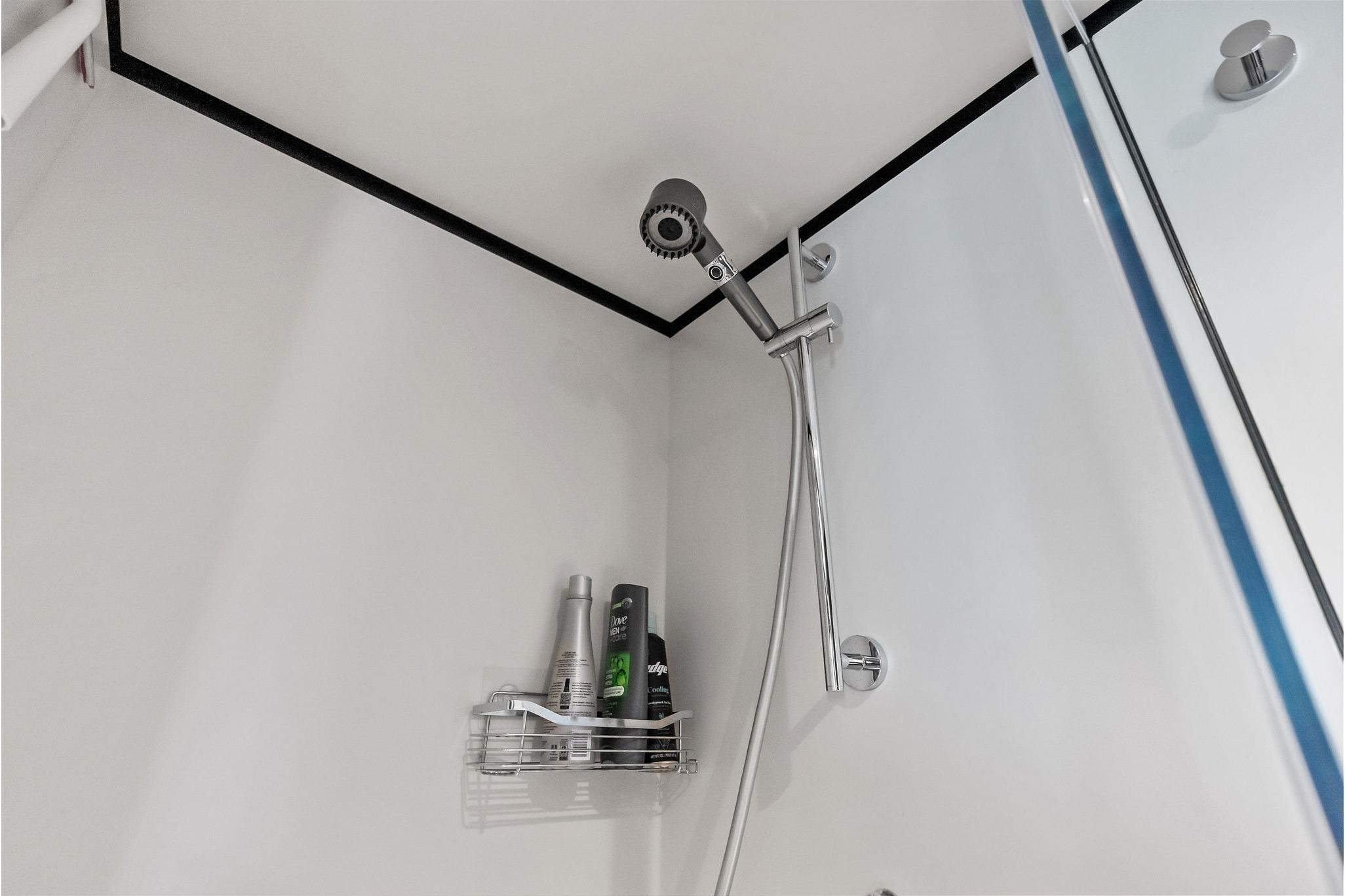 - Hand shower with removable pole (hot/cold fresh water) on bathing platform