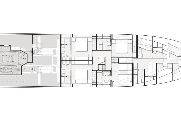 Inside, every space is an affirmation of the Navetta 33 vision. the areas dedicated to the family and their guests open up on all 4 decks - from the wide-body master suite forward on the main deck to the 4 guest cabins below. Custom Line's advance technology assures comfort and stability, whatever the conditions. It is a state-of-the-art masterpiece.