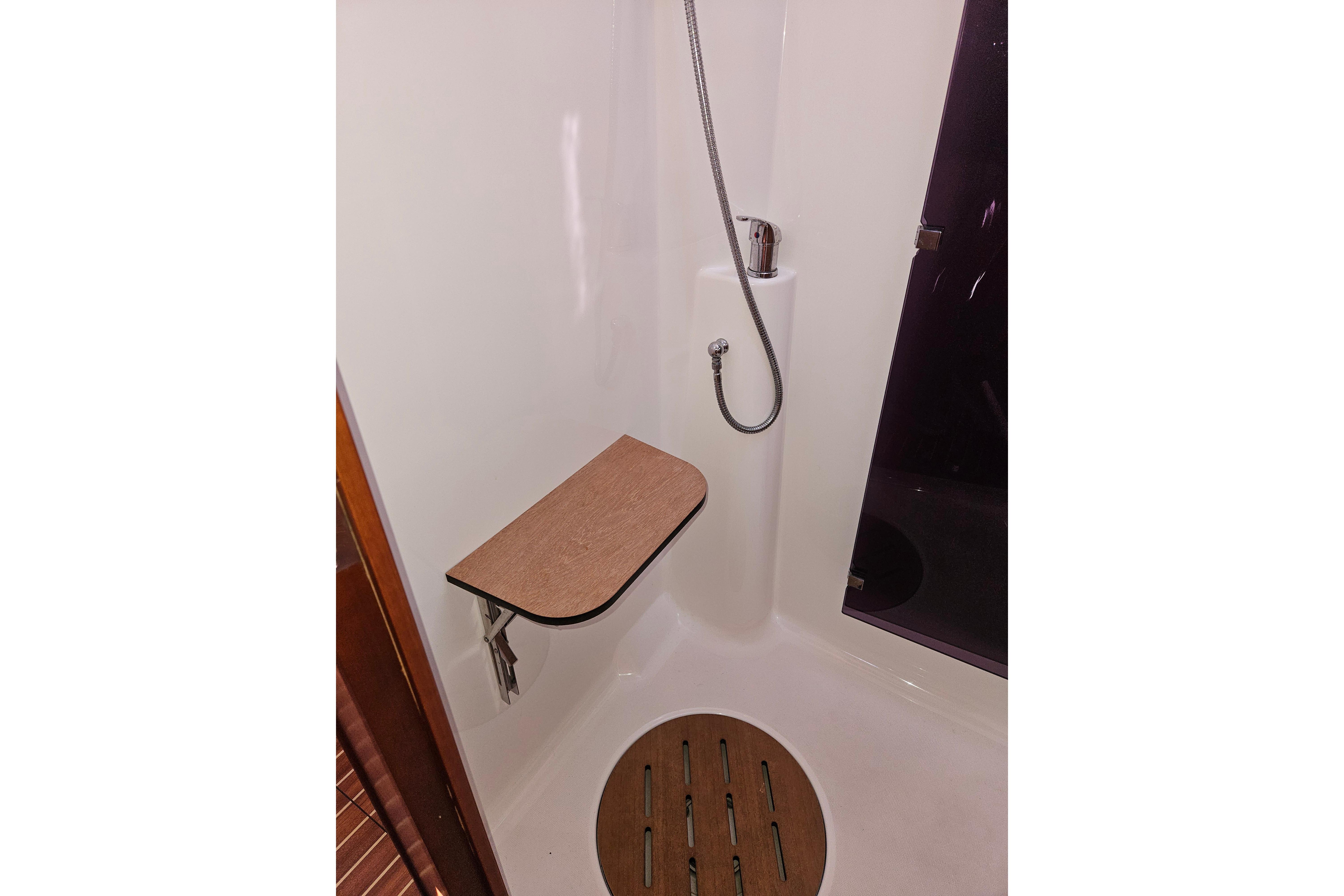 - Saloon banquette: L-shaped banquette on starboard.