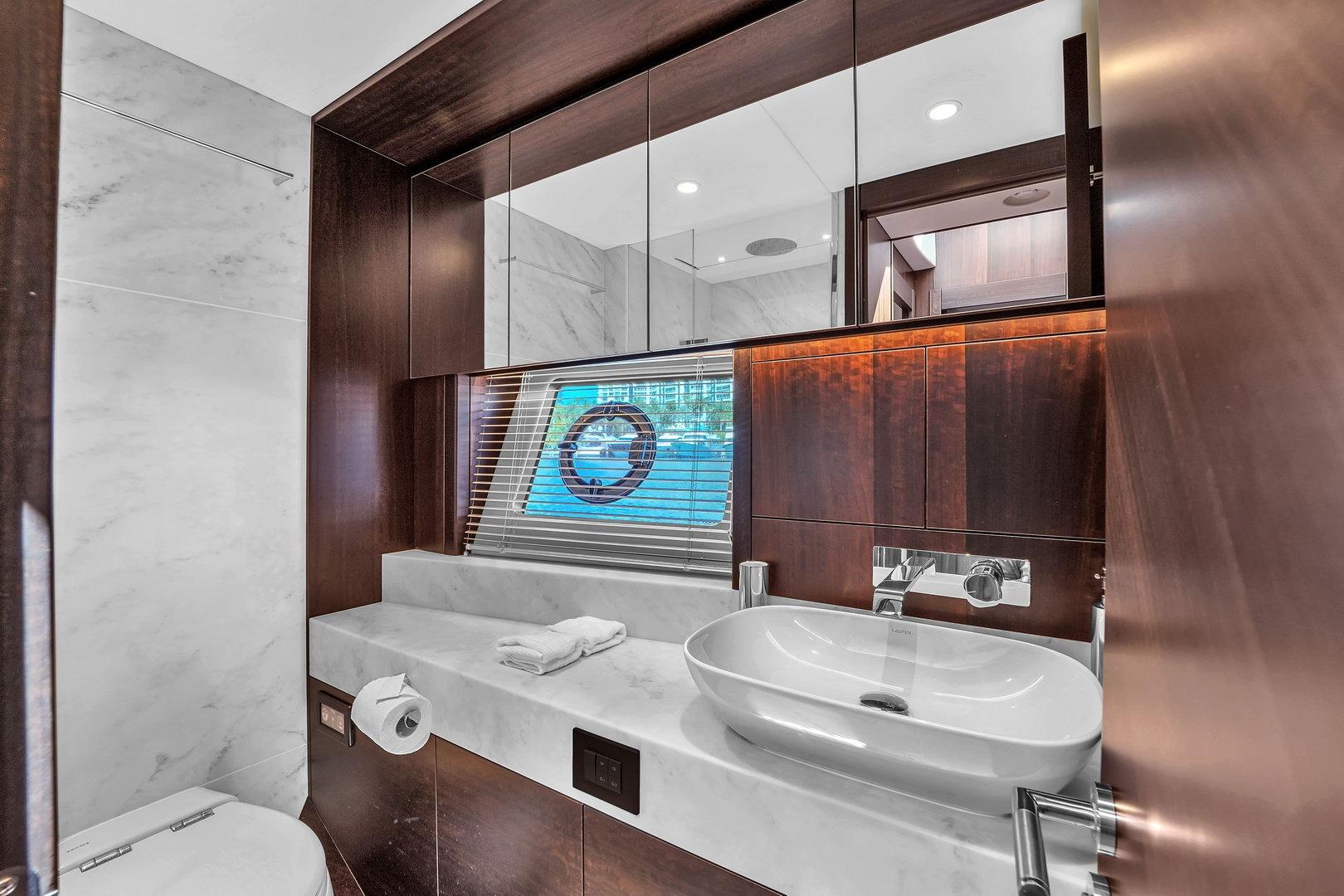 The master cabin affords owners with flexibility to use their private space however they wish. Upon entering, a new ‘Grand Master’ layout delivers deep comfortable companion seating outboard, positioned opposite an expansive sideboard with stowage. On the portside, adjacent to the king bed, owners can then opt for a chaise longue, breakfast table and seating, vanity table with additional drawers or another comprehensively equipped sideboard. What’s more, the master cabin benefits from its own private bar complete with glass stowage and refrigeration. This exceptional layout strikes a perfect balance between ample social spaces and generous private quarters.