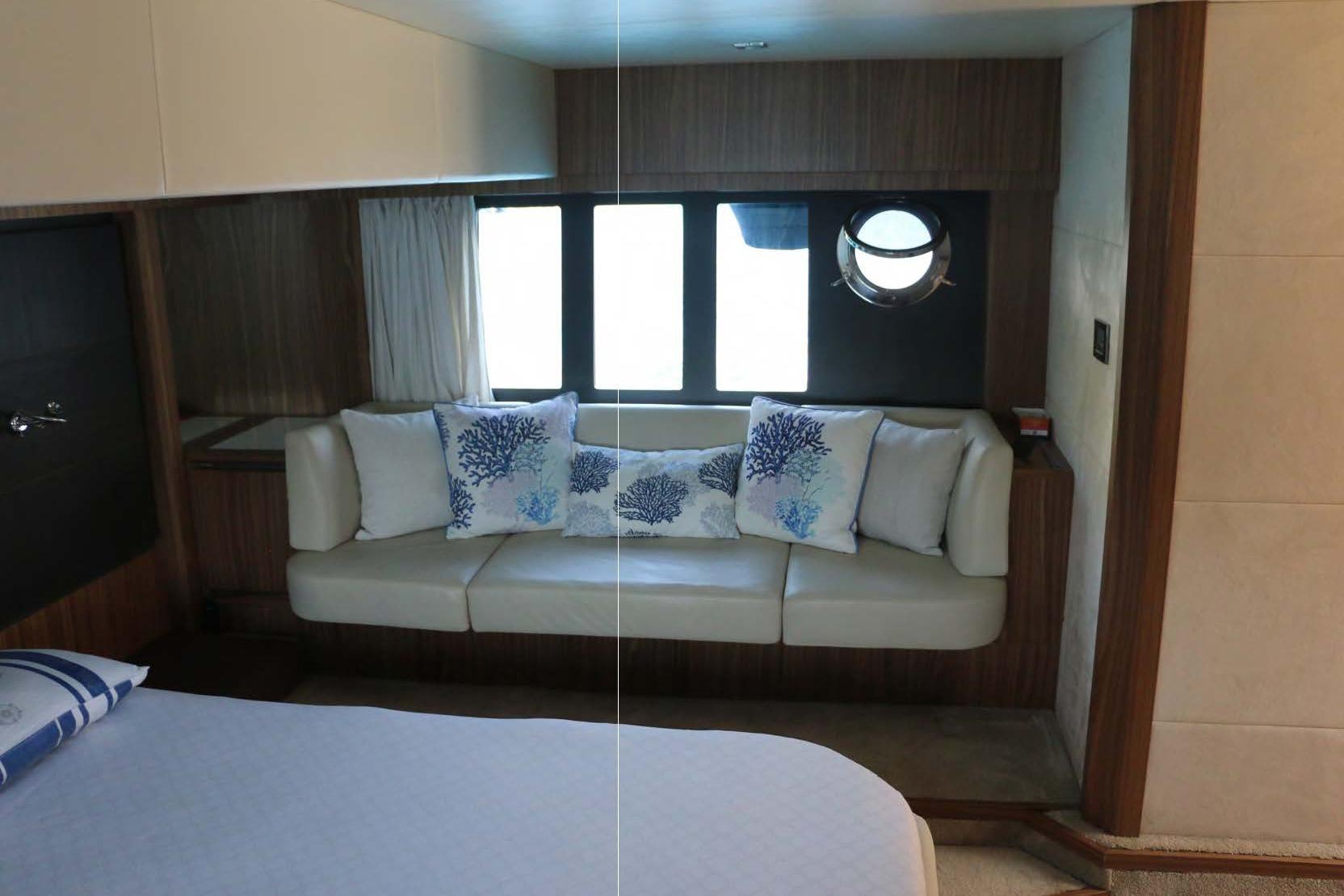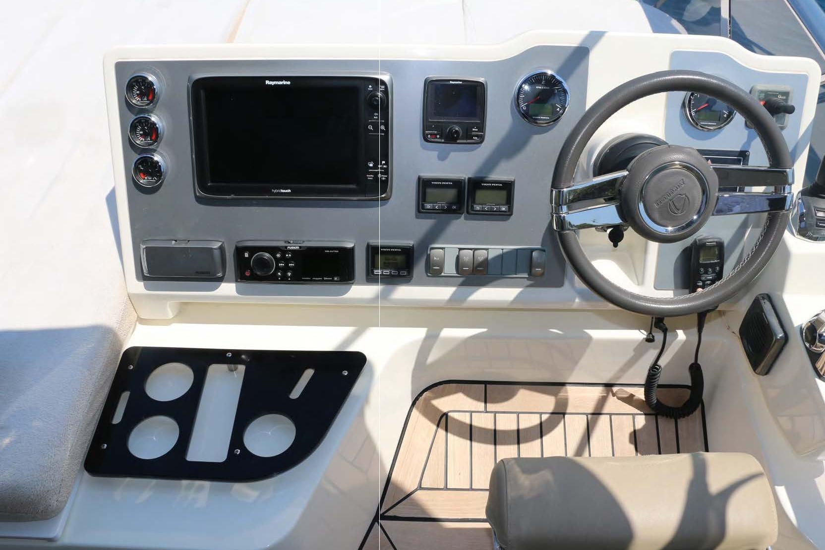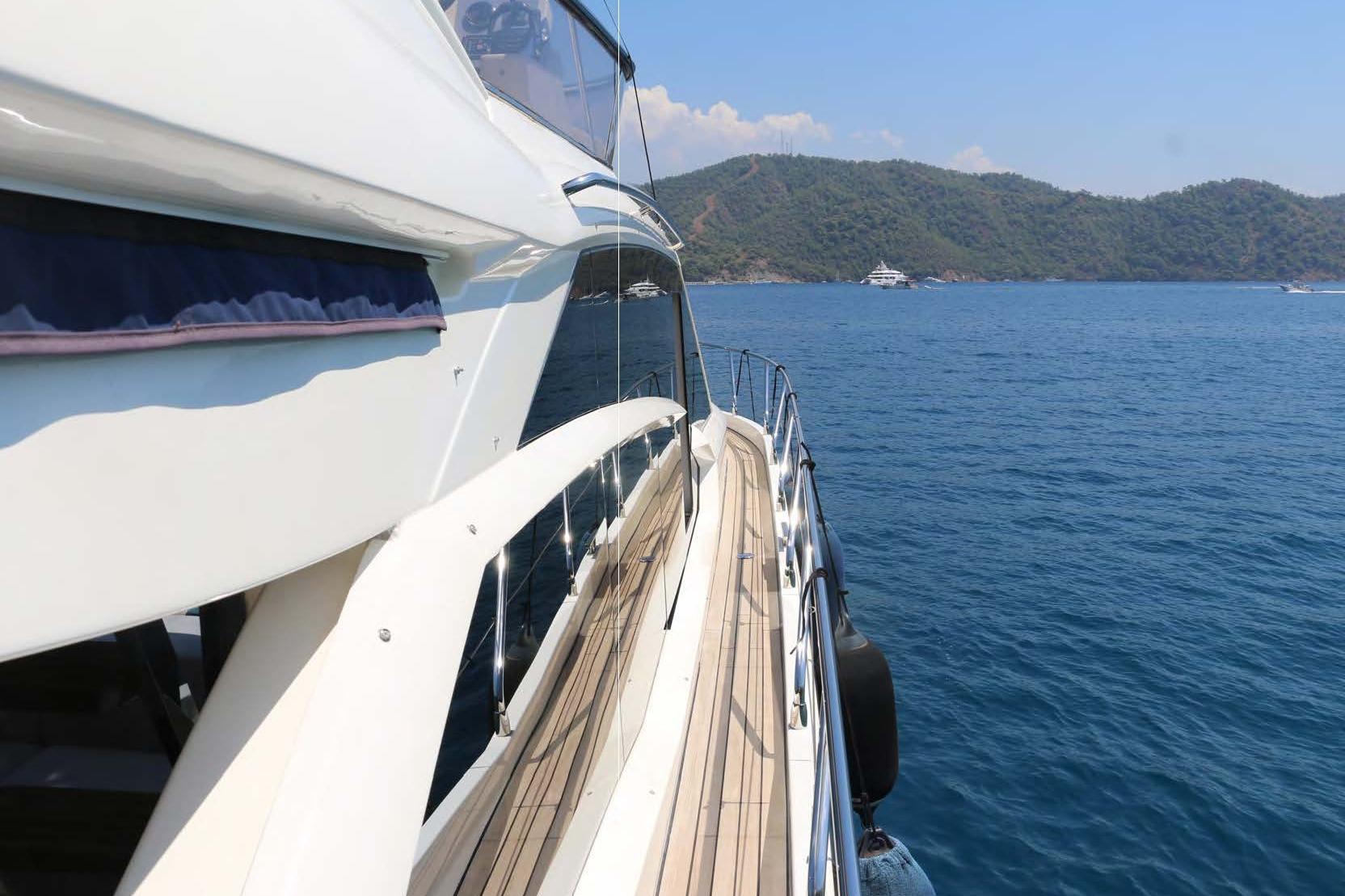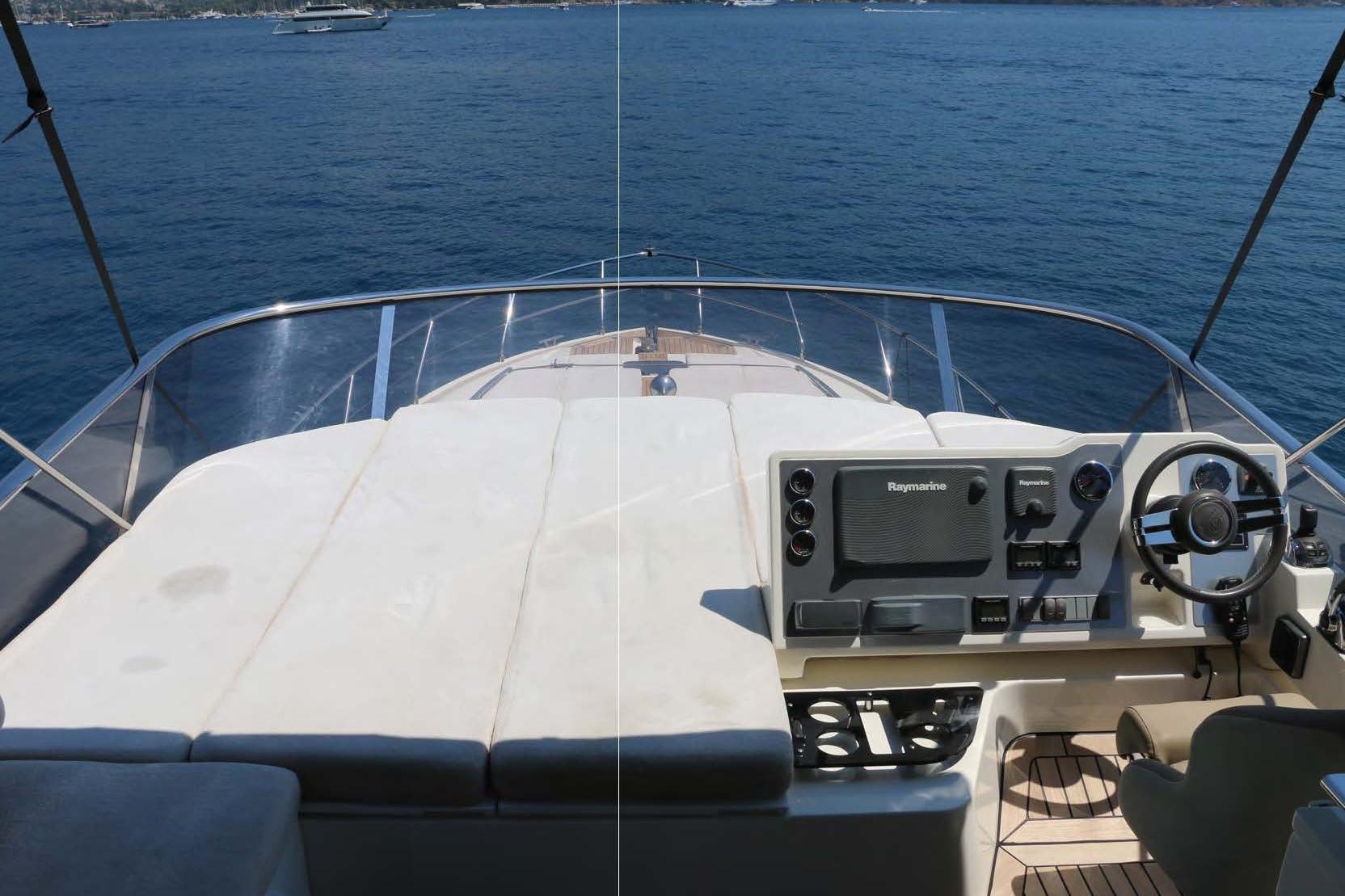The yacht is equipped with three Raymarine HybridTouch navigation displays, bow thruster, watermaker, air conditioning, hydraulic swim platform, and a third control station, making her ideal for comfortable cruising and easy maneuverability.