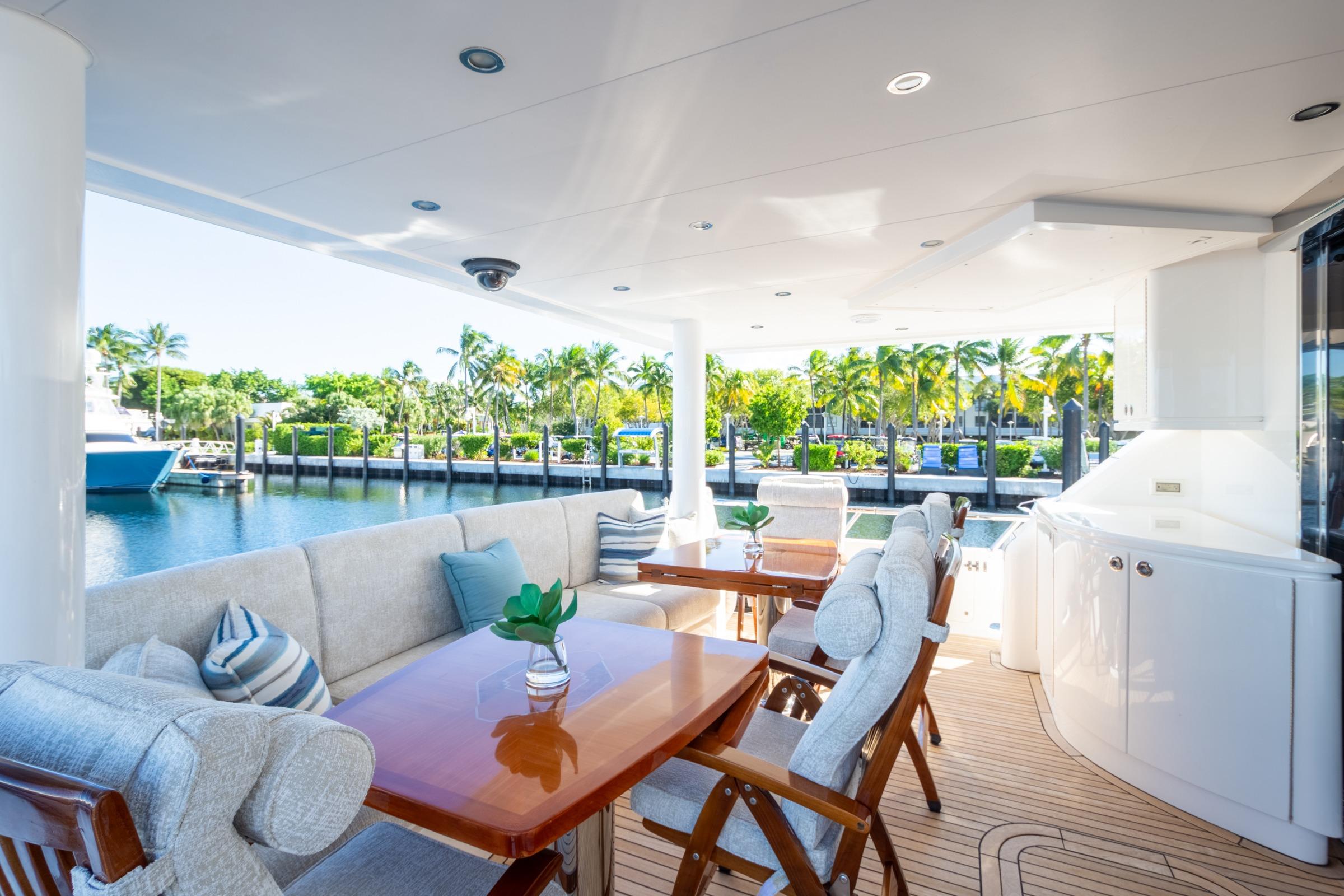 The aft deck is designed for entertaining, featuring a large dining table that seats ten guests and can be divided and lowered for casual cocktail gatherings. Amenities include an ice maker, refrigerator, and a fold-down flat-screen TV overhead, with a staircase to the bridge deck located on the starboard side.