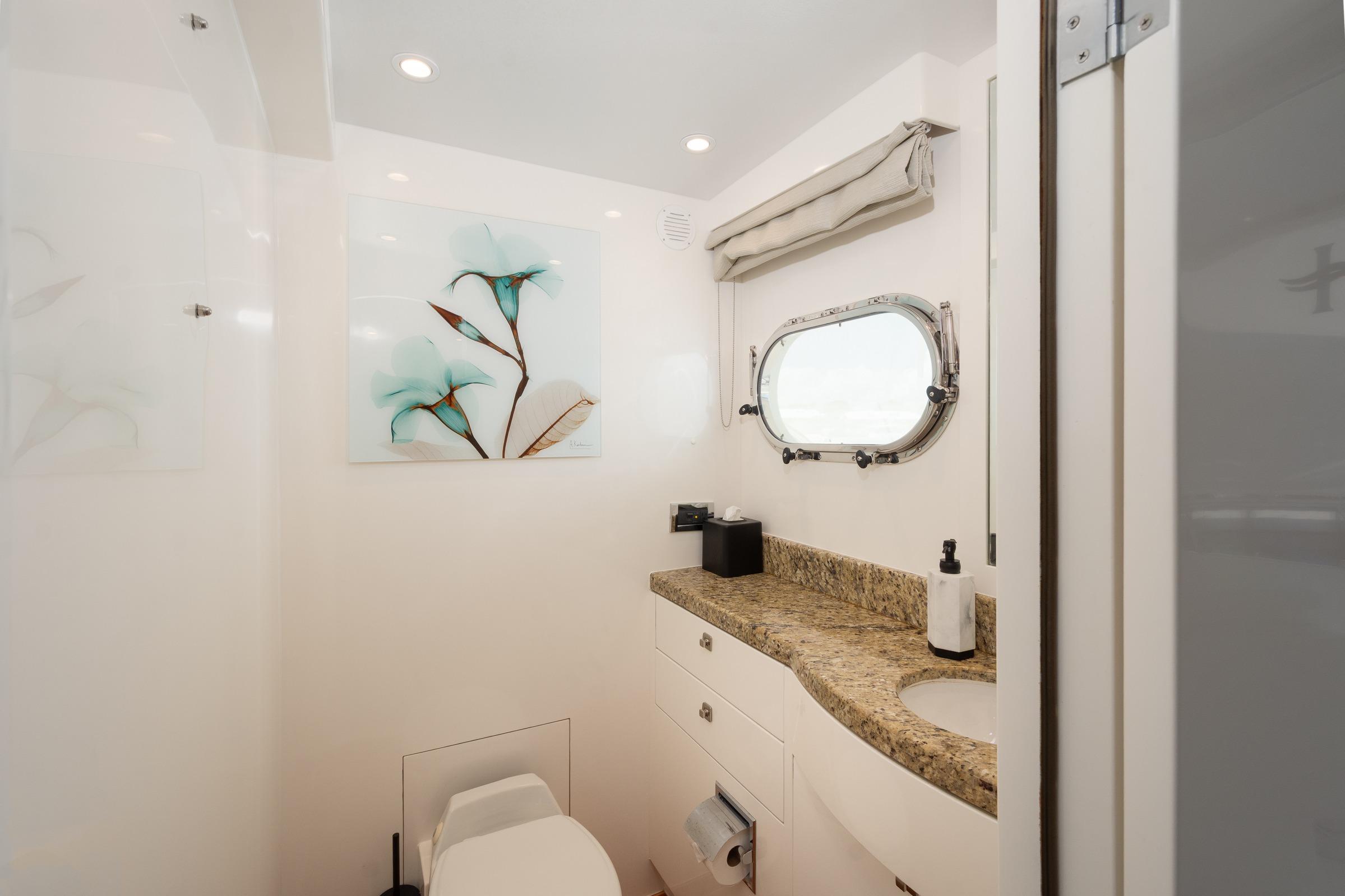 - Port & Starboard Guest Cabins: Each features twin berths that convert to queen configurations and include private baths.