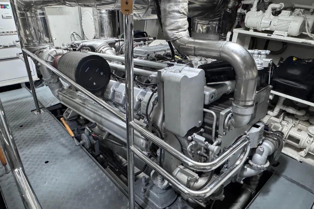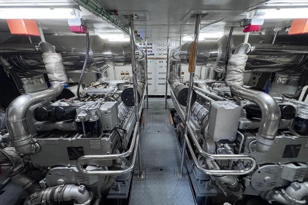 The yacht is powered by twin MTU 16V 2000 M90 engines, a proven and reliable configuration widely used in yachts of this class.