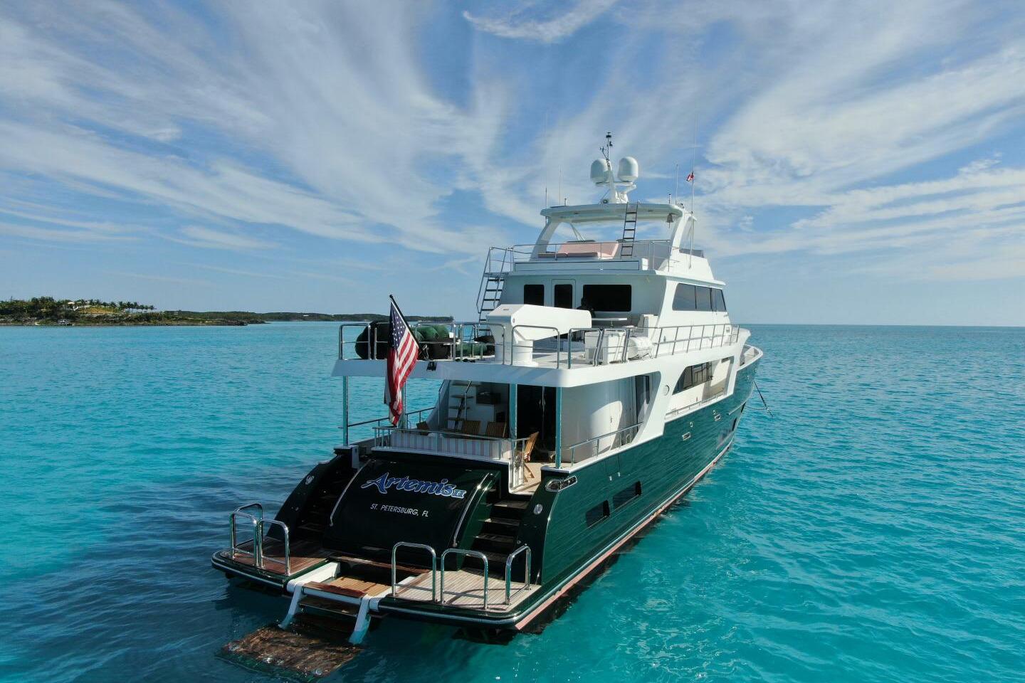 This 2024 90 Marlow Yacht - Artemis II, is arguably one of the best looking boats on the water, a real head turner that graces every dock with timeless elegance and a sporty pedigree. The 90V was designed for both a quick jaunt to a far off destination or a slow cruise between islands in the Bahamas. With an on deck Master and below deck master there are options for all preferences. Three additional guest staterooms, all having en-suite heads, have enough accommodations to bring the whole family. Crew accommodations in this vessels size range are second to none with a generous Queen bed Captains Quarters in the Aft pilothouse and three other bunks located below deck. No expense was spared in the outfitting of this boat in an effort to make life on the water easy for the crew and comfortable for the guests.