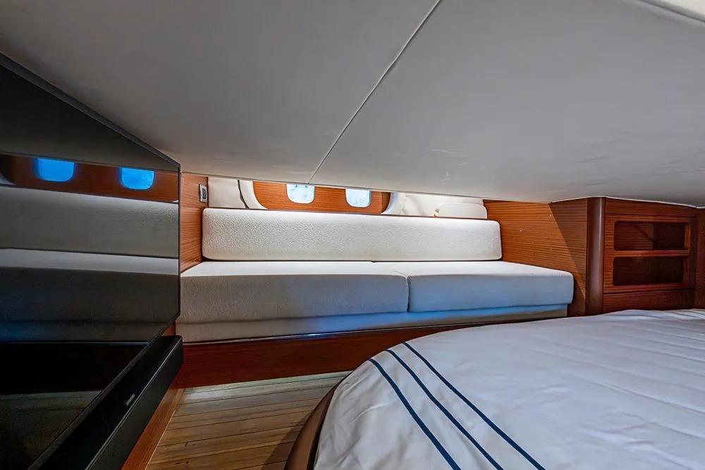This vessel is presented in excellent condition and is ready for immediate cruising. The yacht features a striking high-gloss garnet metallic hull and a rare forward settee that converts into an additional berth, providing flexible accommodations for guests.