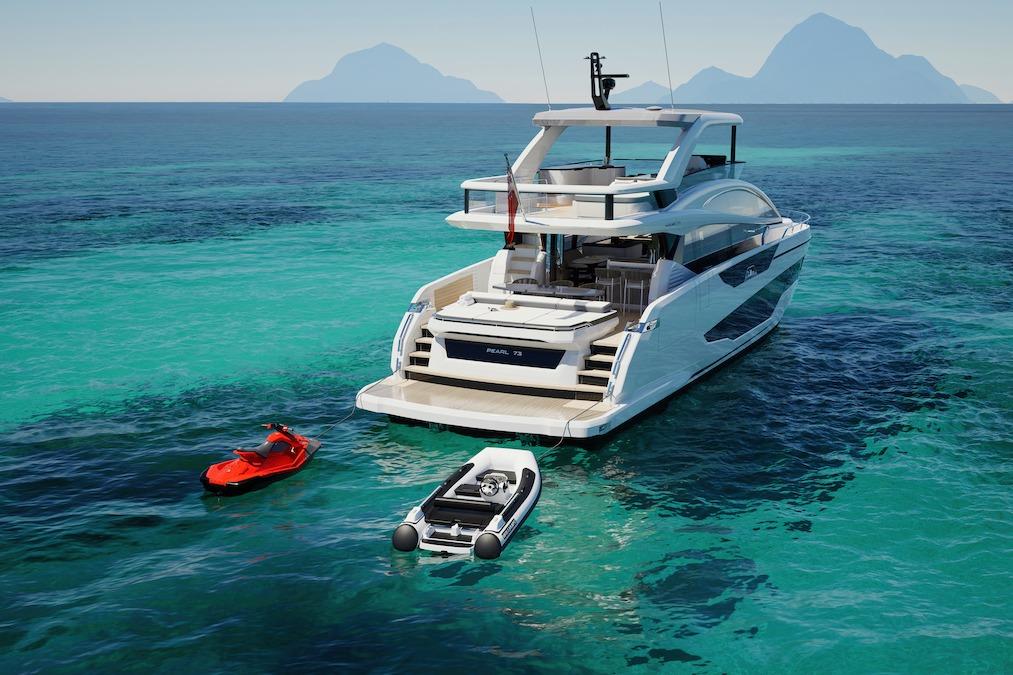 The Pearl 73 includes a spacious garage designed for water toys and tenders.