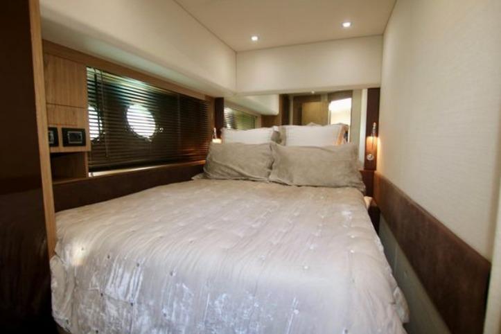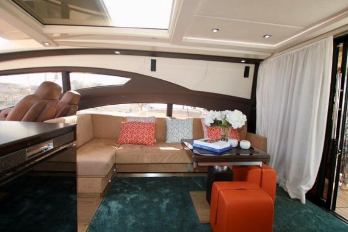 Inside, the salon is bright and airy, with a fixed skylight and a full-width sliding hatch that opens the space to sea breezes. It includes a convertible table for six, an L-shaped sofa, and a fully equipped bar area with a sink, cooktop, retractable extractor, and beverage refrigerator. The helm station within the salon features two electrically adjustable seats. The galley on the lower deck is fitted with a full-size refrigerator with freezer, oven, and sink.