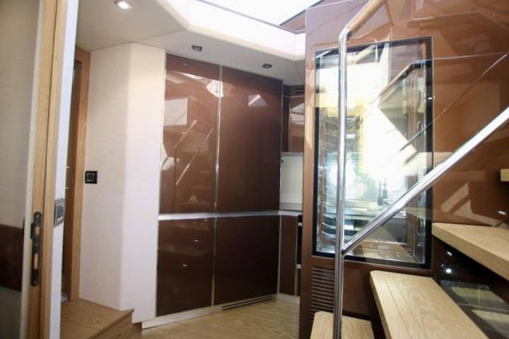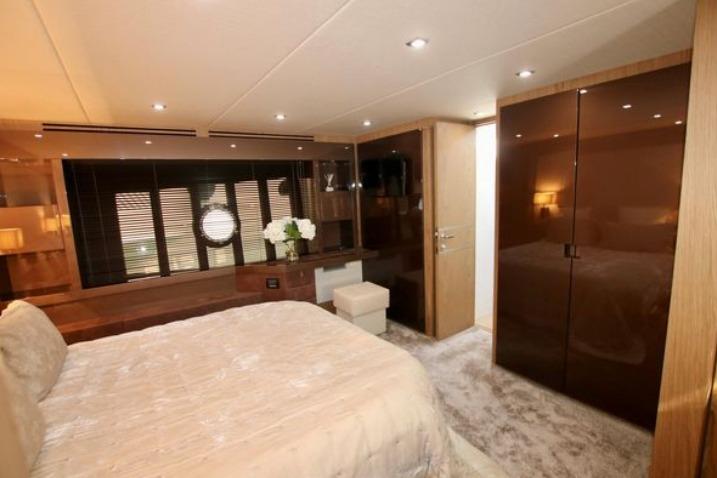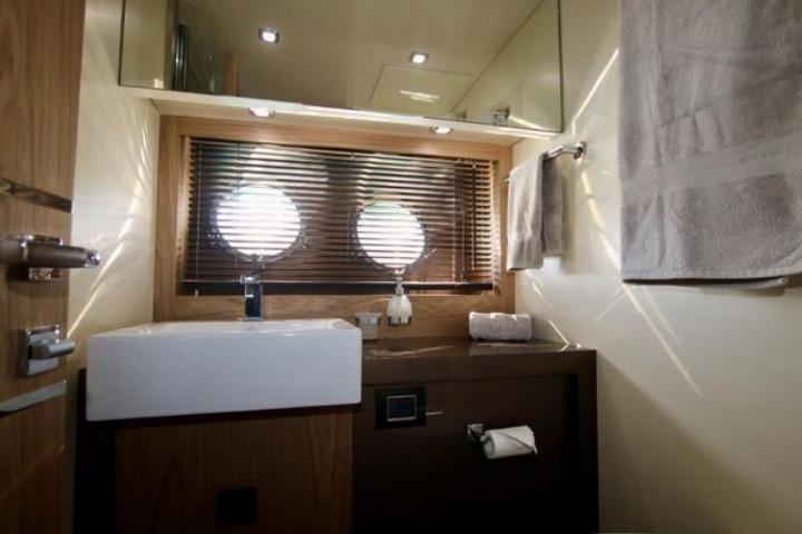 Accommodation on the lower deck includes three cabins: a spacious master amidships, a VIP cabin at the bow, and a smaller cabin suitable for children. Each cabin has an en-suite bathroom and double beds, with the children’s bathroom accessible from the main hallway. A crew cabin with two beds, a bathroom, and washer-dryer is located between the living area and engine room, accessible via a stern door or hatch from the aft deck.