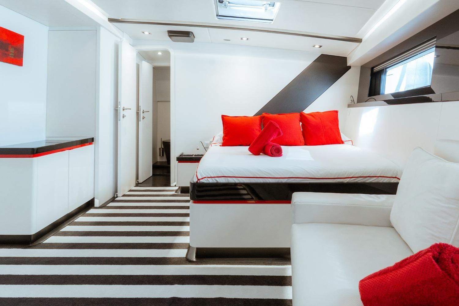 Her lateral ballasts mean she can sail almost flat and a lifting keel permits entry into a variety of ports and anchorages. Her large cockpit with 2 tables, each capable of seating up to 12, is ideal for relaxed dinners on board, and the ample sunbathing space permits owners and guests to soak up the rays in total comfort. Her deck saloon has stunning 360° panoramic views.