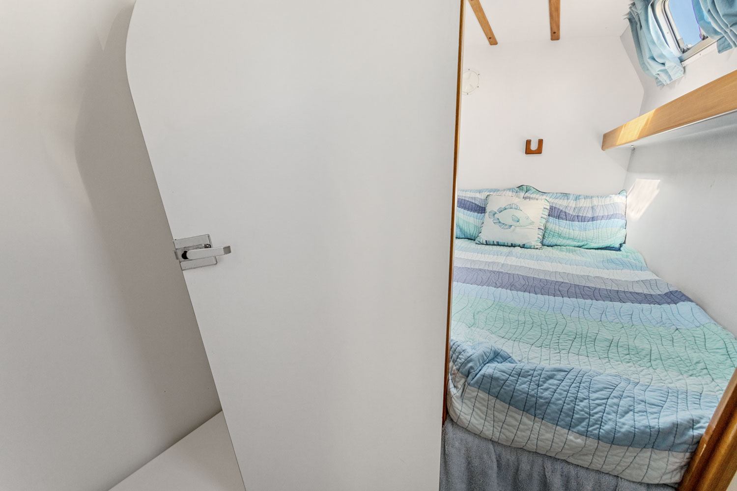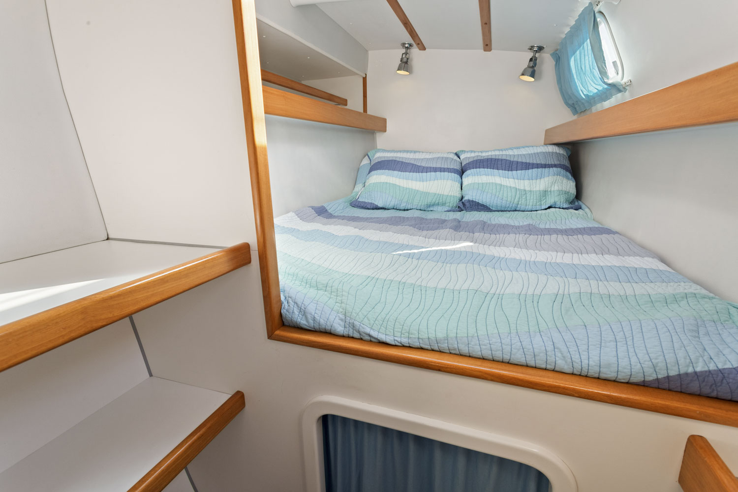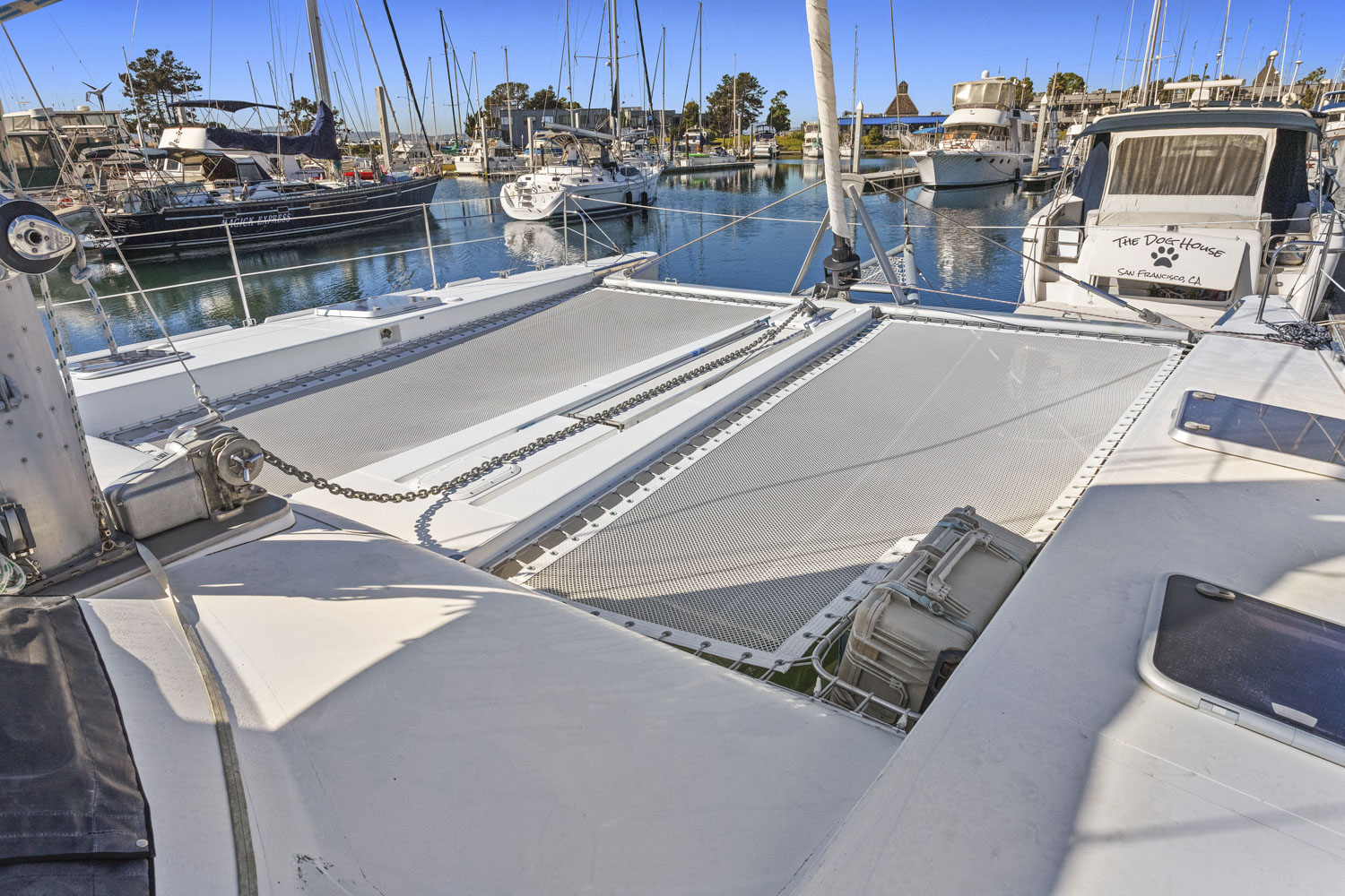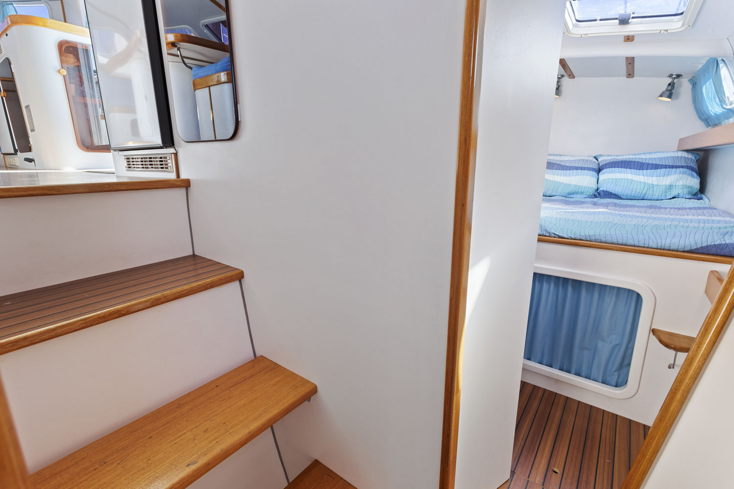 She is set up with large queen berths aft, central heads, and two large centrally located showers in each hull. Forward in each hull are v-berths which can be set up as singles, or arranged for "over and under bunkbeds."