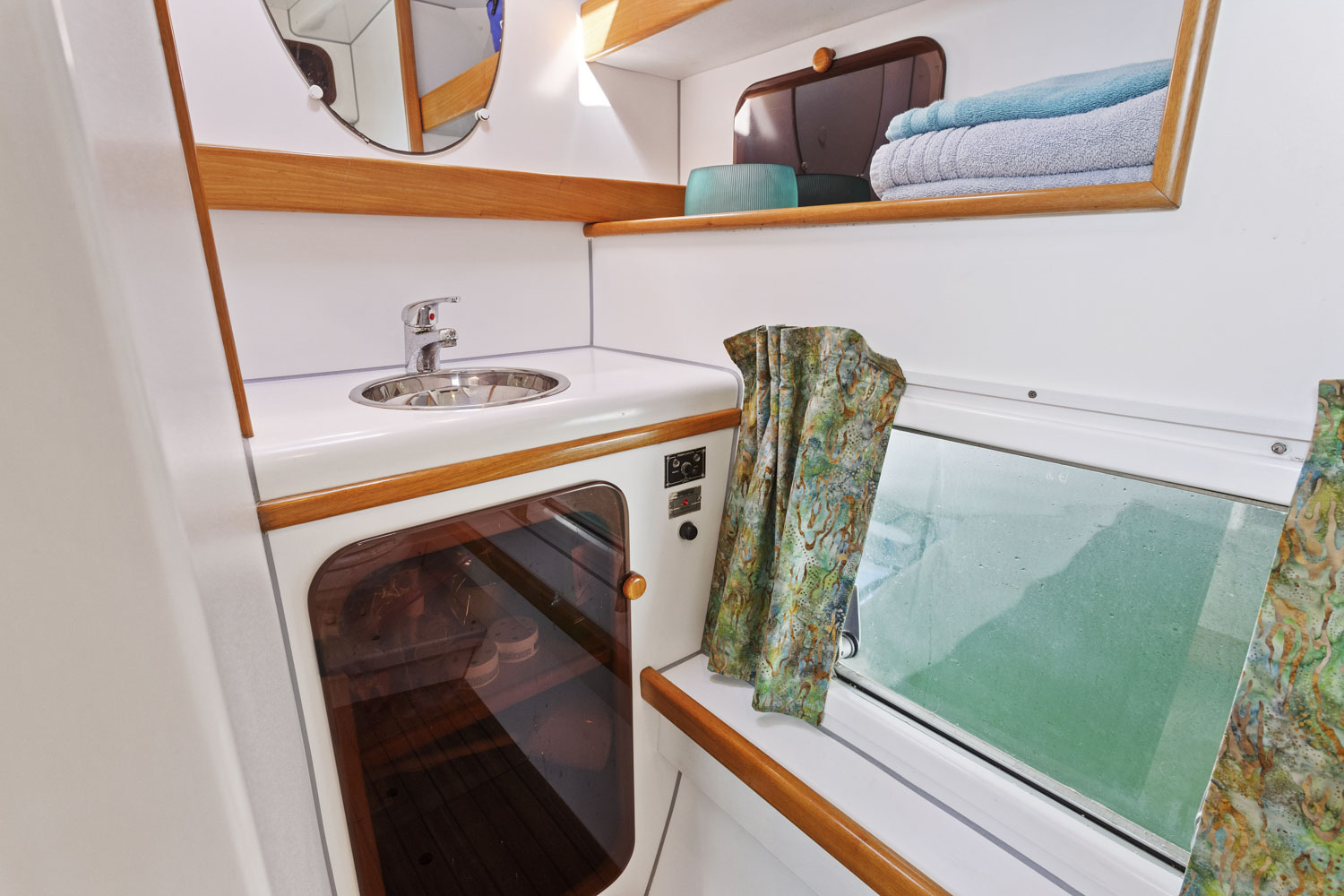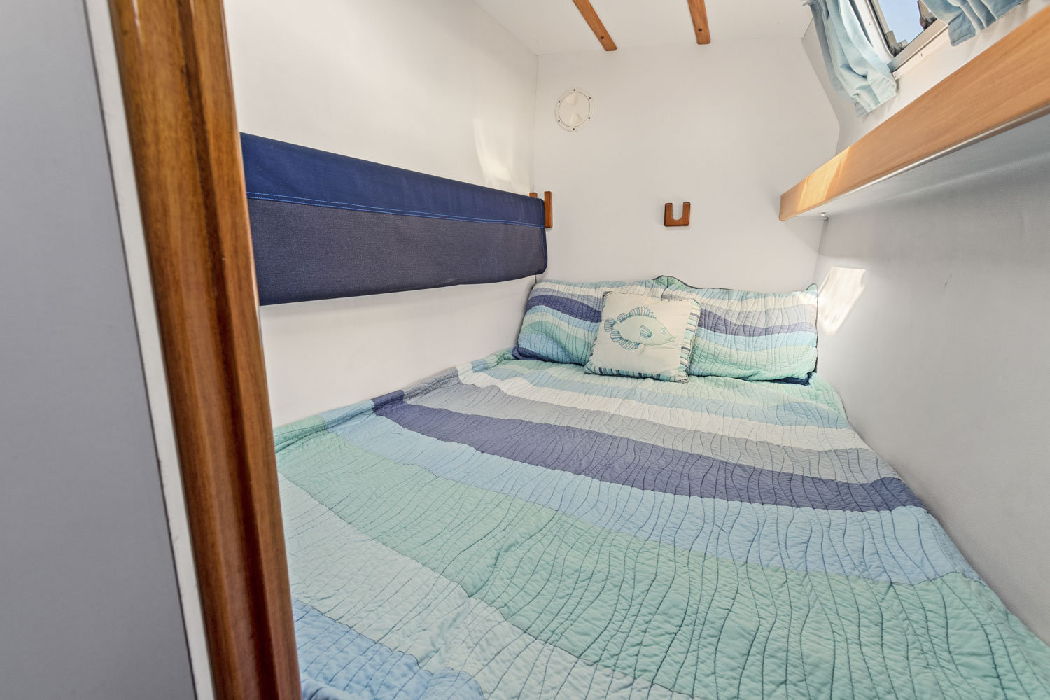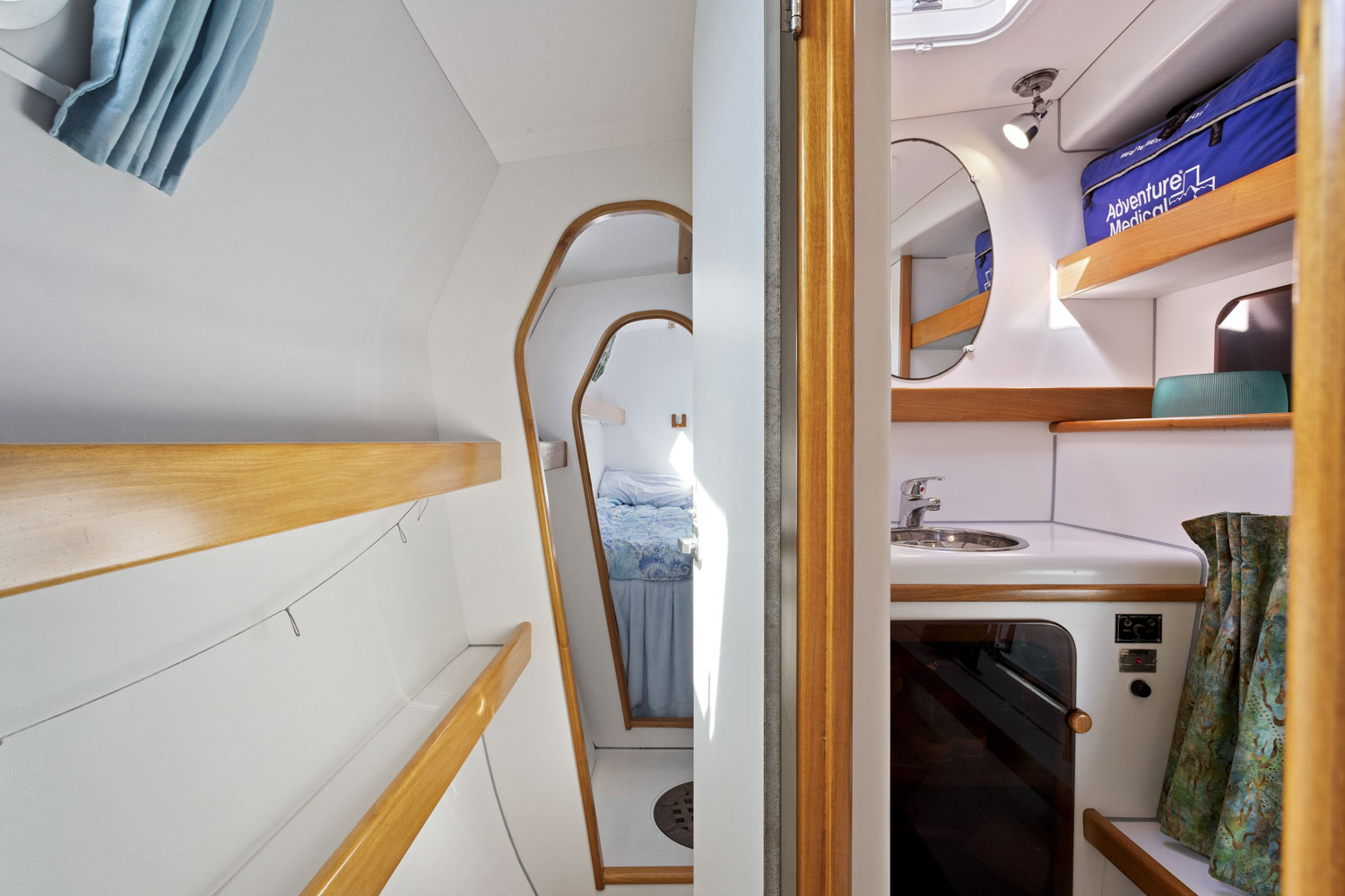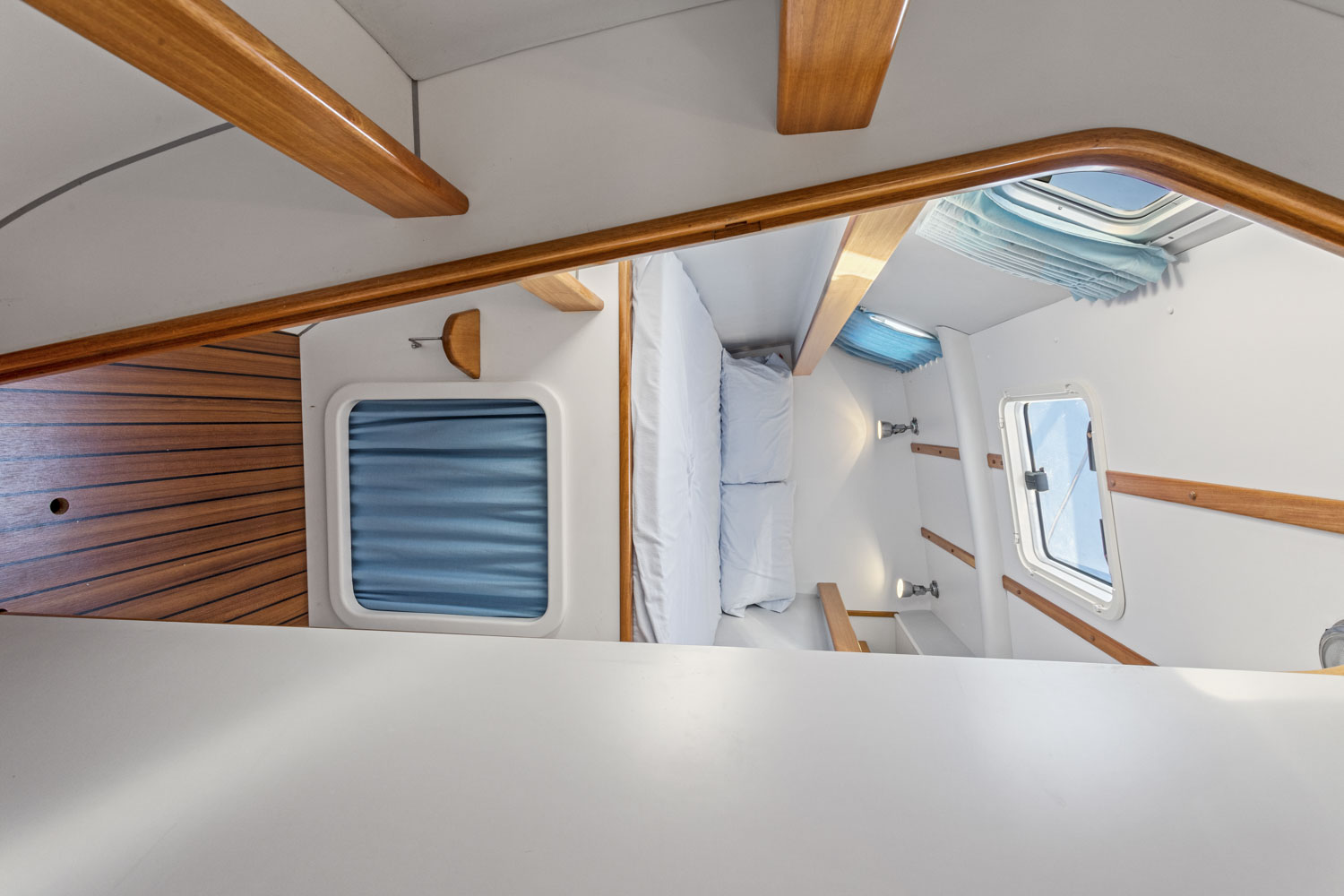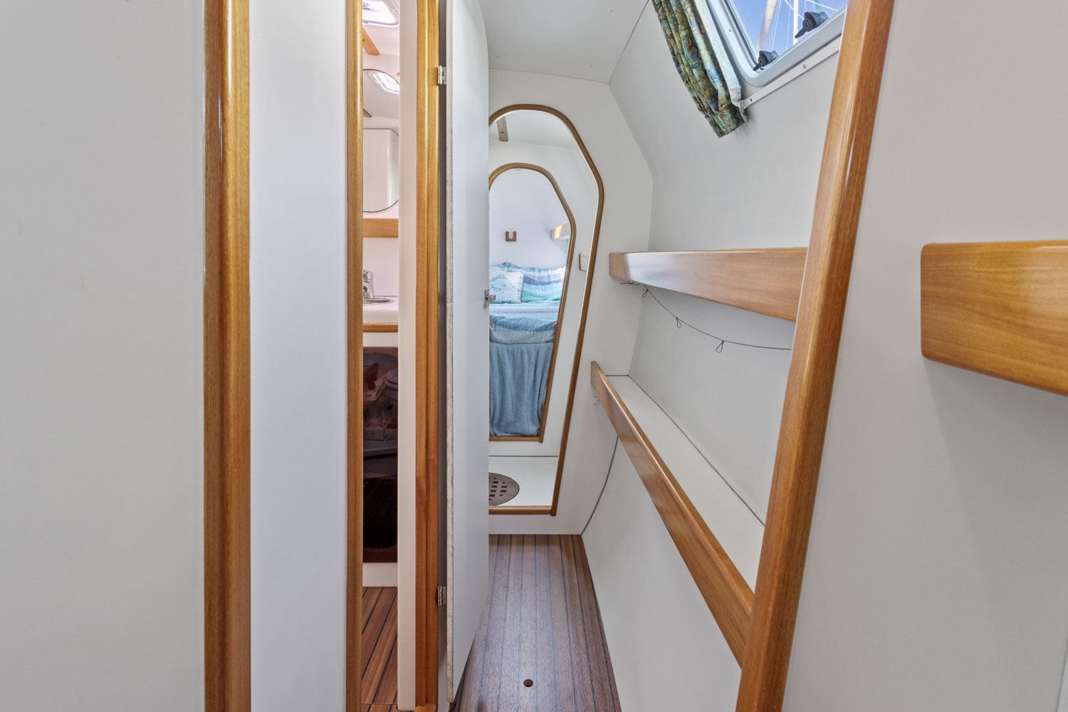 She is set up with large queen berths aft, central heads, and two large centrally located showers in each hull. Forward in each hull are v-berths which can be set up as singles, or arranged for "over and under bunkbeds."