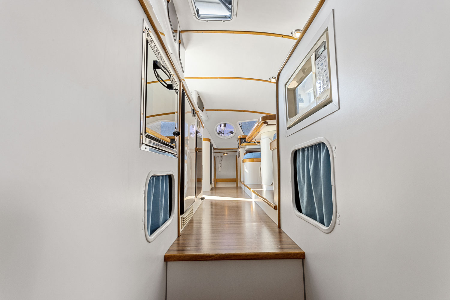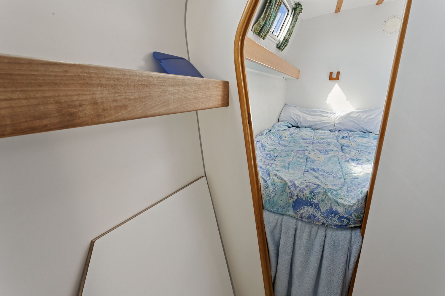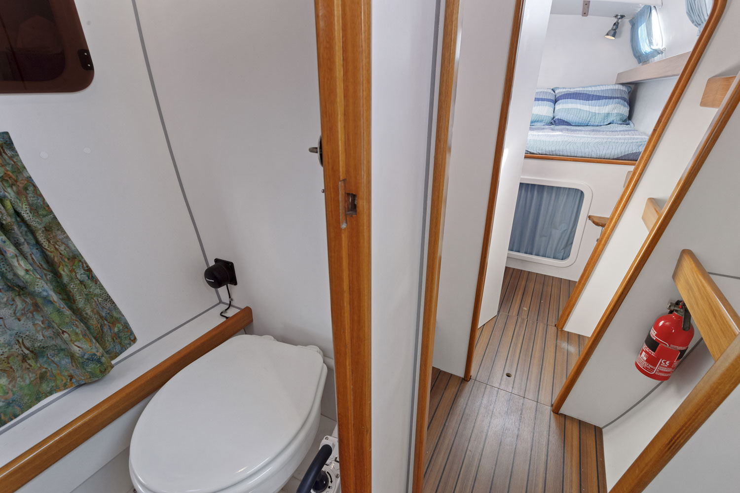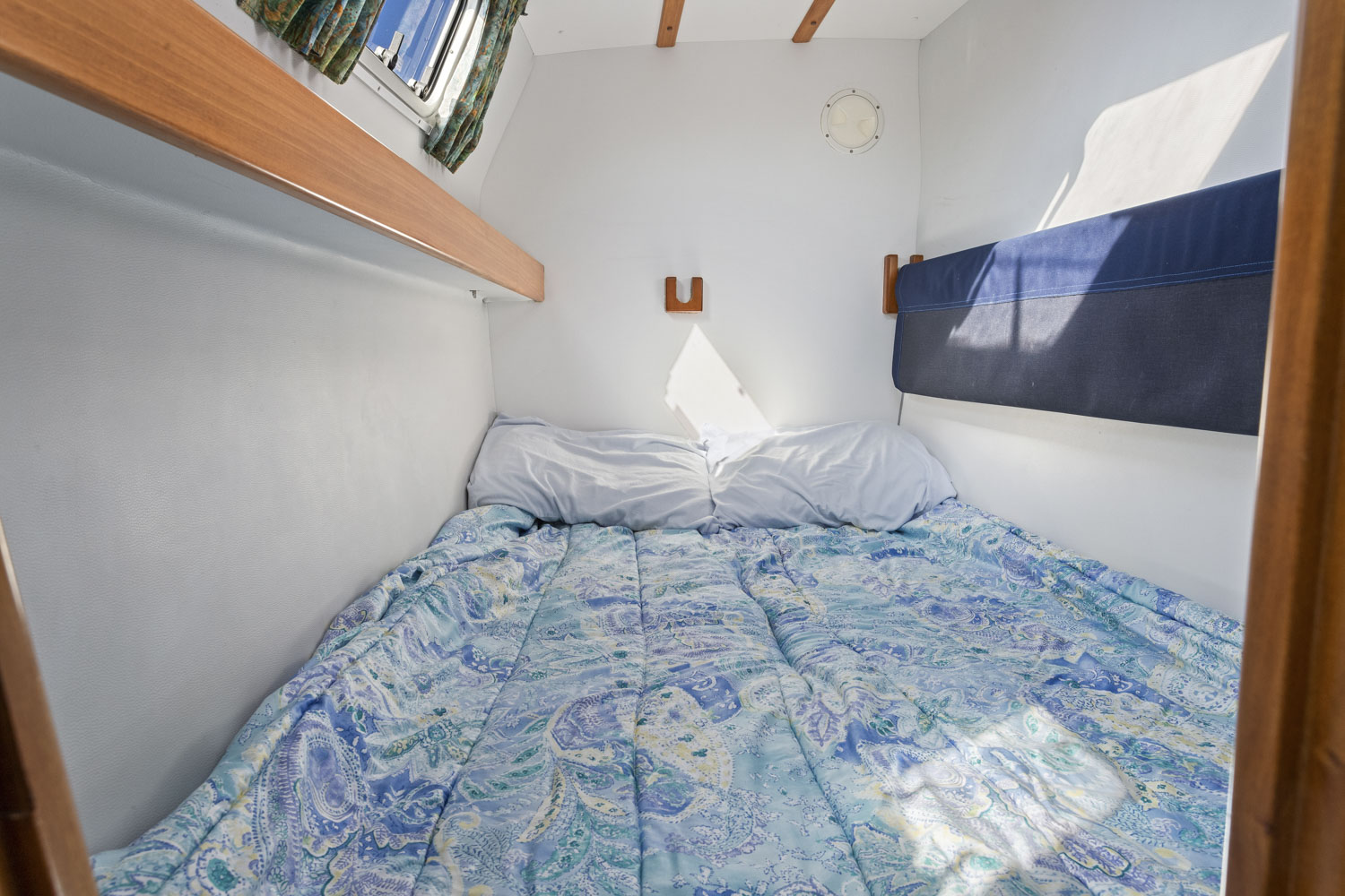 She is set up with large queen berths aft, central heads, and two large centrally located showers in each hull. Forward in each hull are v-berths which can be set up as singles, or arranged for "over and under bunkbeds."