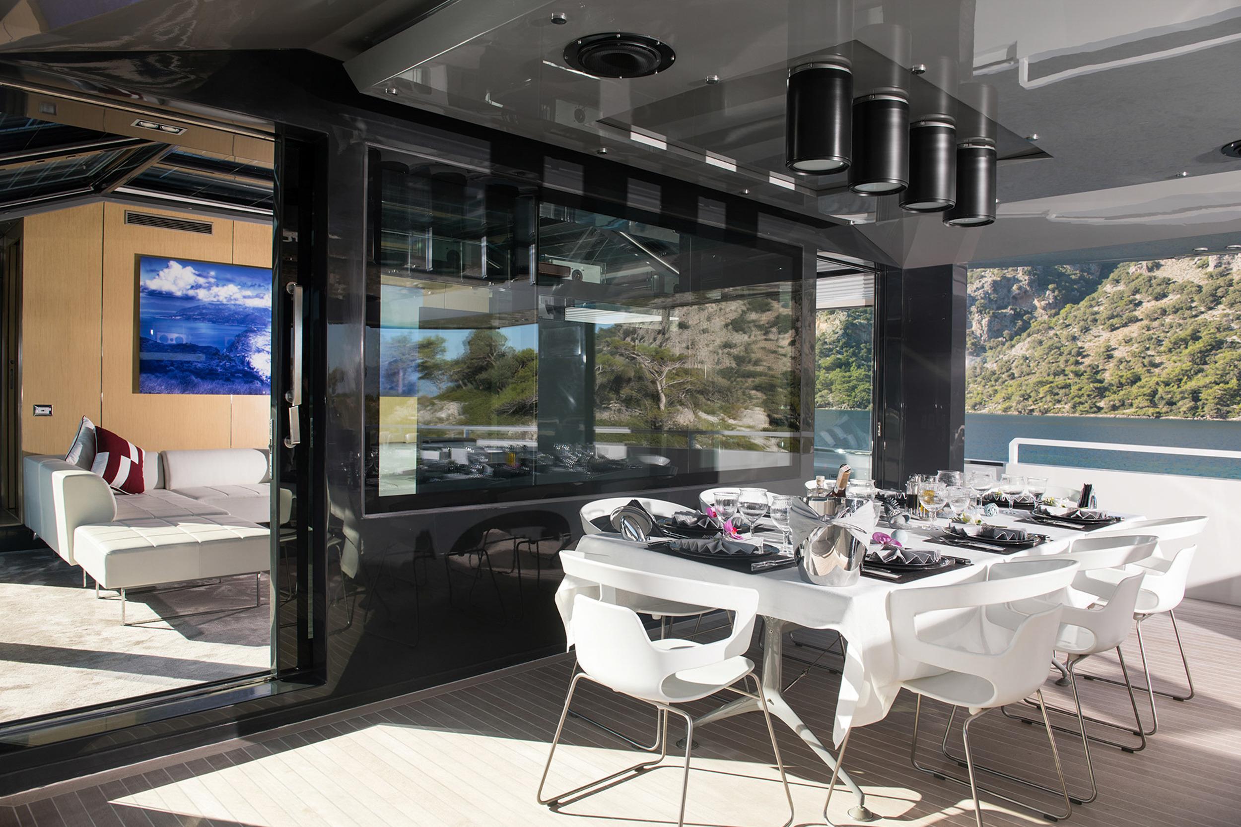 The upper deck offers a fabulous lounging and a bar area, as well as a comfortable dining table for 12 guests. Upper deck midships there is a family room offering panoramic views and cinema facilities