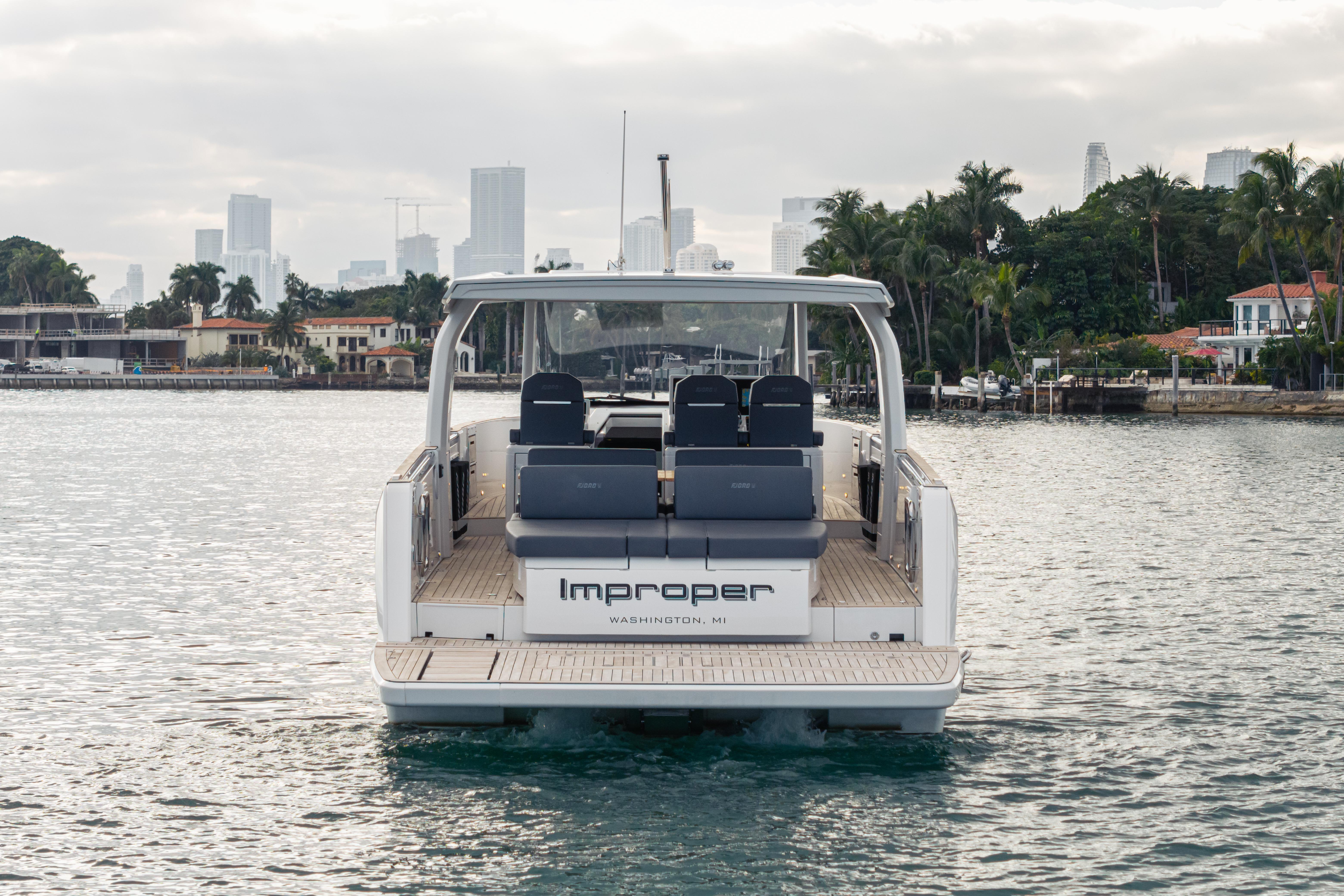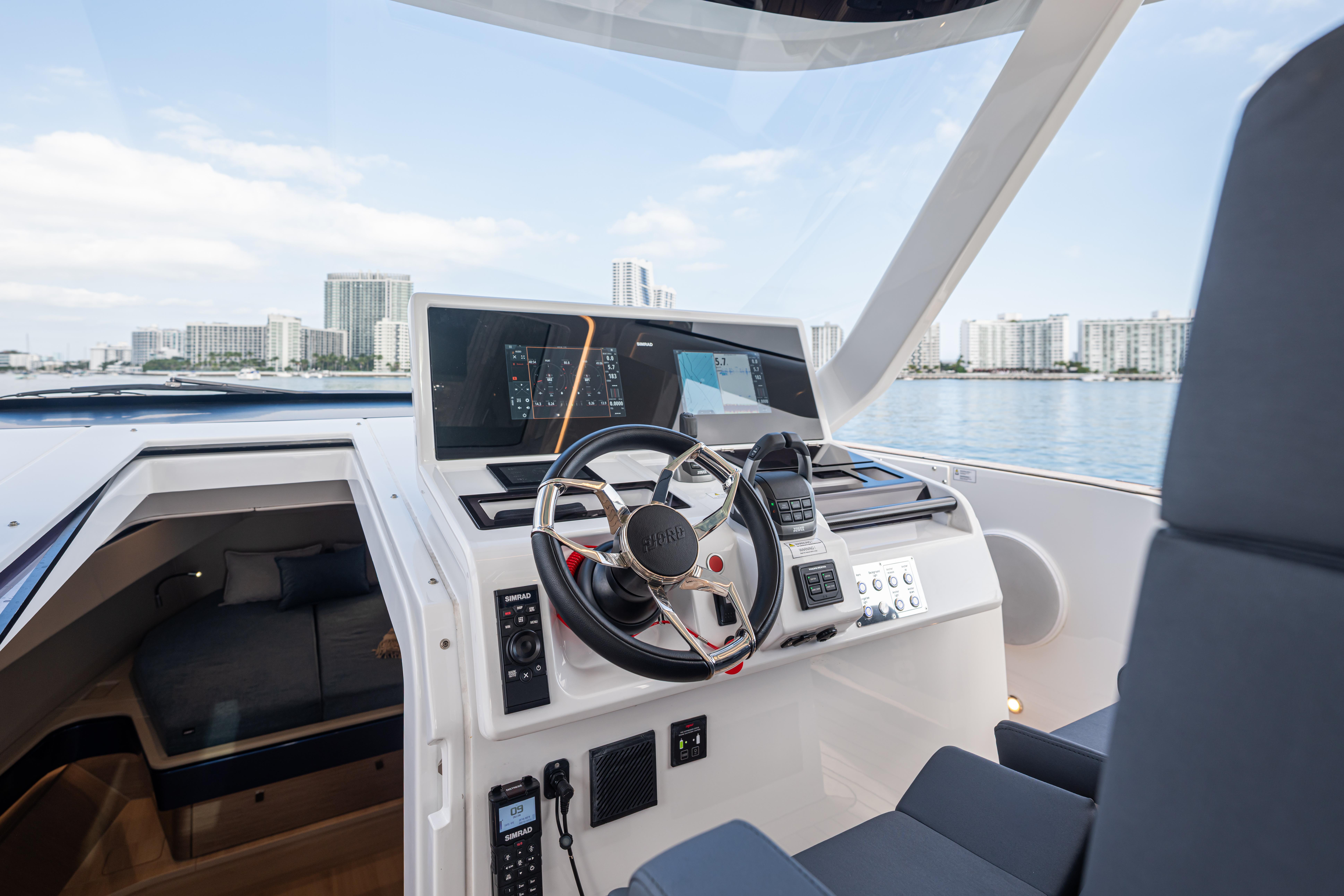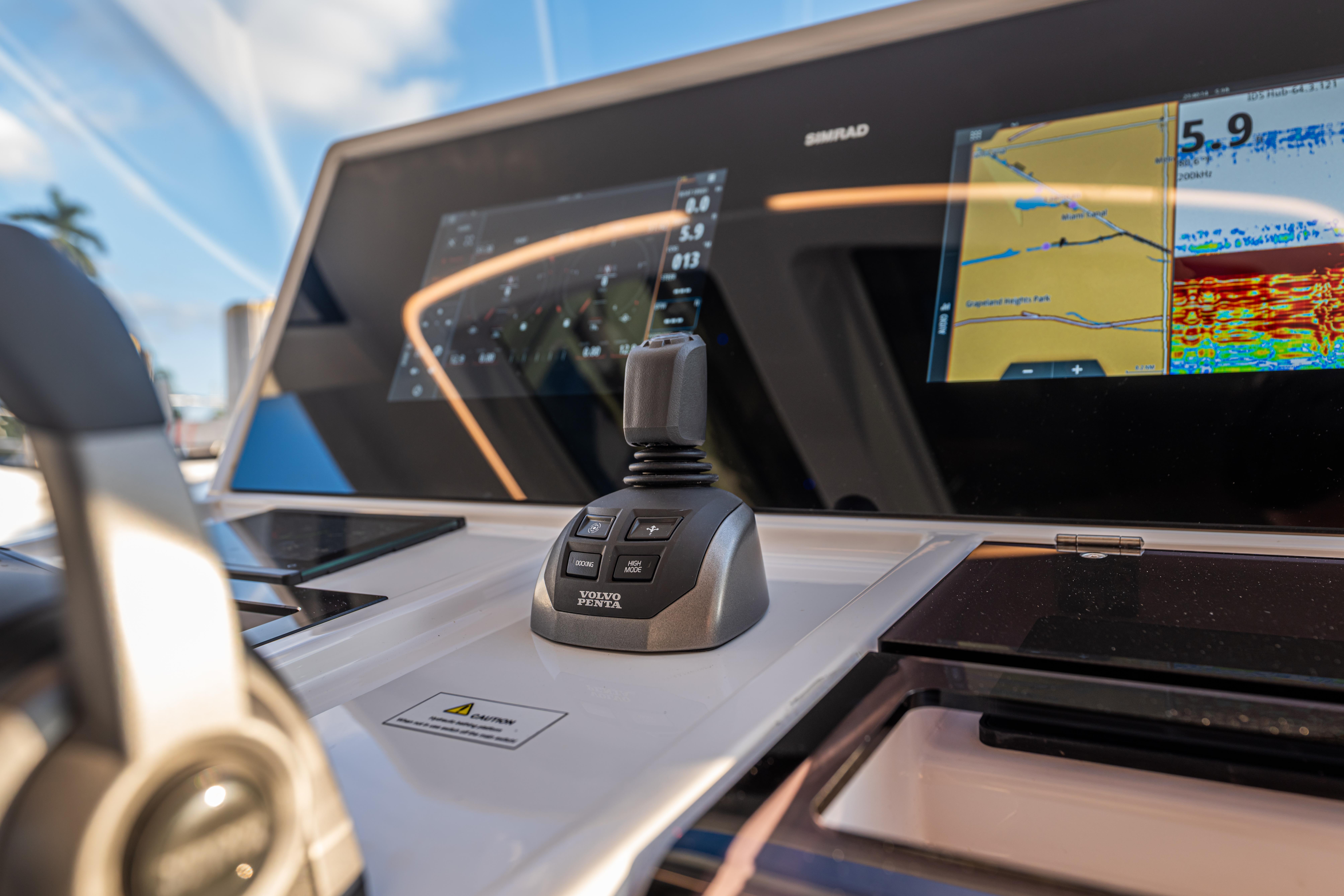 High performance Hull design. Superior Sandwich hull construction with a robust inner grid. Volvo Joystick control. Customizable deck layout and lower deck layouts. Large T-top. Large 2nd cabin. Hull windows through out. All glass bridge. Quick Gyro, Volvo active trim assist, High low platform. Galley up with additional refrigeration below. Roughly 38 engine hours.