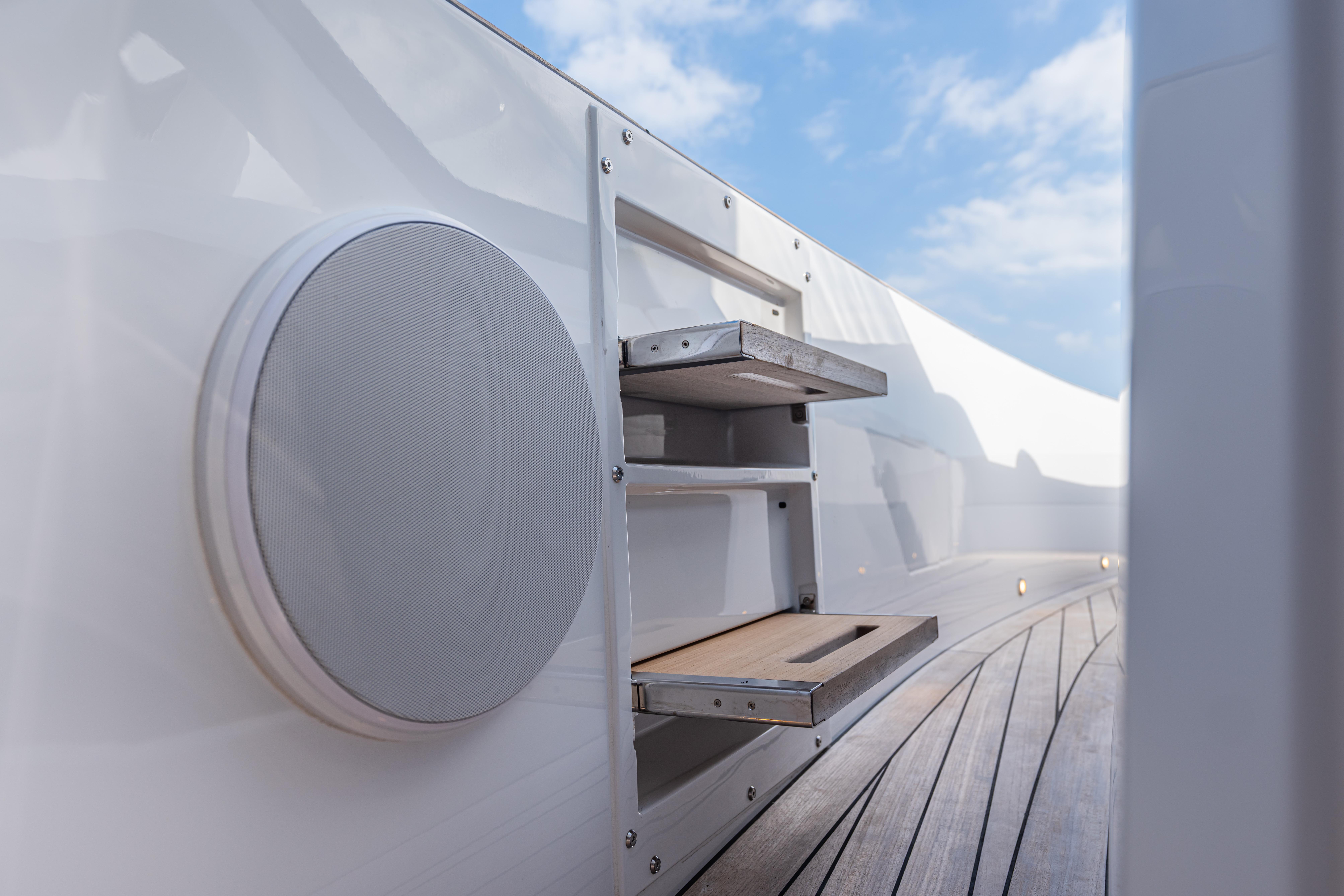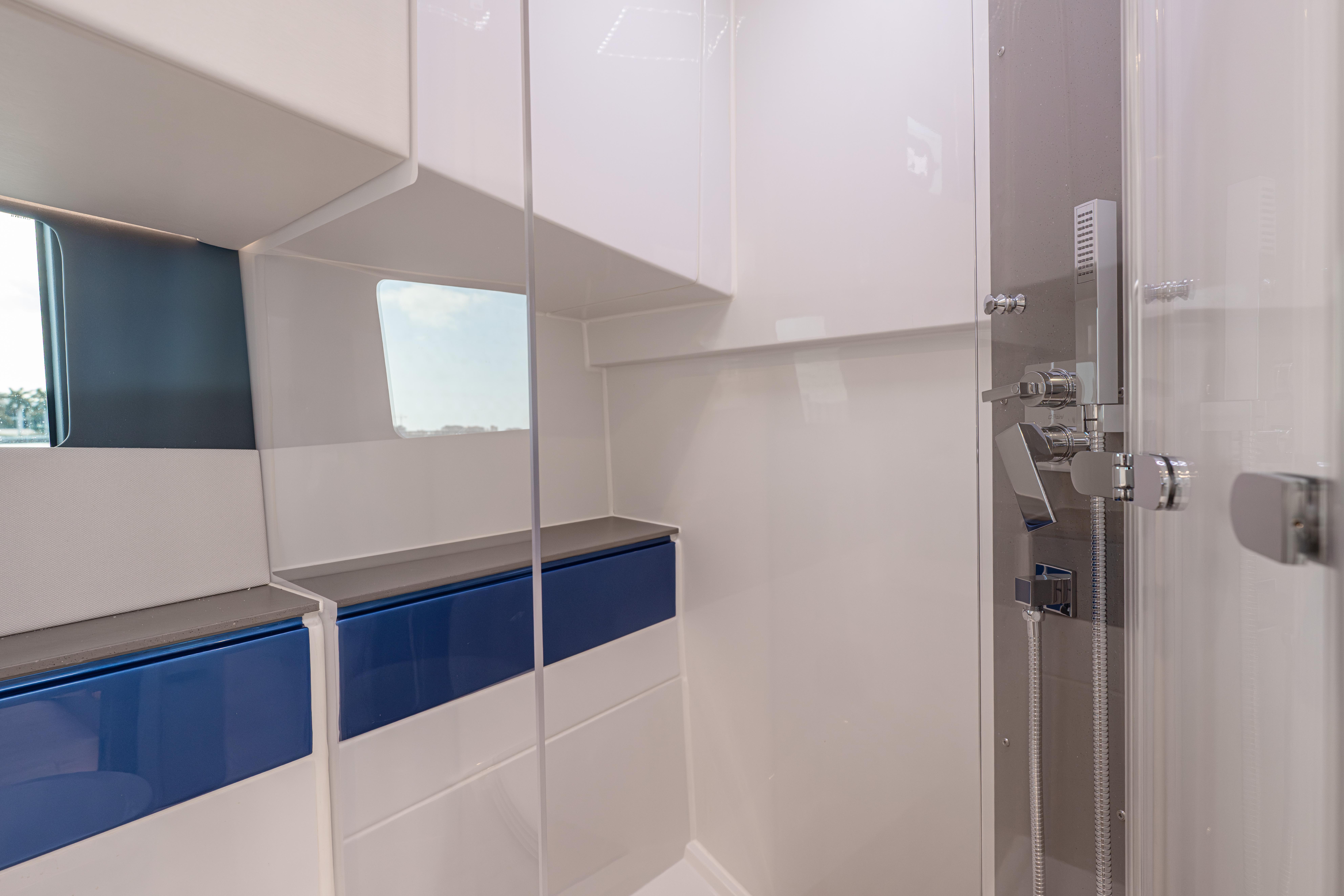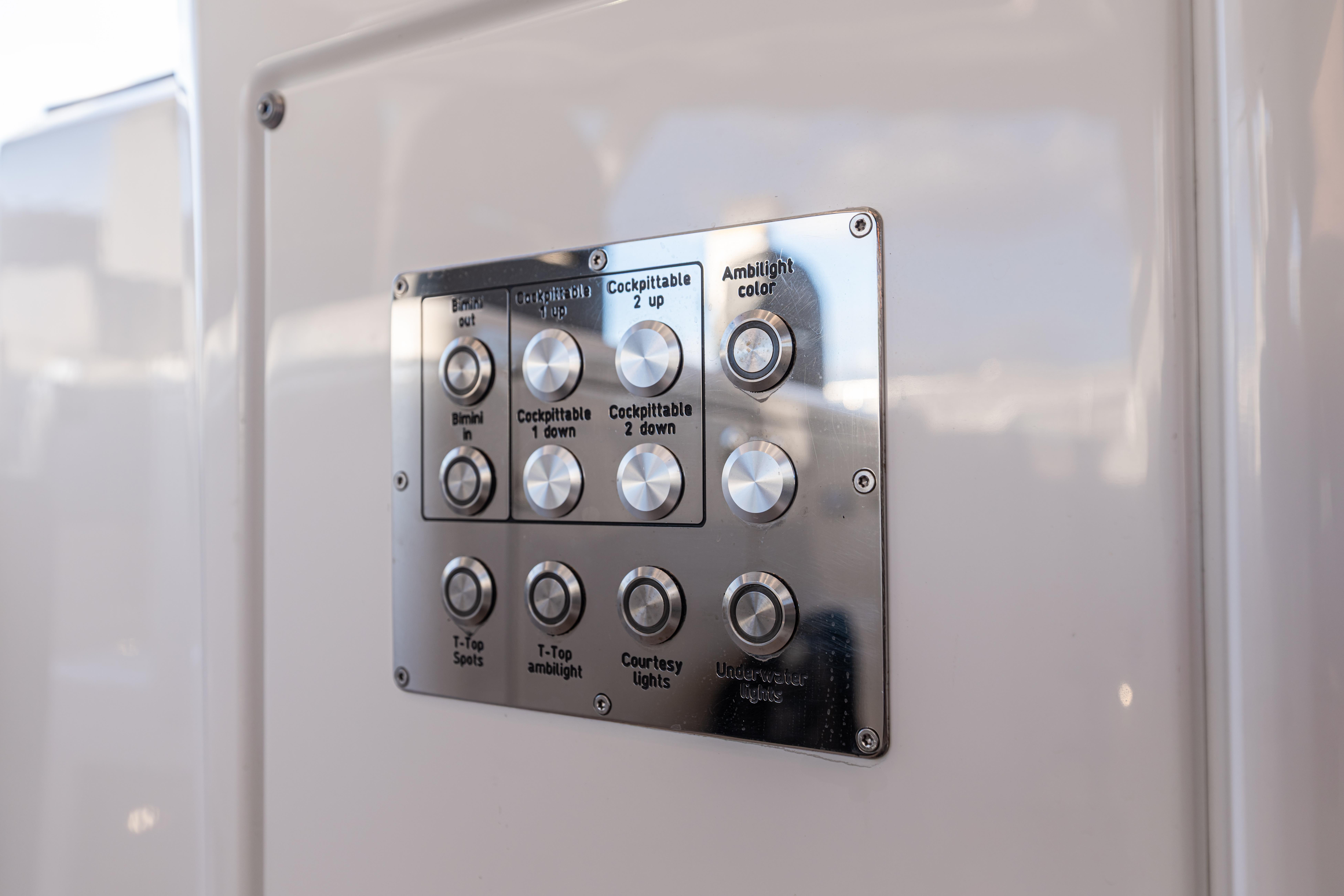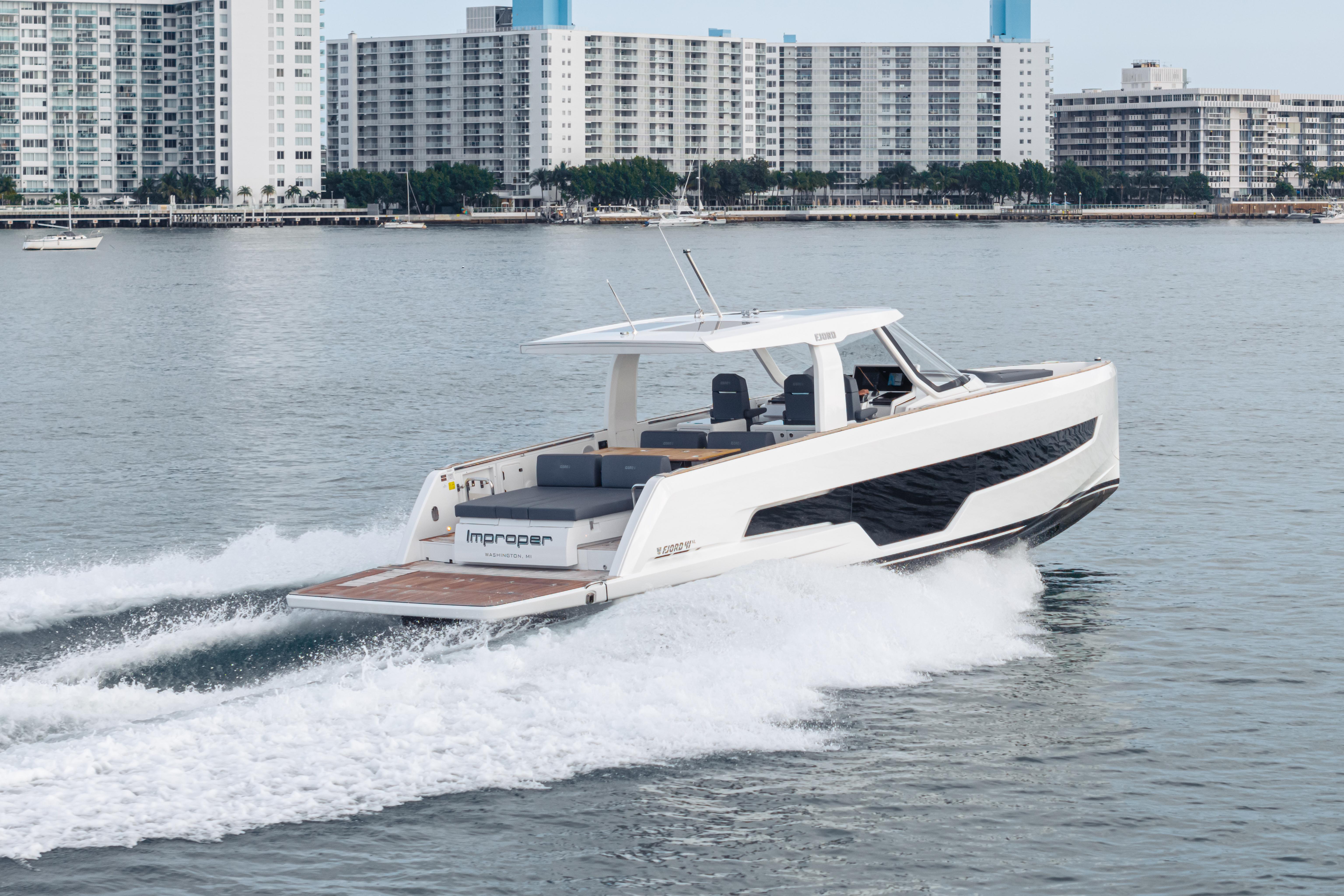 High performance Hull design. Superior Sandwich hull construction with a robust inner grid. Volvo Joystick control. Customizable deck layout and lower deck layouts. Large T-top. Large 2nd cabin. Hull windows through out. All glass bridge. Quick Gyro, Volvo active trim assist, High low platform. Galley up with additional refrigeration below. Roughly 38 engine hours.