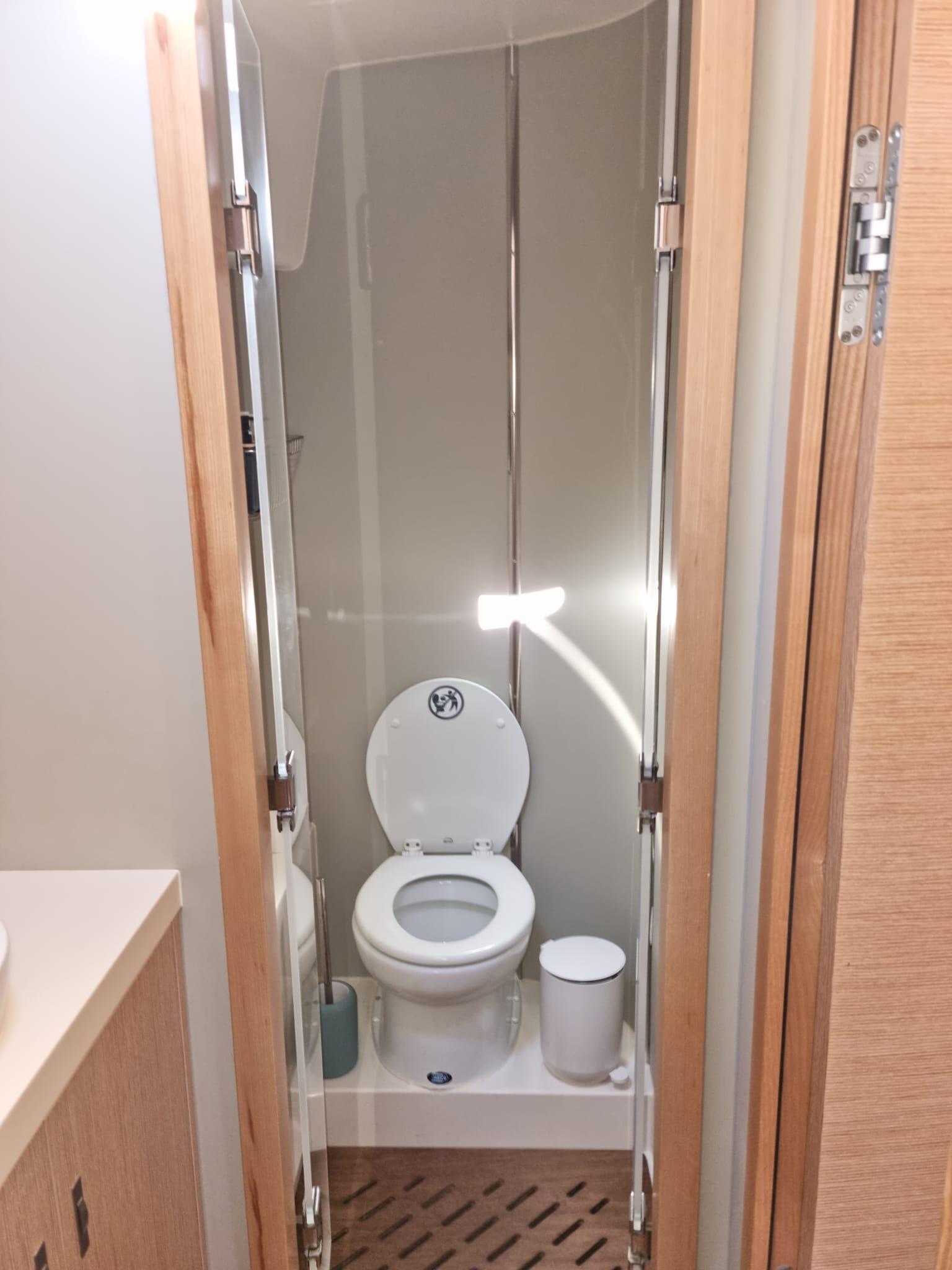Cabina ospiti di poppa a sinistra con due letti singoli e bagno con wc elettrico e doccia separata;