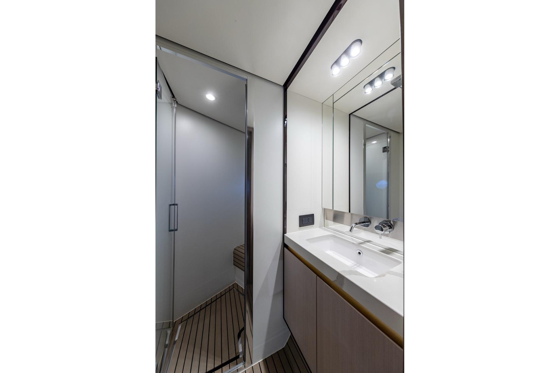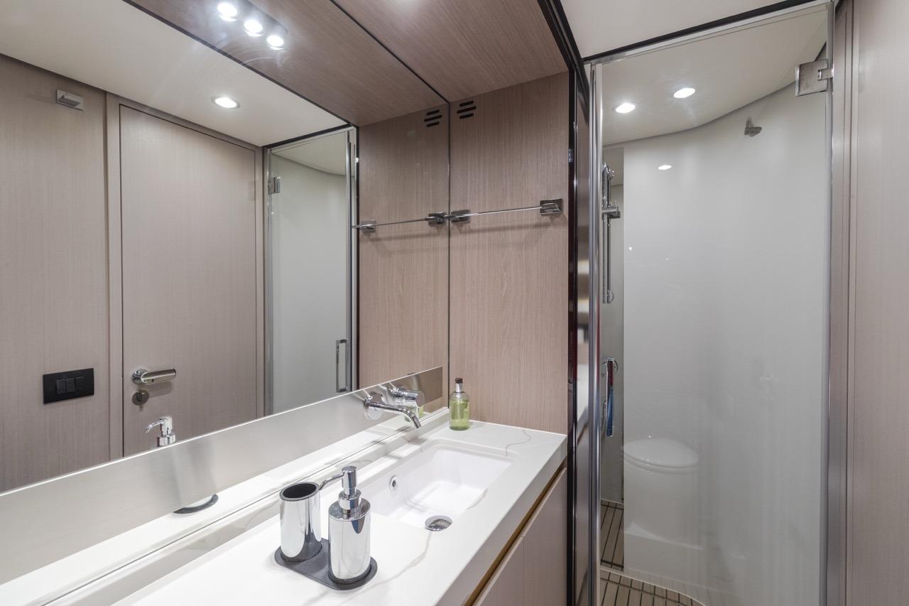 Equipement intérieur : Siège copilote timonerie, Cabine équipage avec un lit + rangement a l'arrière et air conditionné, Cabine équipage avec deux lits et air conditionné, Crystal dinette table, Pack Lumières Deluxe Variateur de lumières pour l'intérieur (salon, cabine master, vip et invités), Domotic lights in salon, Table pliante hi-lo automatique coin repas, Kyra Pietra A000127509 simili cuir sur le pont principal, Set de draps pour cabine skipper (2 lit), Toilette avec bidet intégré dans les 3 salles d'eau, Plancher bois dans dinette, Plancher bois dans le salon