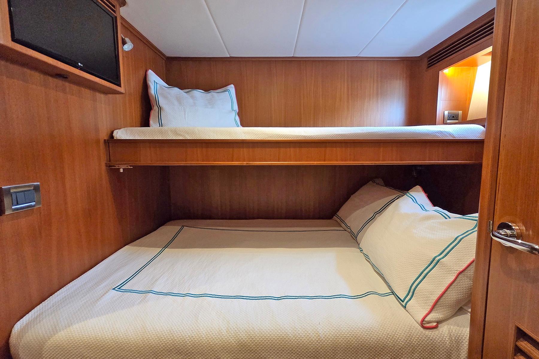Moving aft from the VIP to port, the state room provides a full queen size berth below, and single pullman above, cedar lined hanging locker, drawer storage and large, en-suite head and shower.