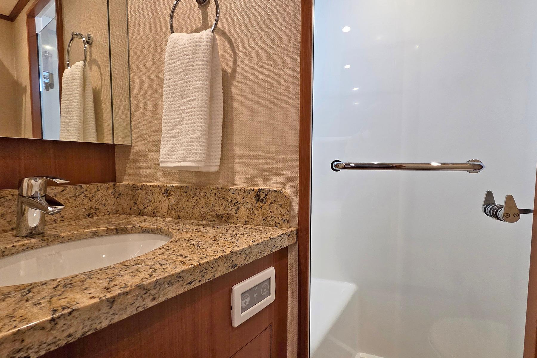 The detail of choices in this stateroom includes a separate, standalone air conditioning system run from the inverter, and a doubled sized house batteries bank to allow the master area when at anchor to have complete comfort without a generator running. Also, an additional GPS monitor provides information including an anchor watch system. The en suite head has a marble countertop, and the large shower, like the other showers on board, has a mosaic tumbled marble floor.
