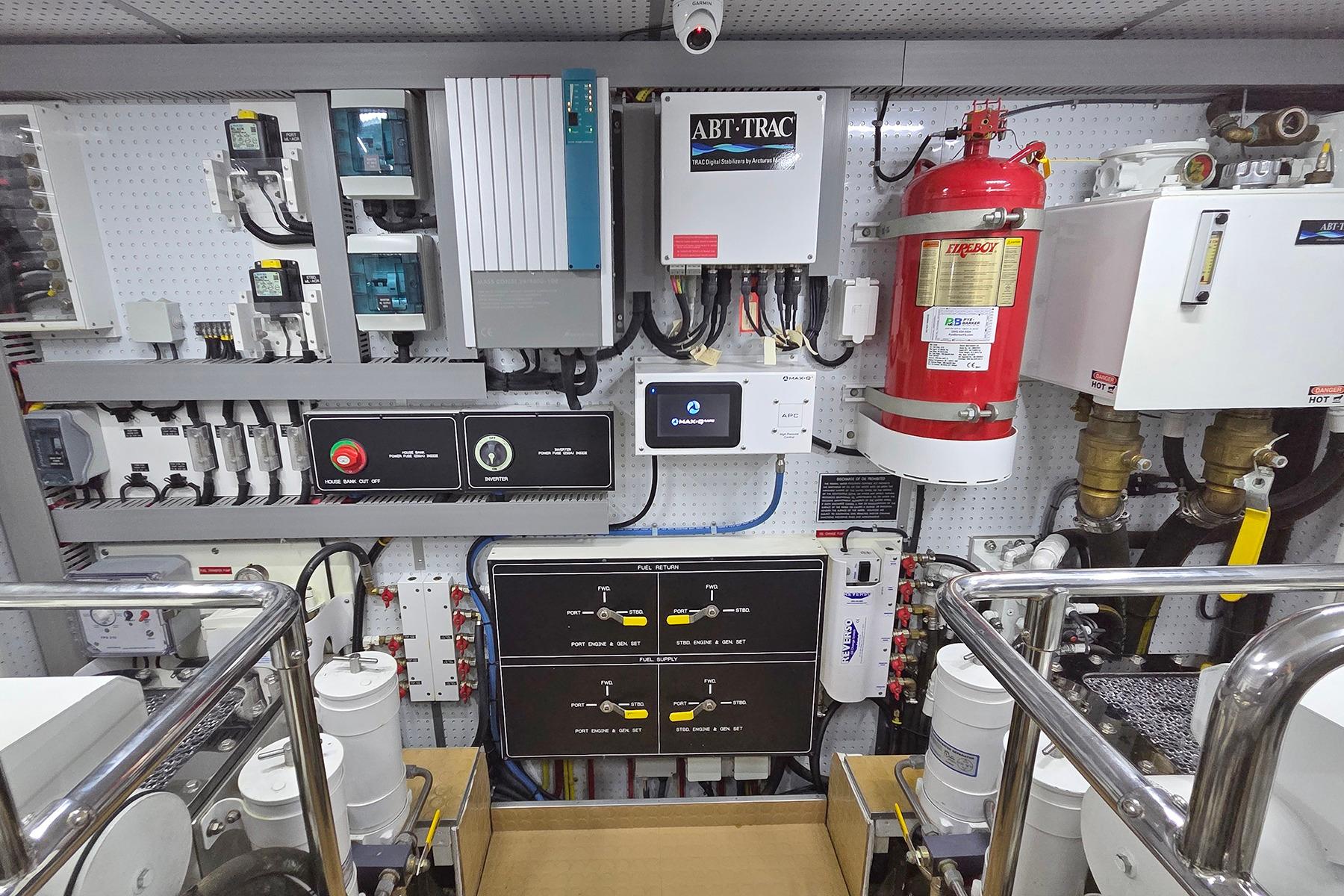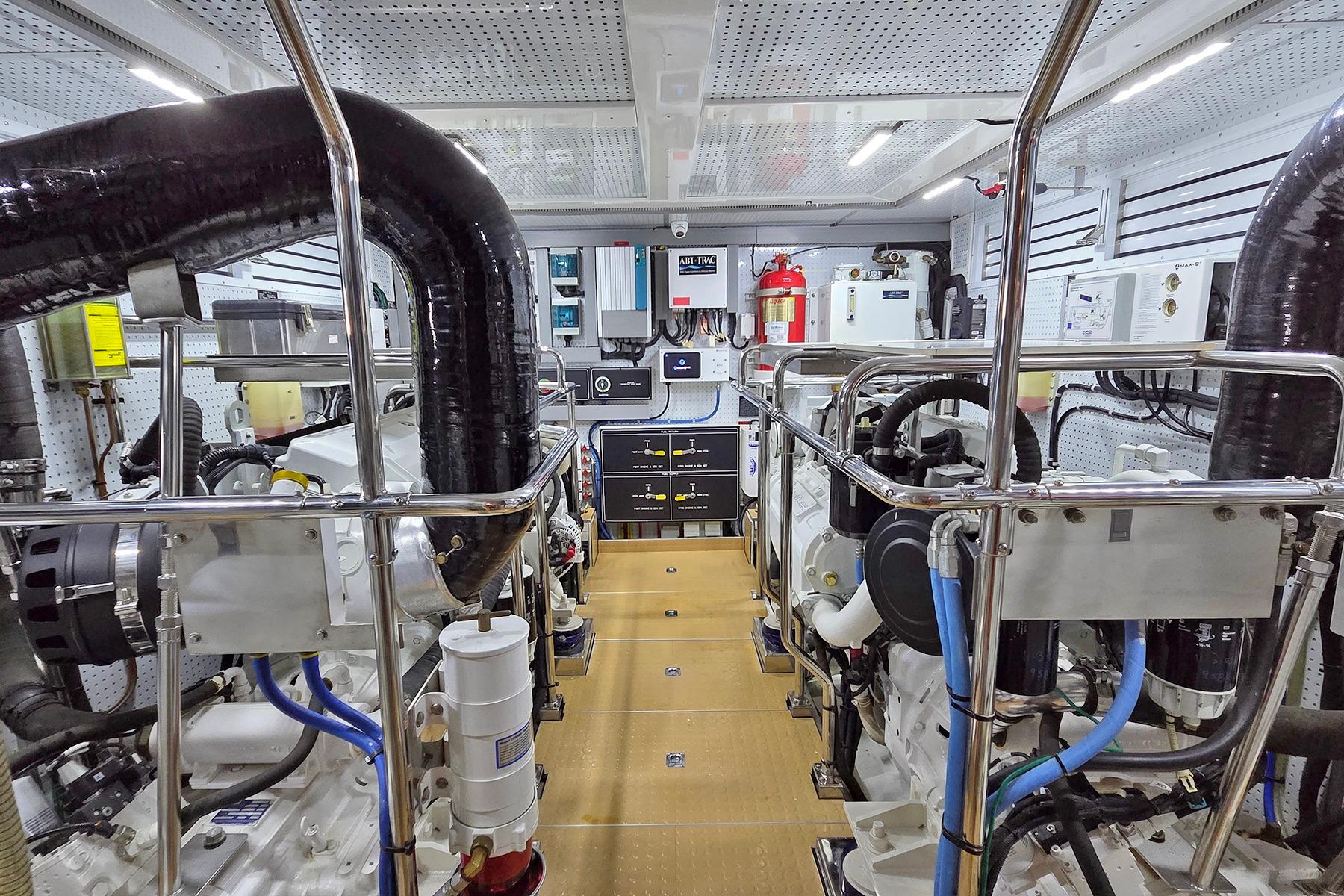 The engine room is accessed through a watertight door which houses the twin John Deere 750 hp engines, twin 20 kW Northern lights generators, and much of the yacht’s systems, including the watermaker, frequency and voltage converter, plus fuel tanks outboard. This is also an air-conditioned area and the twin chiller redundant system is located in the engine room, as is the enclosed shaft Seatorque system.