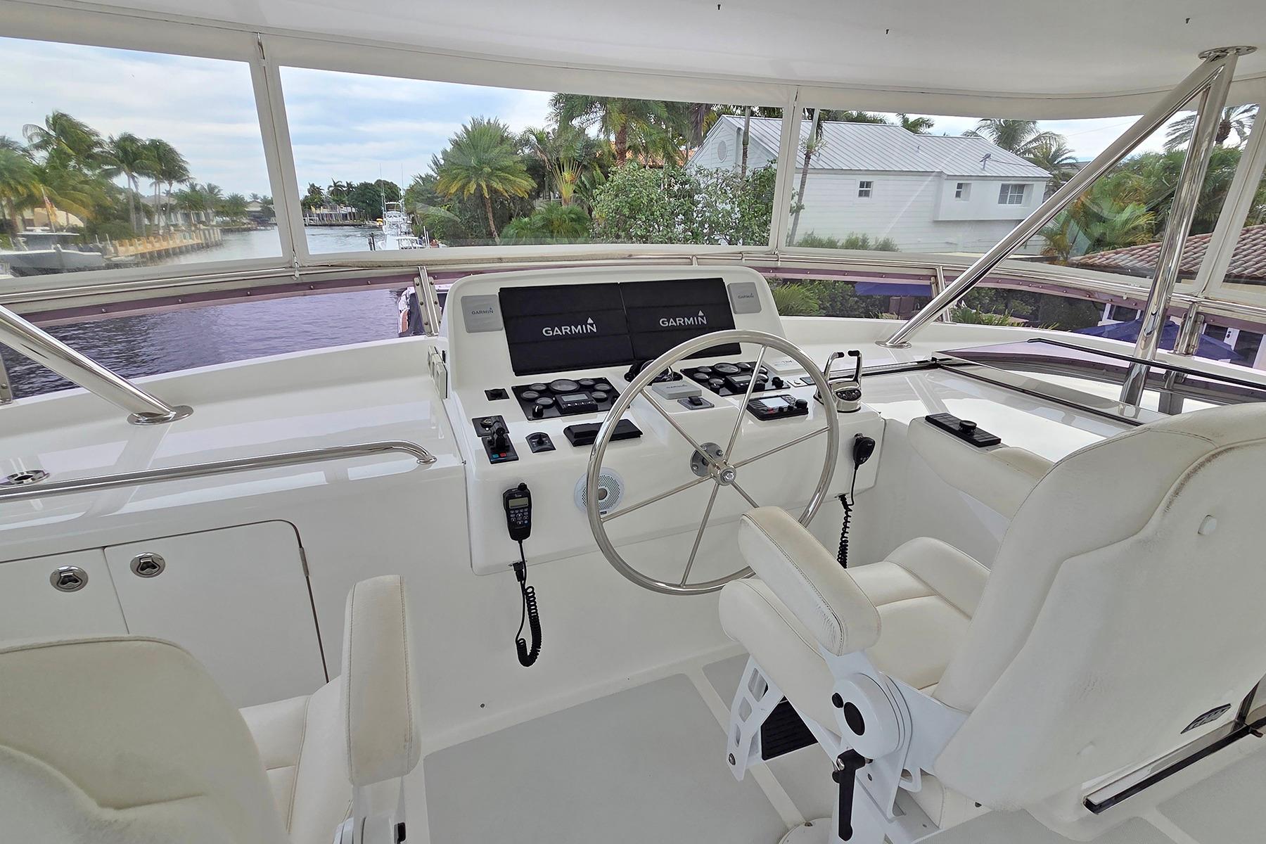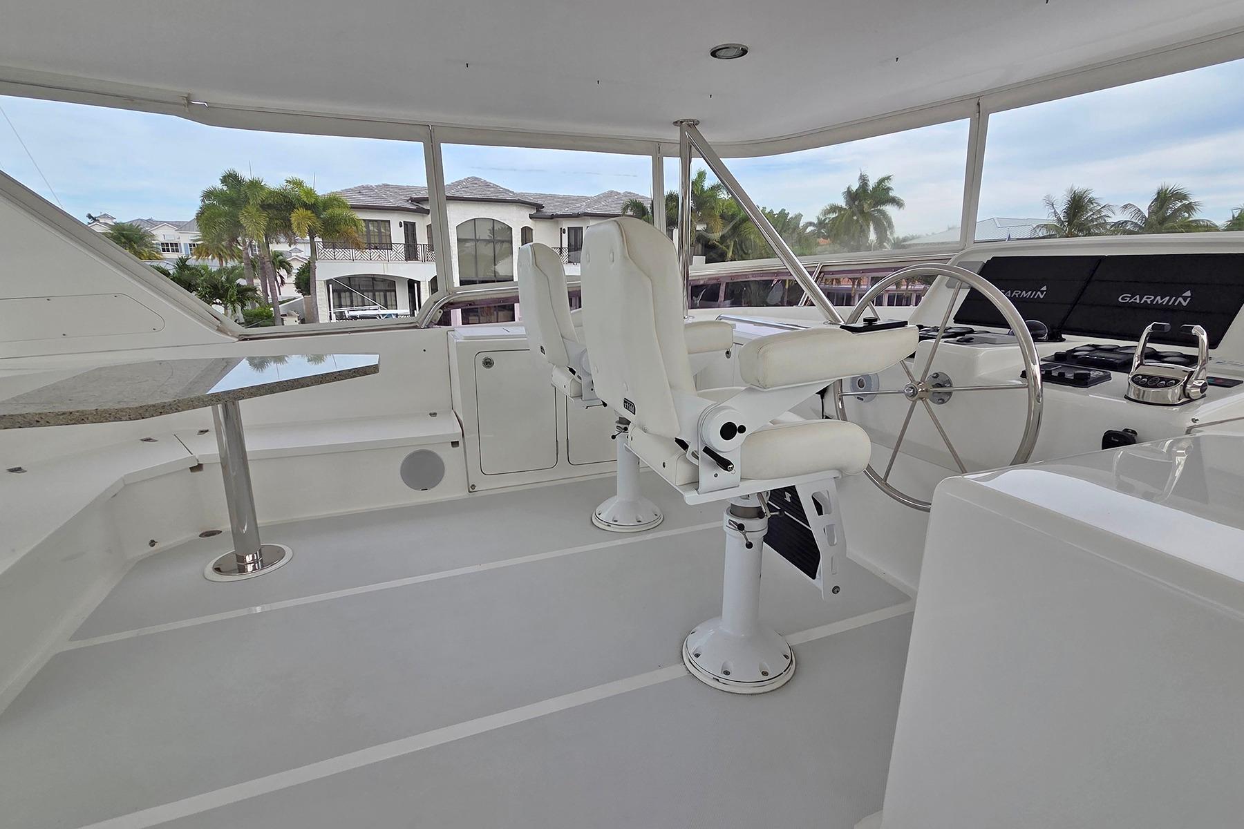 The wide comfortable staircase from the pilothouse leads to perhaps the largest flybridge on a 72 foot yacht. The hard top over the forward section was designed to allow the three-sided enclosure below to maximize visibility. The upper flybridge console contains duplicate systems seen below in the Pilothouse such as the fully hydraulic proportional, bow and stern thrusters, and stabilizer system controls. There are Stidd seats, a continuation of the gray non-skid seen below on the main deck, port, and starboard, U-shaped, seating with granite tables and storage below the seating. There is also an added feature next to the helm chairs - an additional storage cabinet with lounge above.