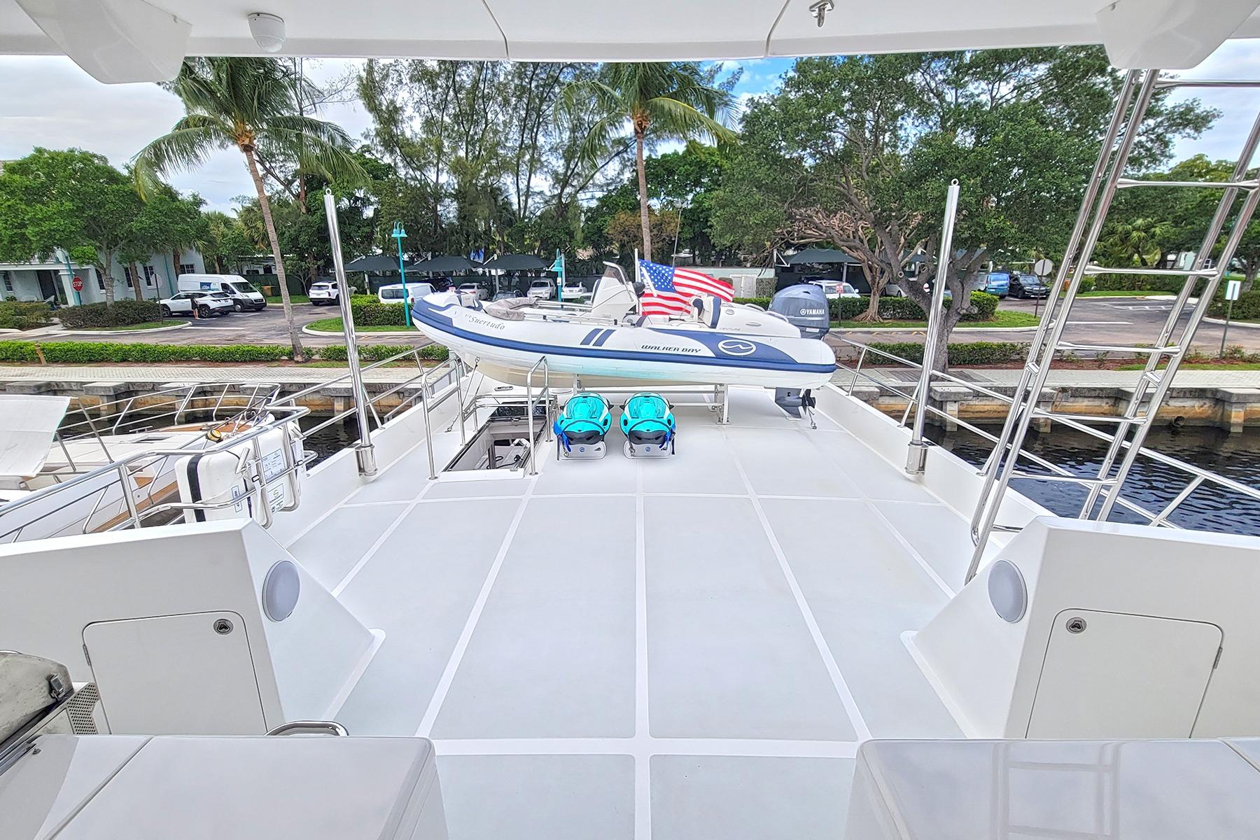 Continuing aft on the flybridge deck, the boat deck houses a 2020 Walker Bay Venture 14 foot tender with 70 hp Yamaha on removable raised chocks. This area also has an abundance of water toys including two kayaks with mounting brackets and two SEABOBs. The 1,700-pound davit is fully hydraulic and has a 12-foot telescopic arm to allow the tender and other water toys to be brought down behind the extended swim platform or to the side of the vessel. There are also two stainless posts that allow a sunshade from the rear part of the hardtop to the top of the stainless posts for sun protection. There is also easy access from the boat deck area by opening a sliding glass hatch and heading down the staircase to the aft deck.