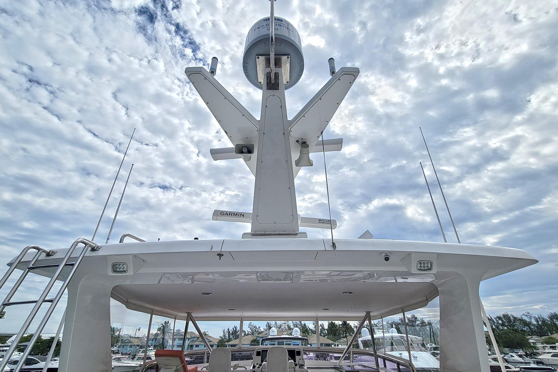 SUERTUDO has the benefit of a hinged mast at the aft end of the hardtop, which would allow the yacht to have clearance below 21 feet, allowing travel to the Great Lakes, by traveling from New York, up to Hudson River to Albany, then entering the first lock at Troy of the New York State canal and lock system, then departing that system, after arriving at Oswego on the southern end of Lake Ontario. The Hardtop also has six 300 watt solar panels.