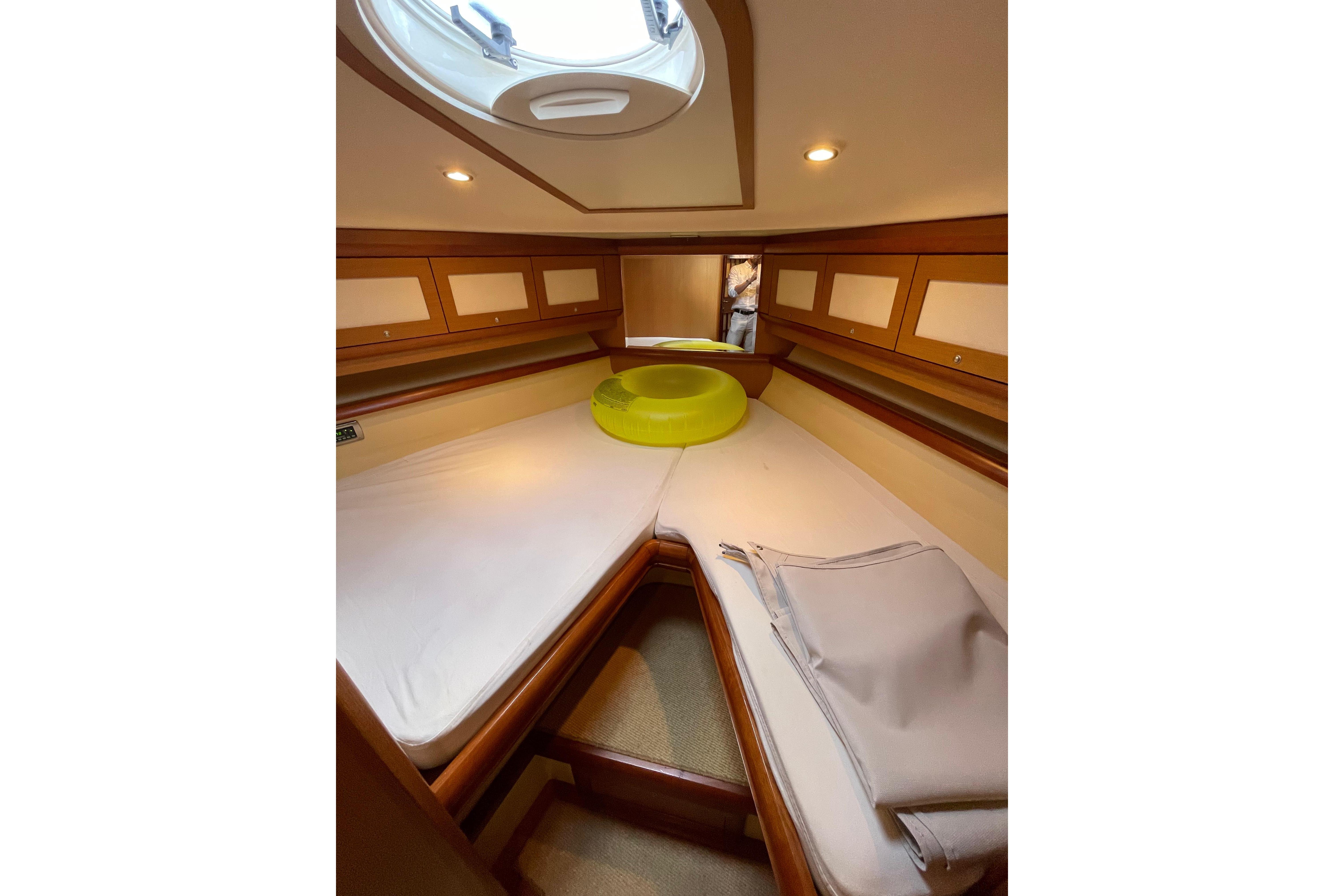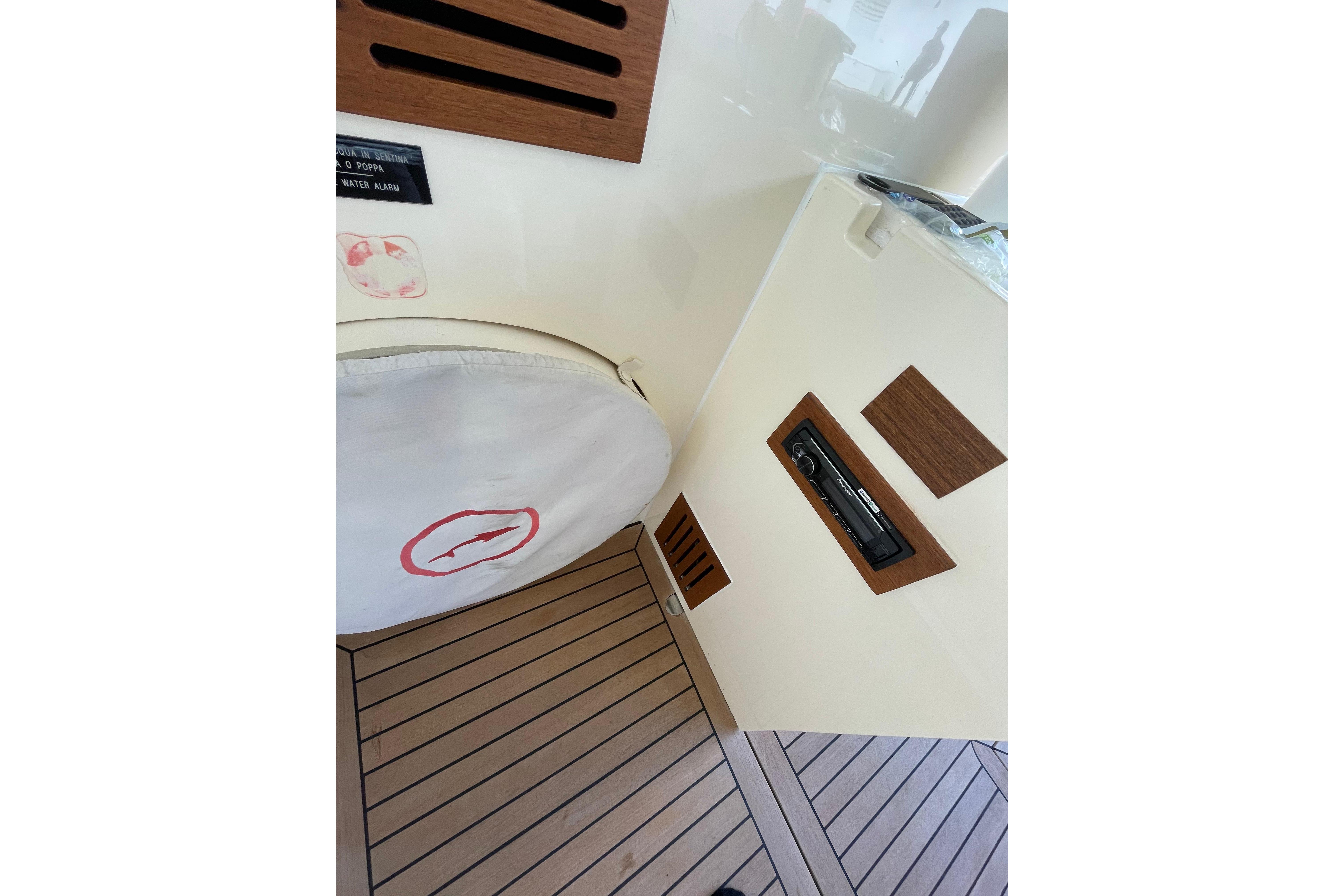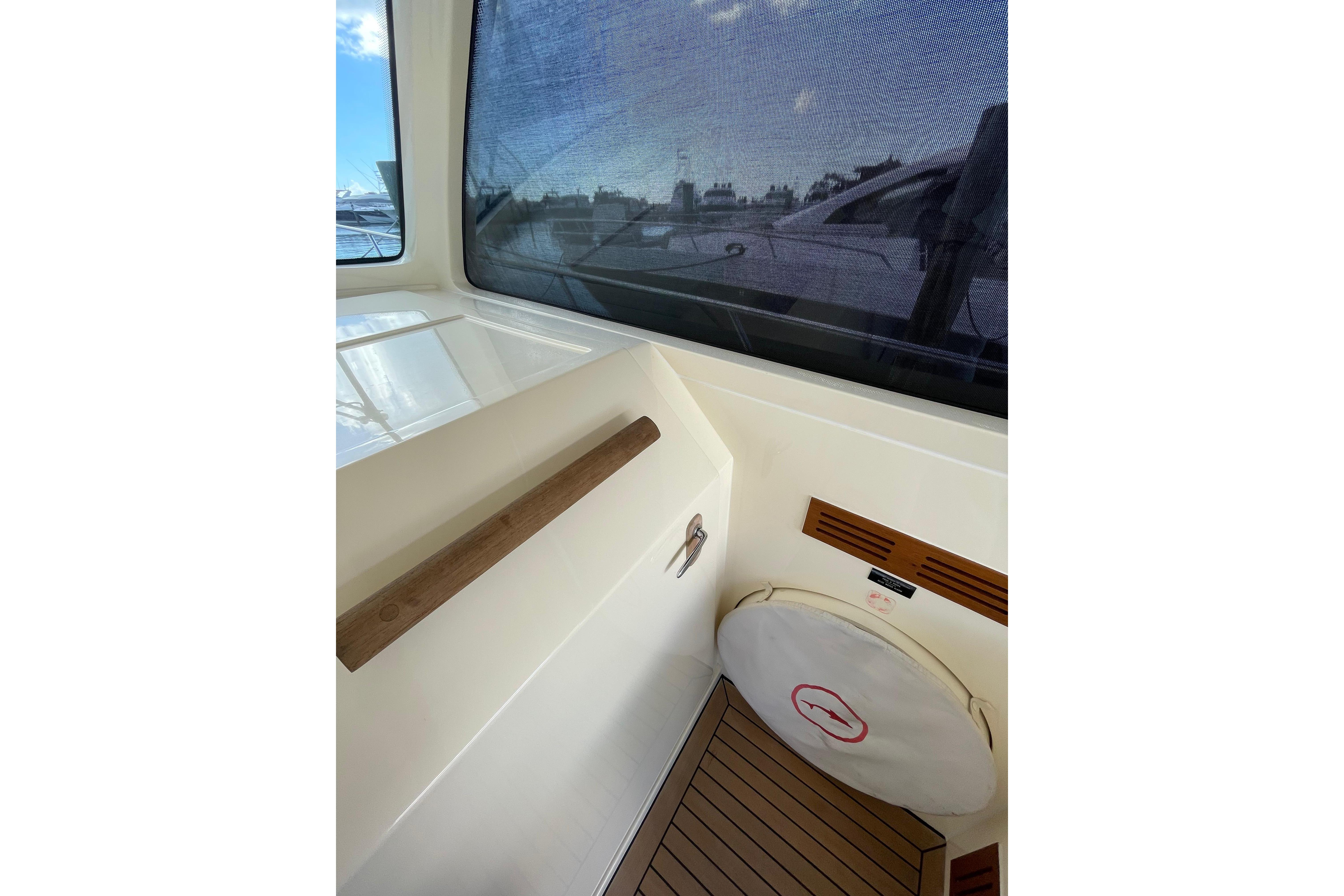 As sweetly as she ran, she looked better. Her aft deck and cockpit make her an ideal picnic boat. As for the cockpit, I particularly like her six-seat, C-shape settee just aft of the port-side helm. With a teak table it's an ideal alfresco dining area. If weather's, leave the roof closed and lower the aft drop curtain.