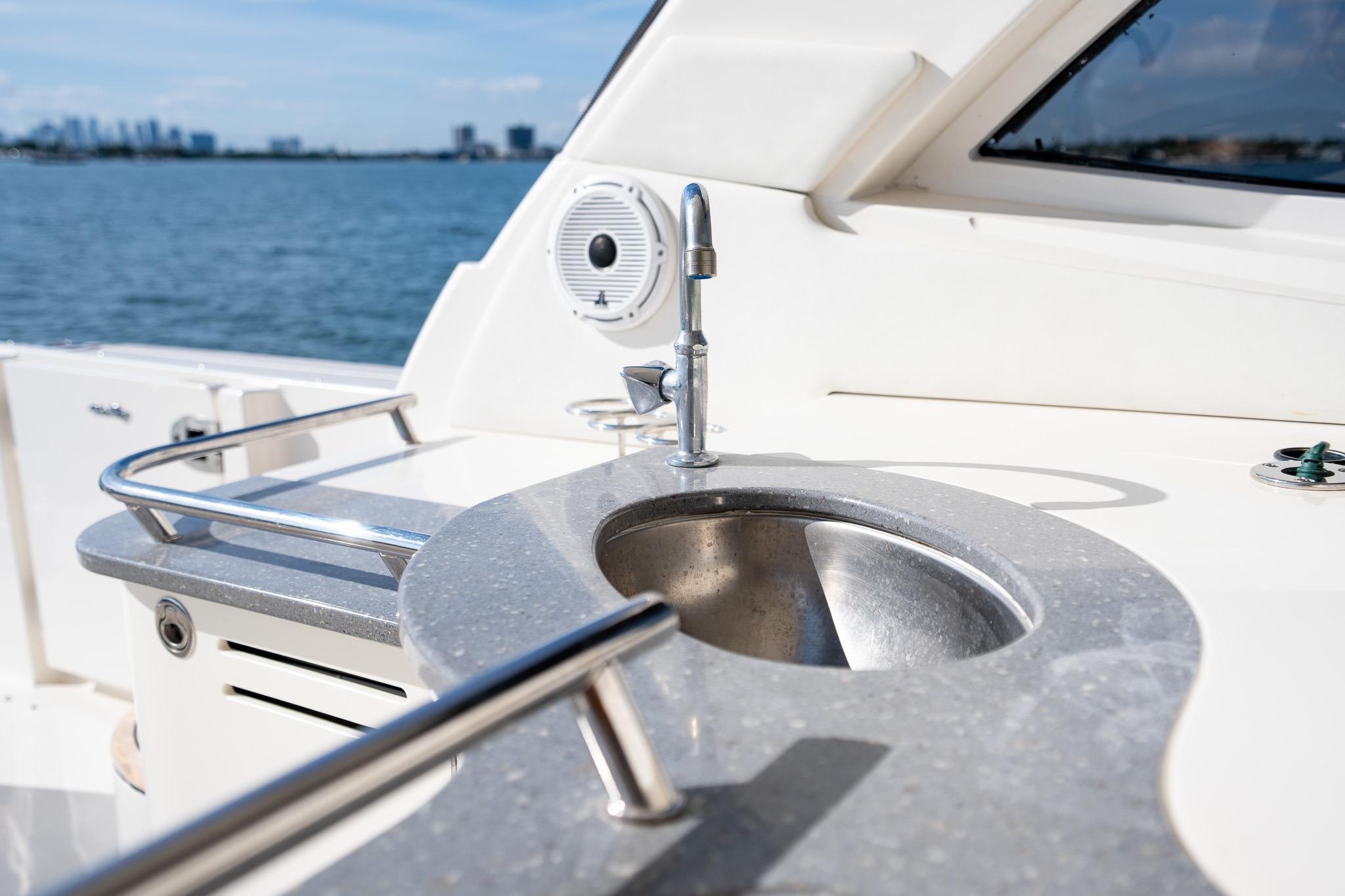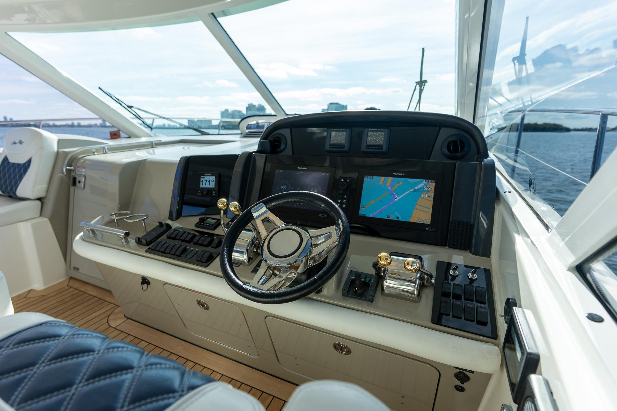 The gorgeous curves and aerodynamic profile of the Sea Ray 48 Sundancer are sure to attract attention. Outfitted with a unique, electric windshield vent system that allows for an unbroken line from deck to roof plus a sleek hardtop with two extra-large sunroof hatches, this ingeniously designed beauty is nothing short of inspired.