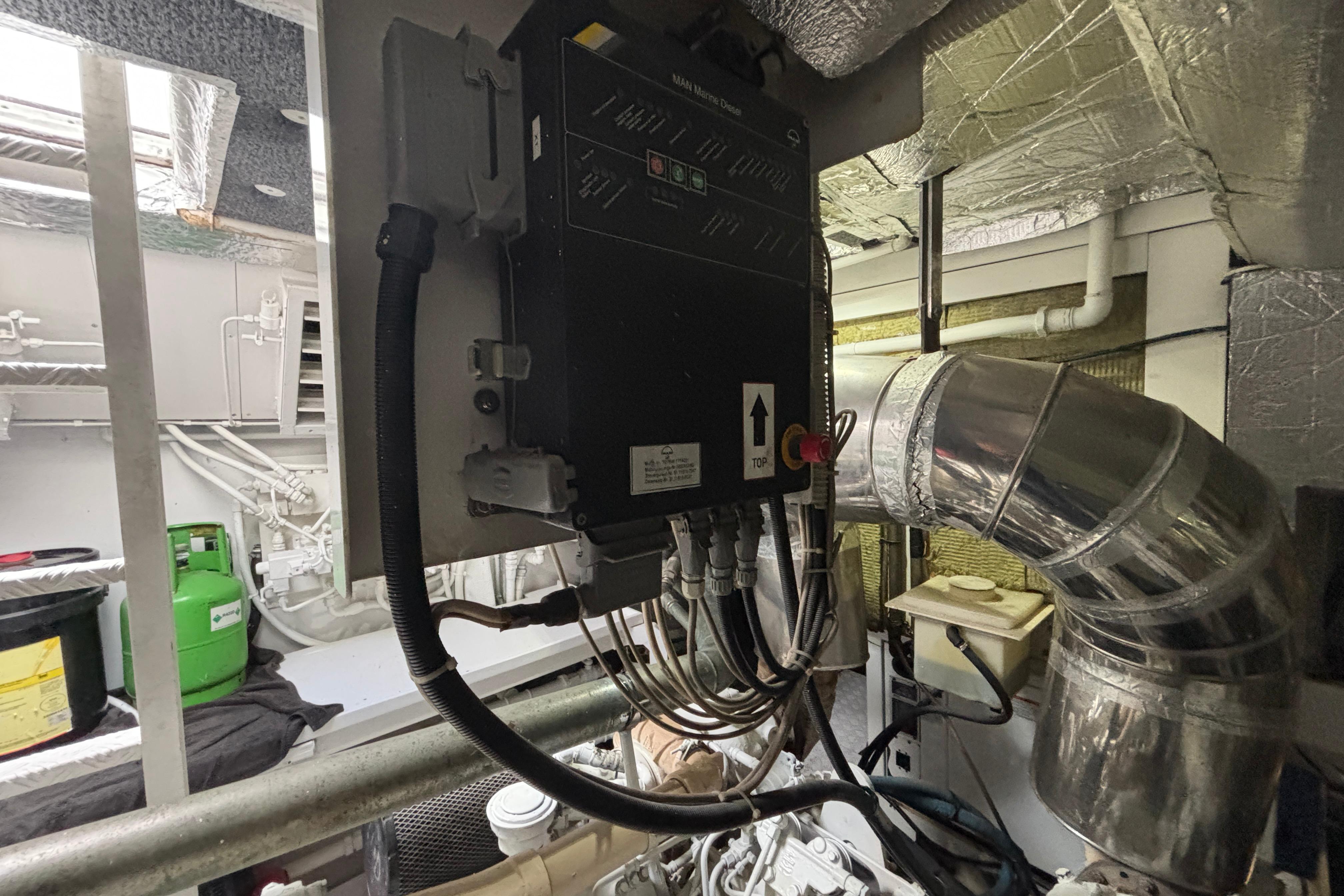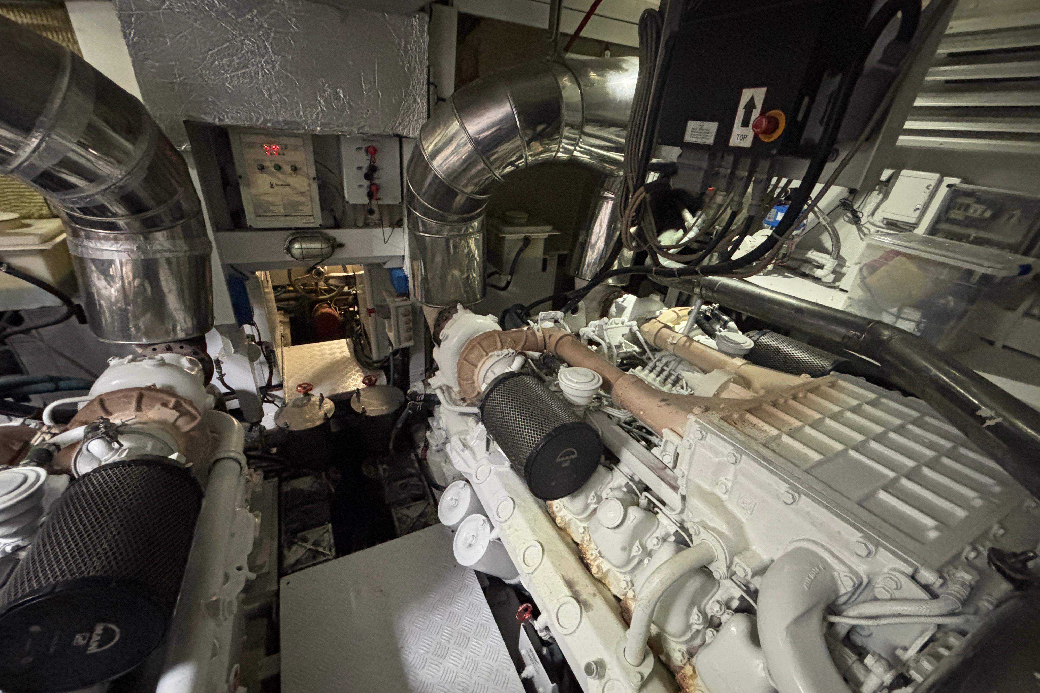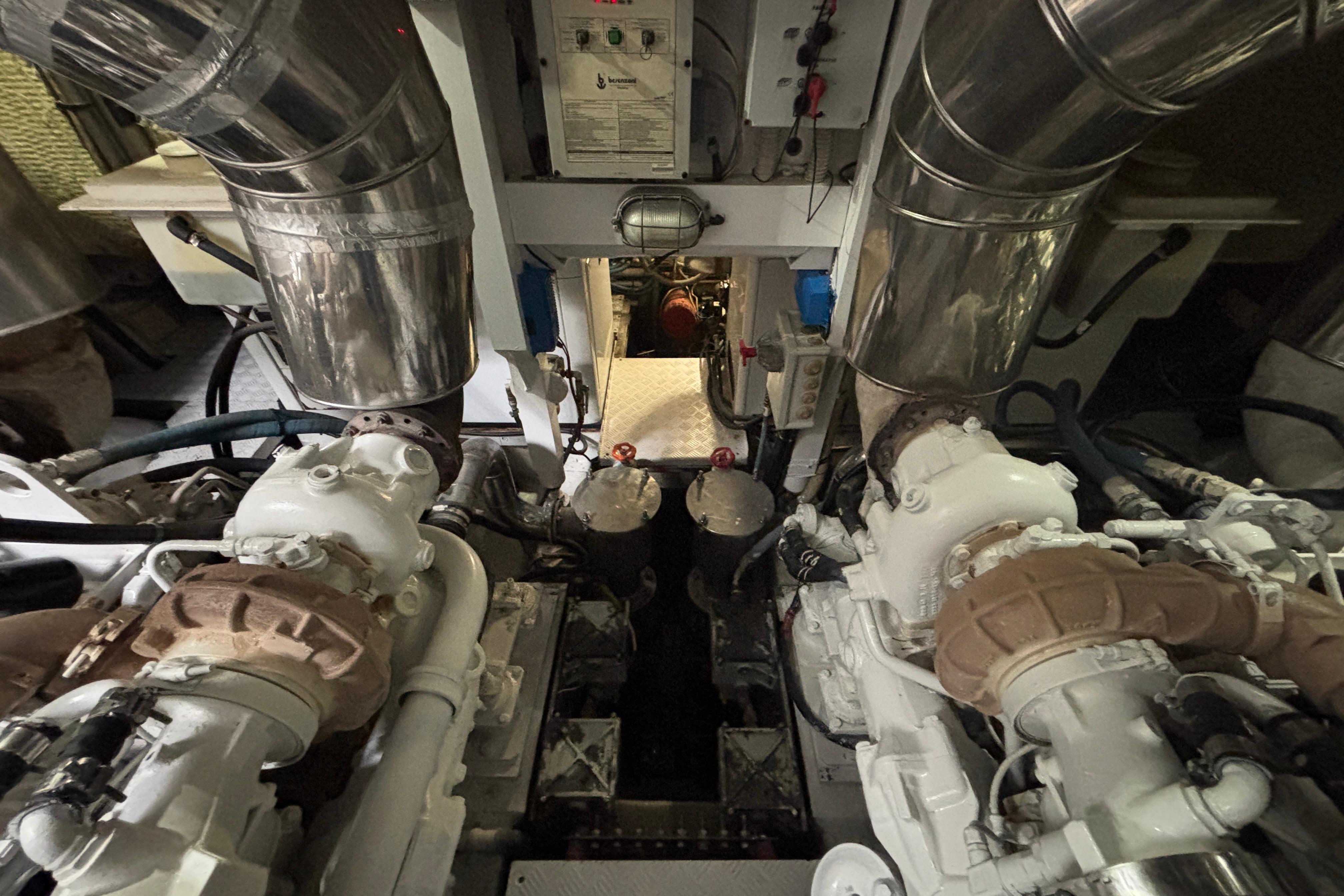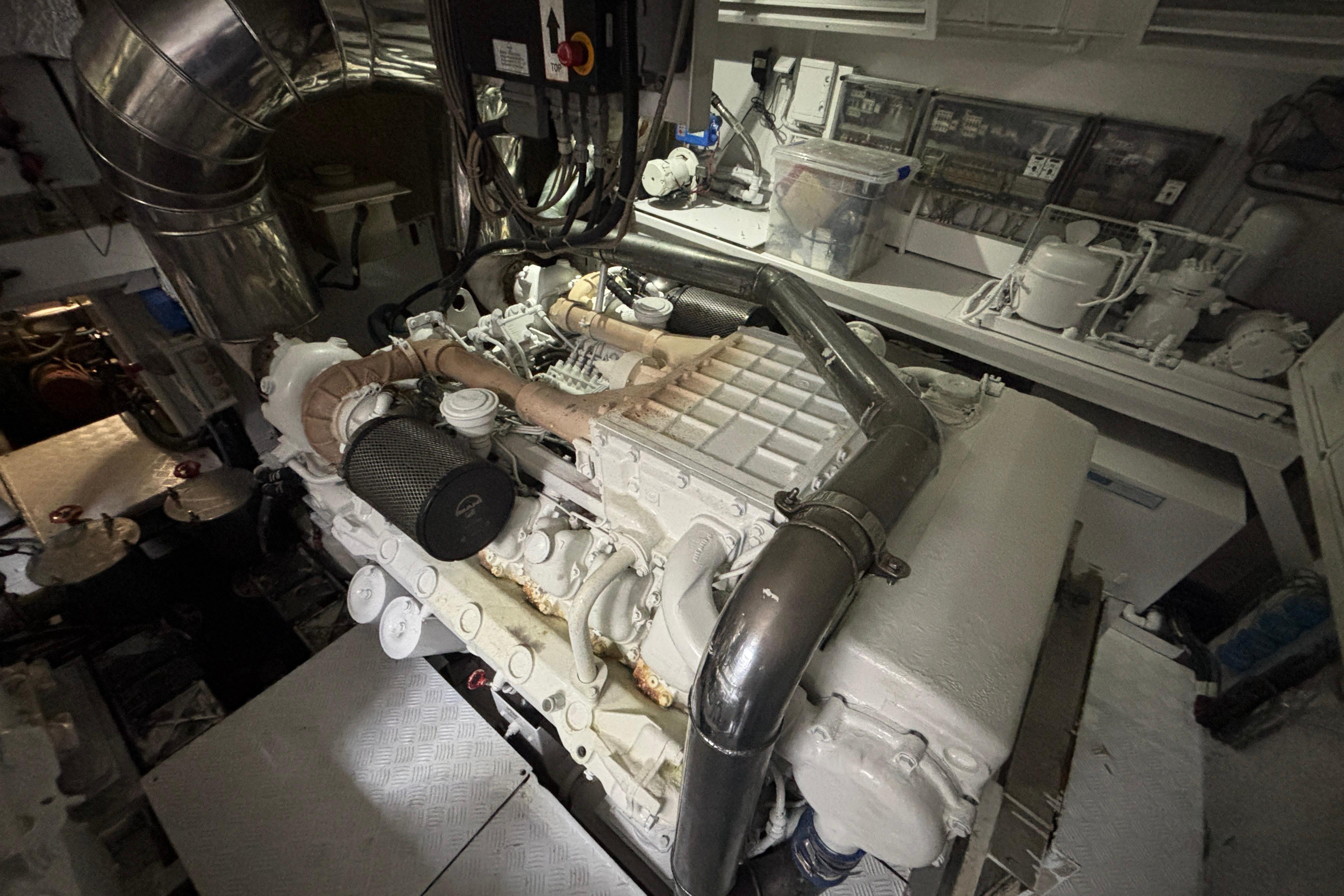 Two-man D2842LE404 engines from 2002 with 1300 hp each. Both engines are 12-cylinder diesels with a torque range of 200nm. They are seawater-cooled. It has a cruising speed of 22 kn and a top speed of 31 kn. The 5-bladed propeller drive type is Arneston. It has a bow and stern thruster.