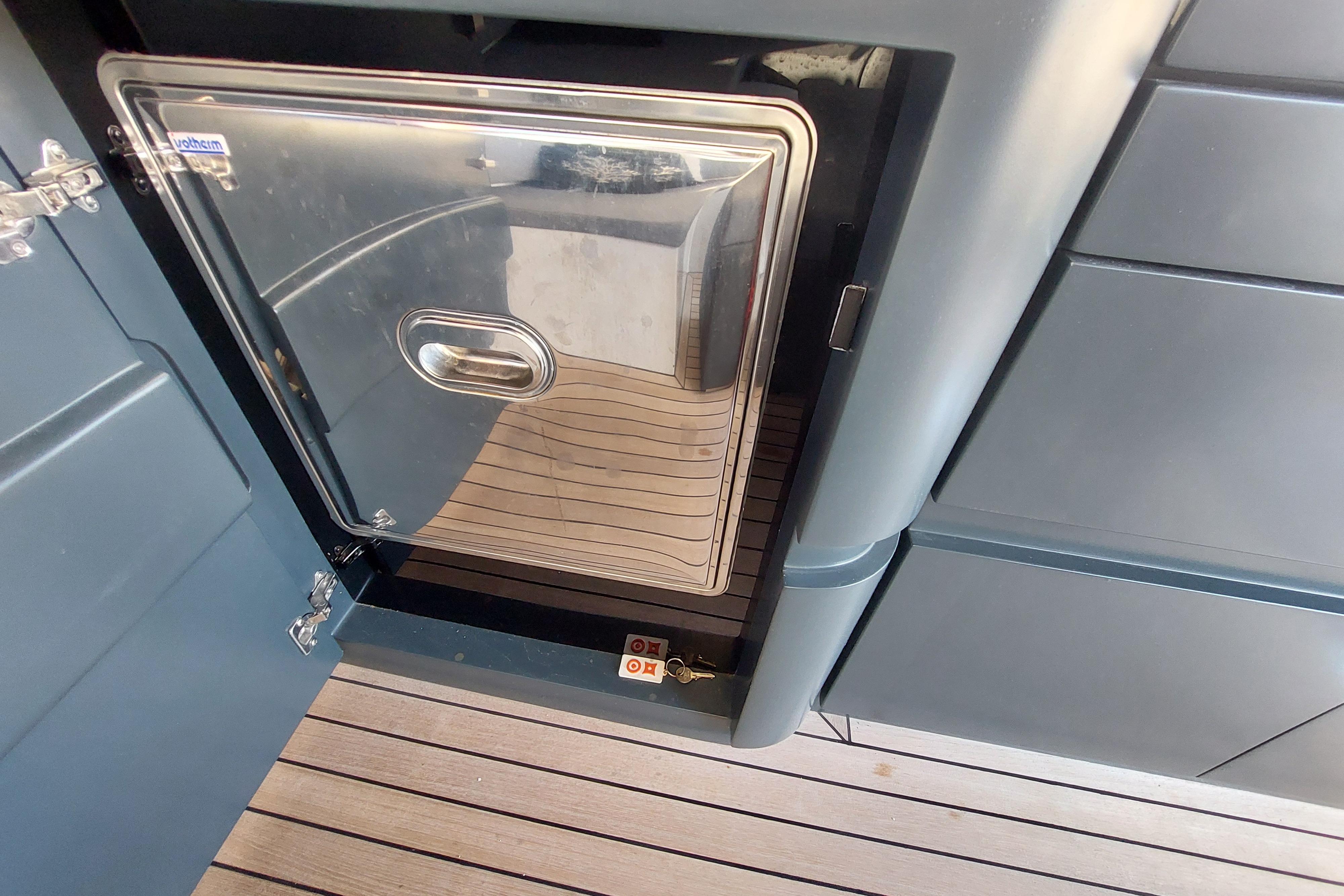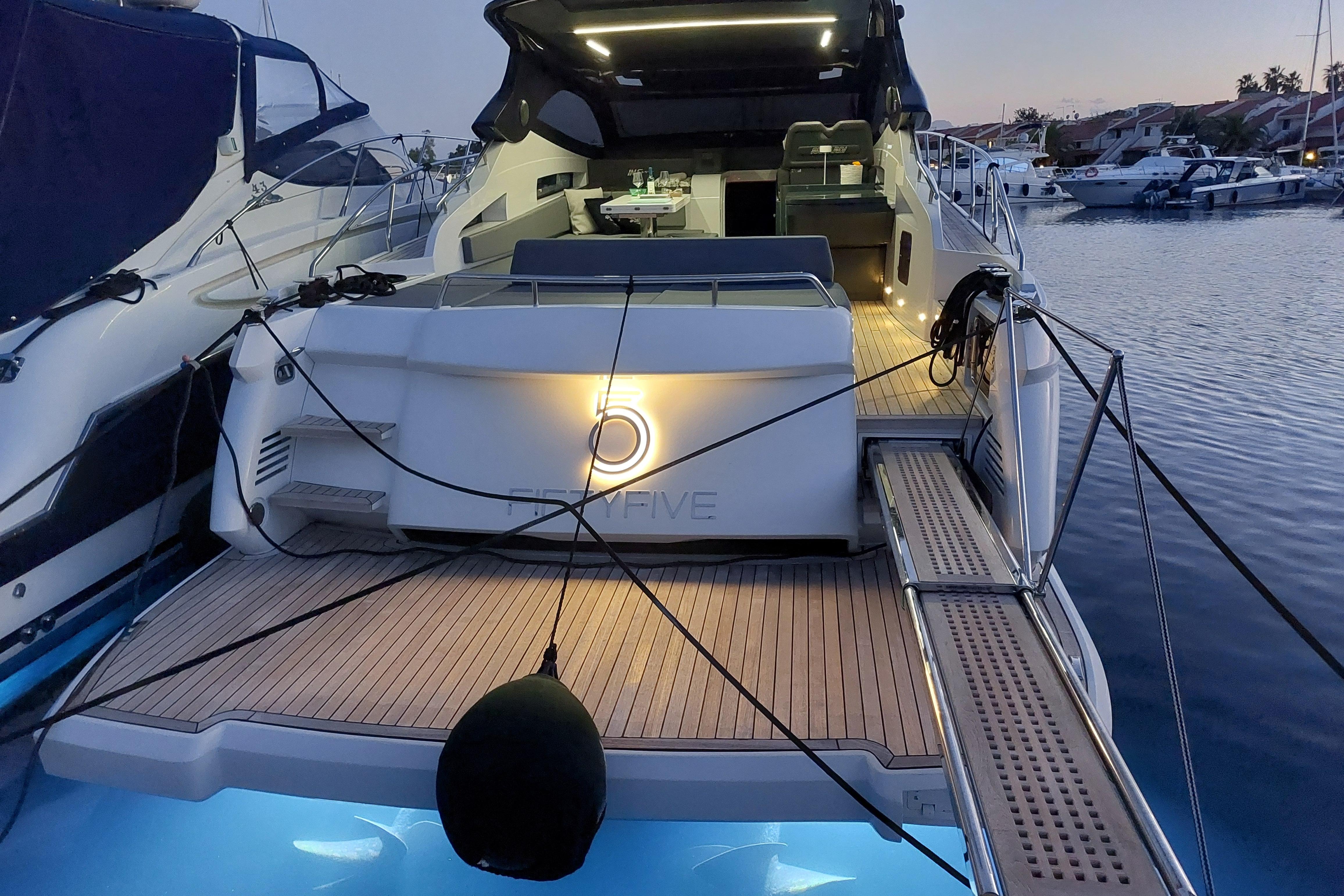 The Rizzardi INfive stands out as one of the most exciting sport yachts in its category. Designed for those who refuse to follow the ordinary, it delivers outstanding performance with a top speed of 45 knots, powered by twin MAN i6 800 hp engines and Top-System surface drives with Easy-Trim for effortless low-speed planing. Maneuvering is smooth thanks to the joystick control, complemented by bow and stern thrusters for confident handling in tight marinas.