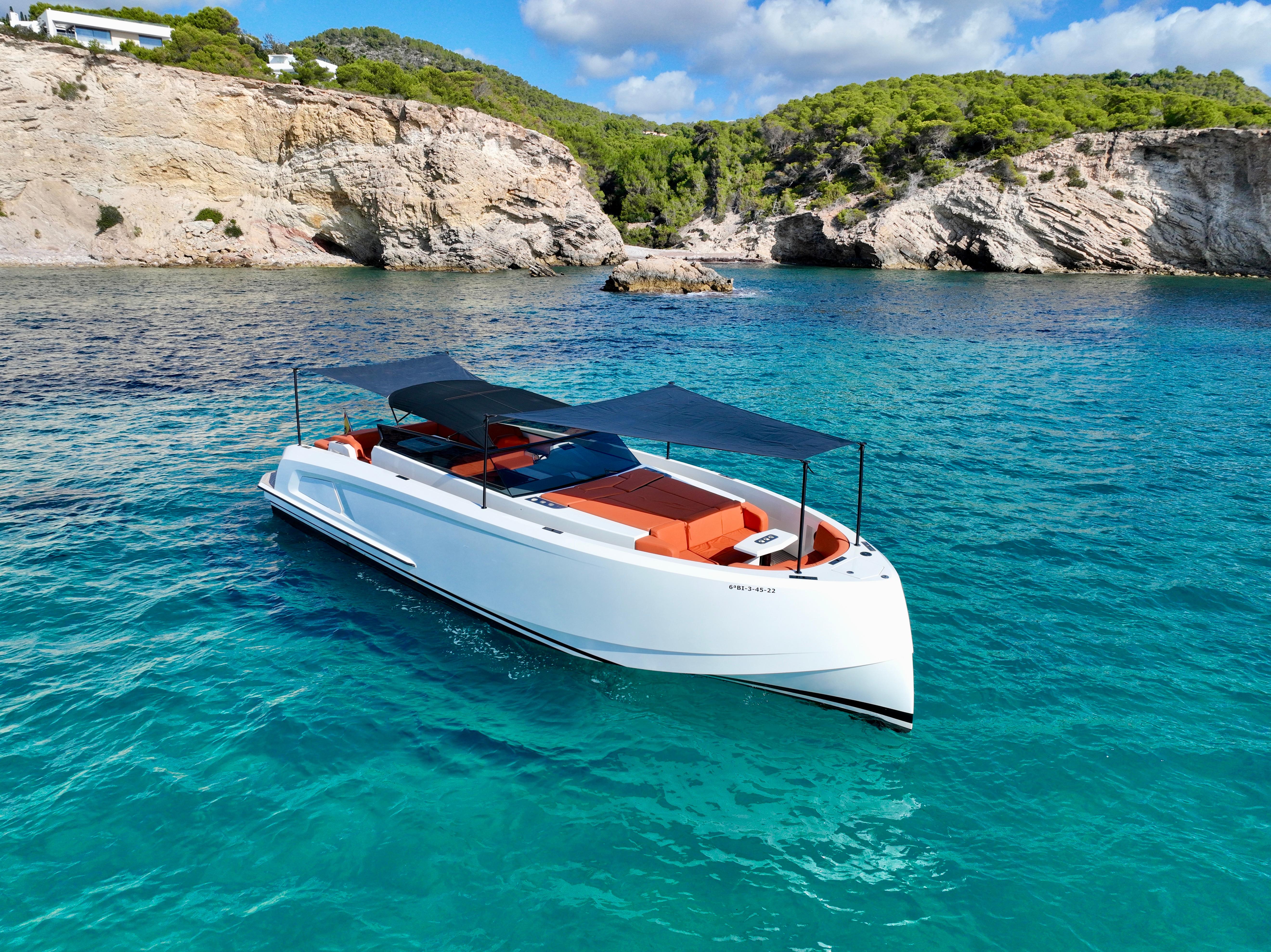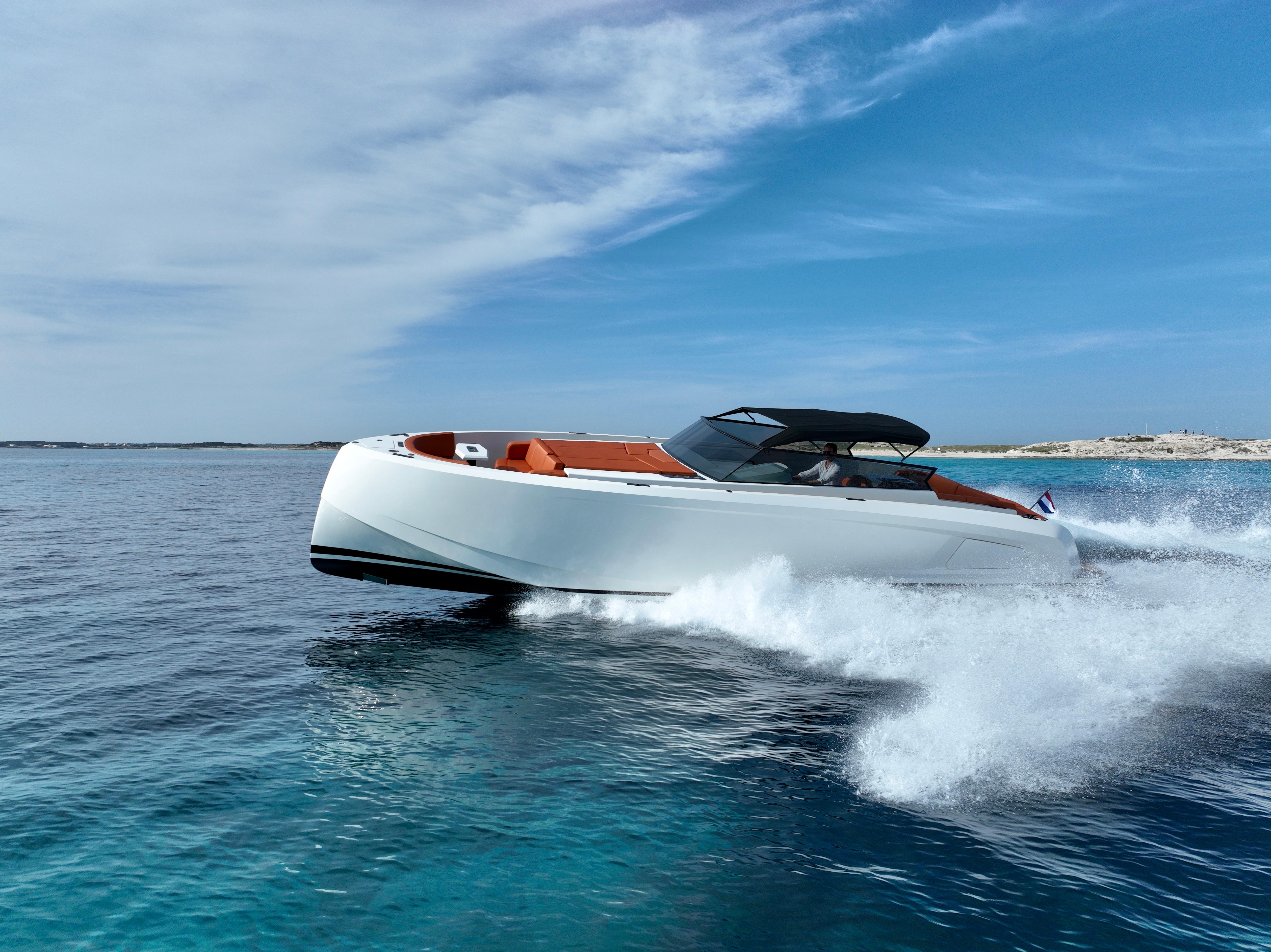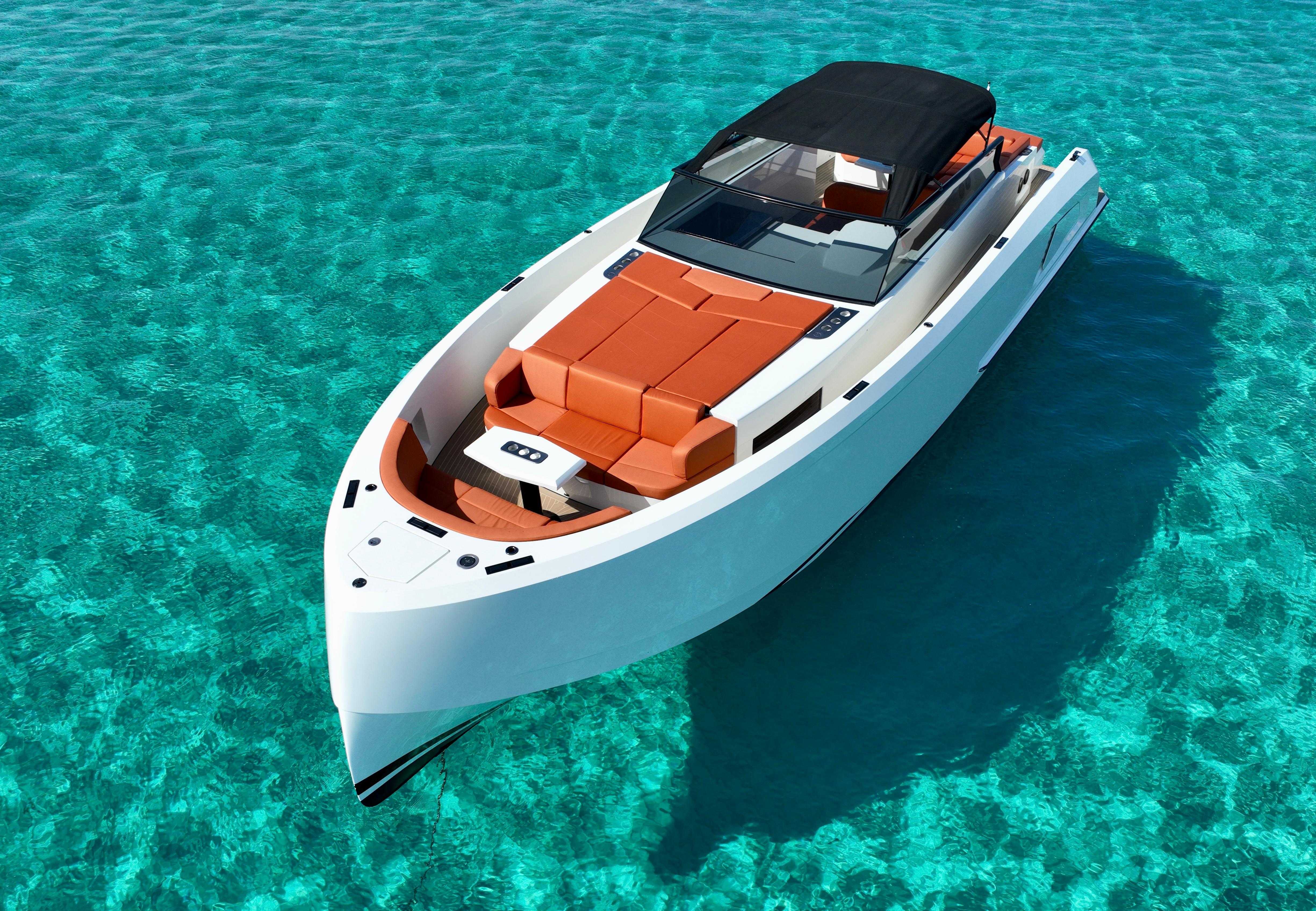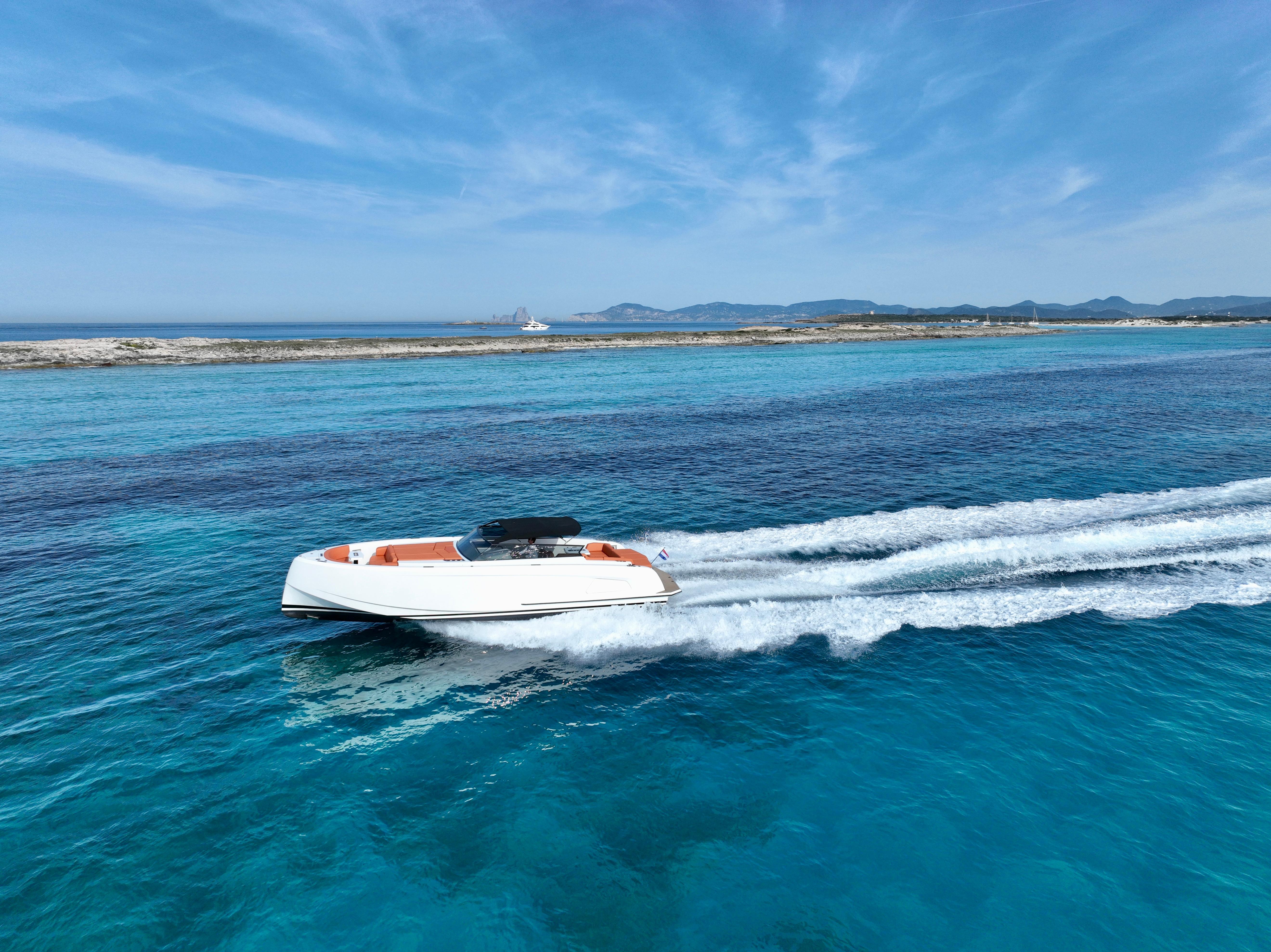 The elegant combination of the white hull, in combination with the cognac upholstery (Silverguard fabric) make it a boat that stands out.