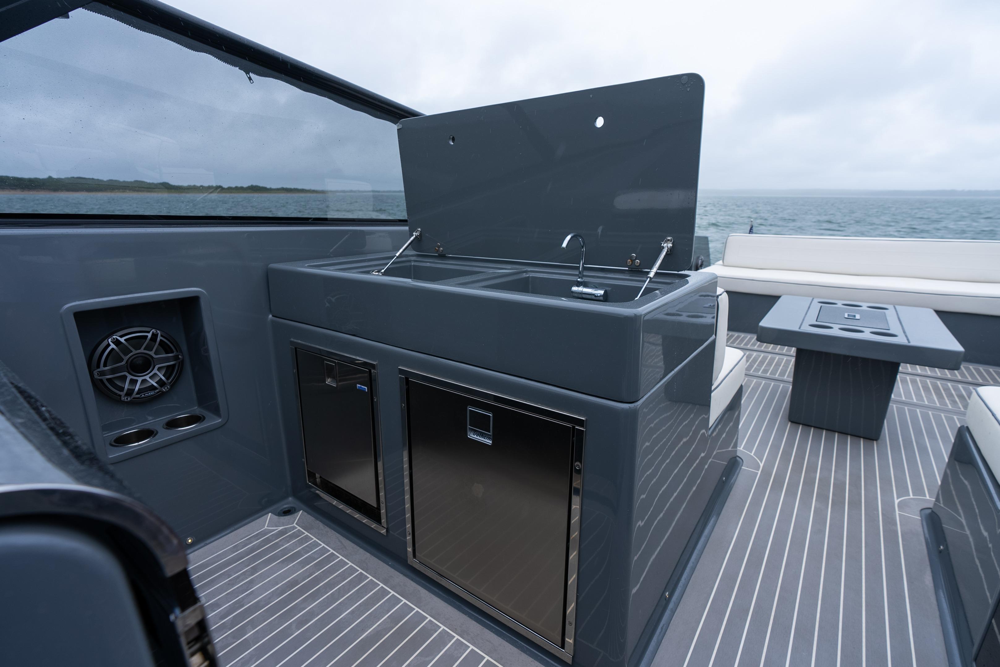 - Cabin galley with refrigerator, sink, microwave, cabinets