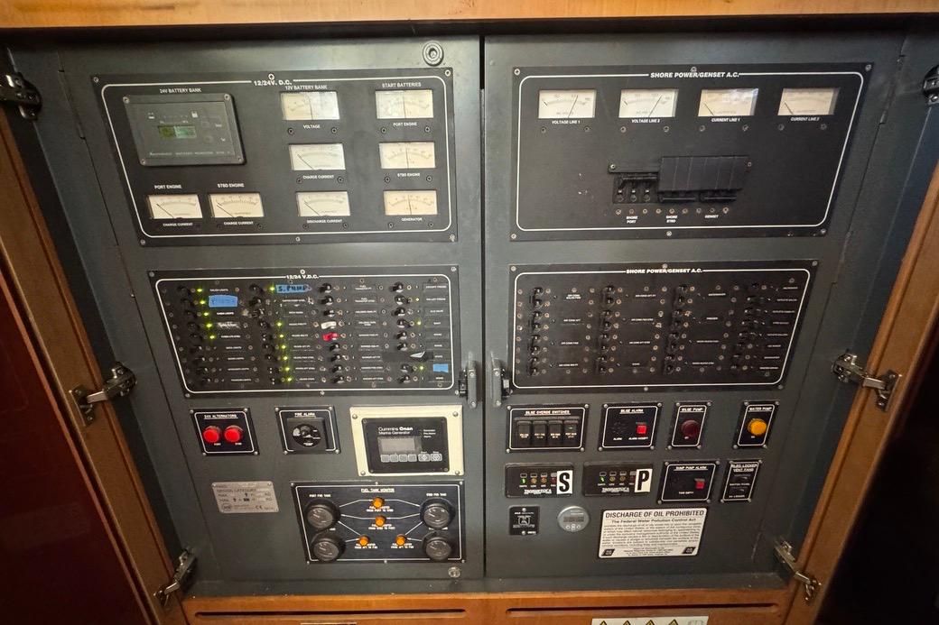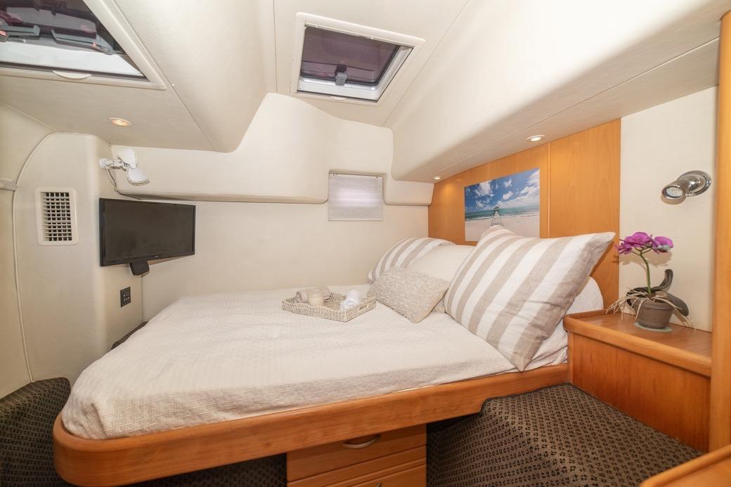 This vessel is particularly well designed and laid out for shorthanded sailing/cruising/chartering – with electric winches for sail handling, and with most controls at the helm station on the flybridge, she is a pleasure to control.
