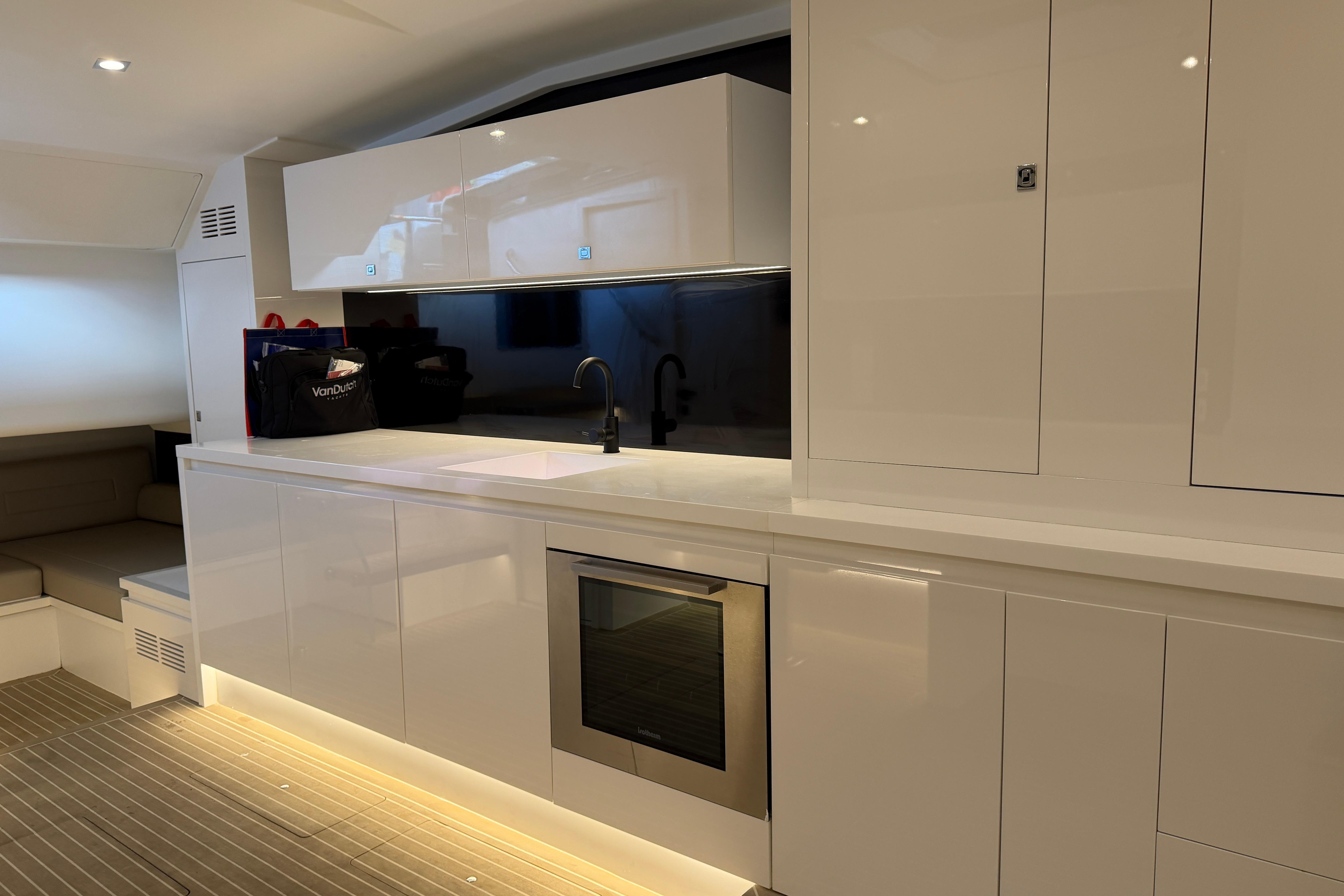 - Storage: Cabinets above and drawers and storage areas below the galley.