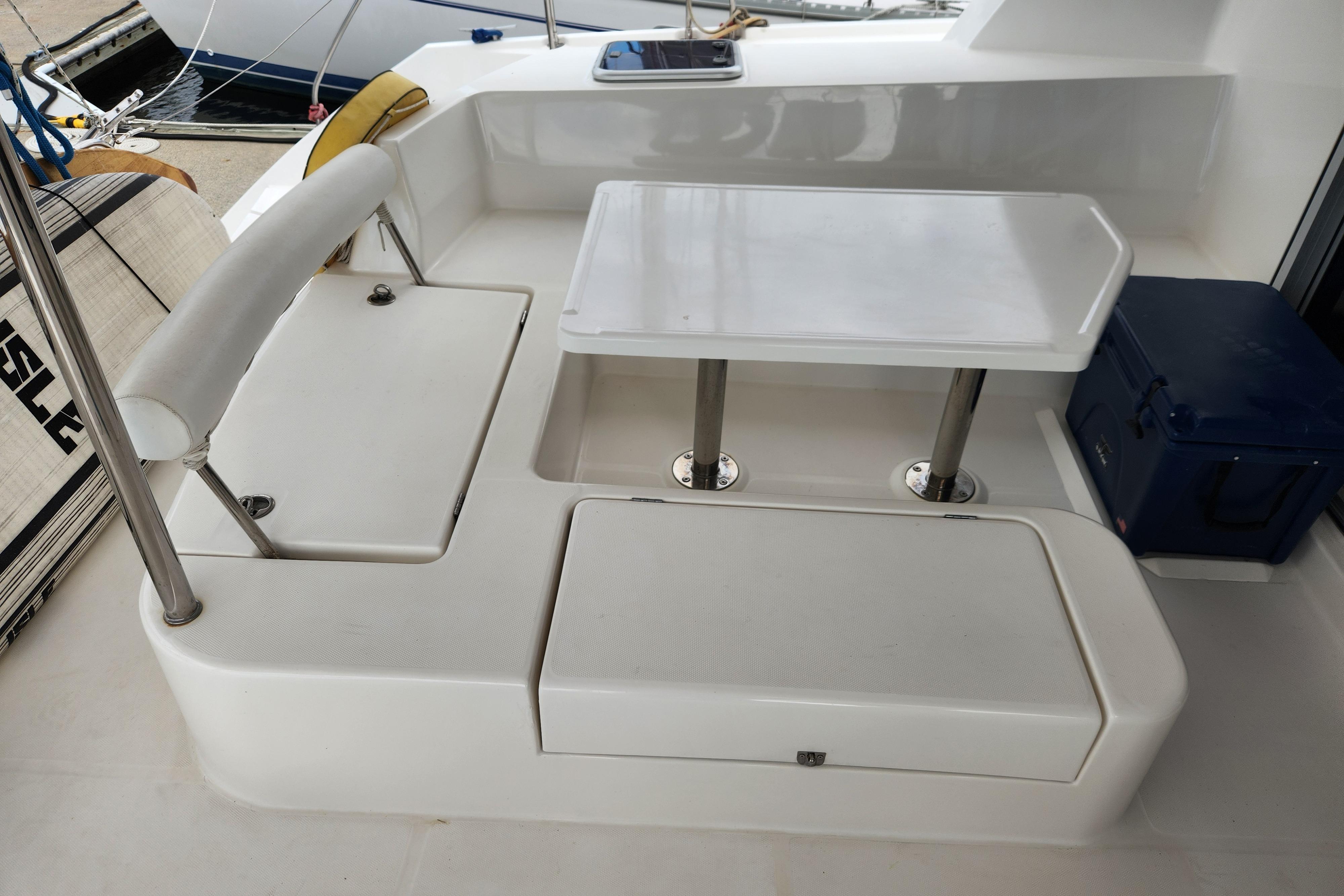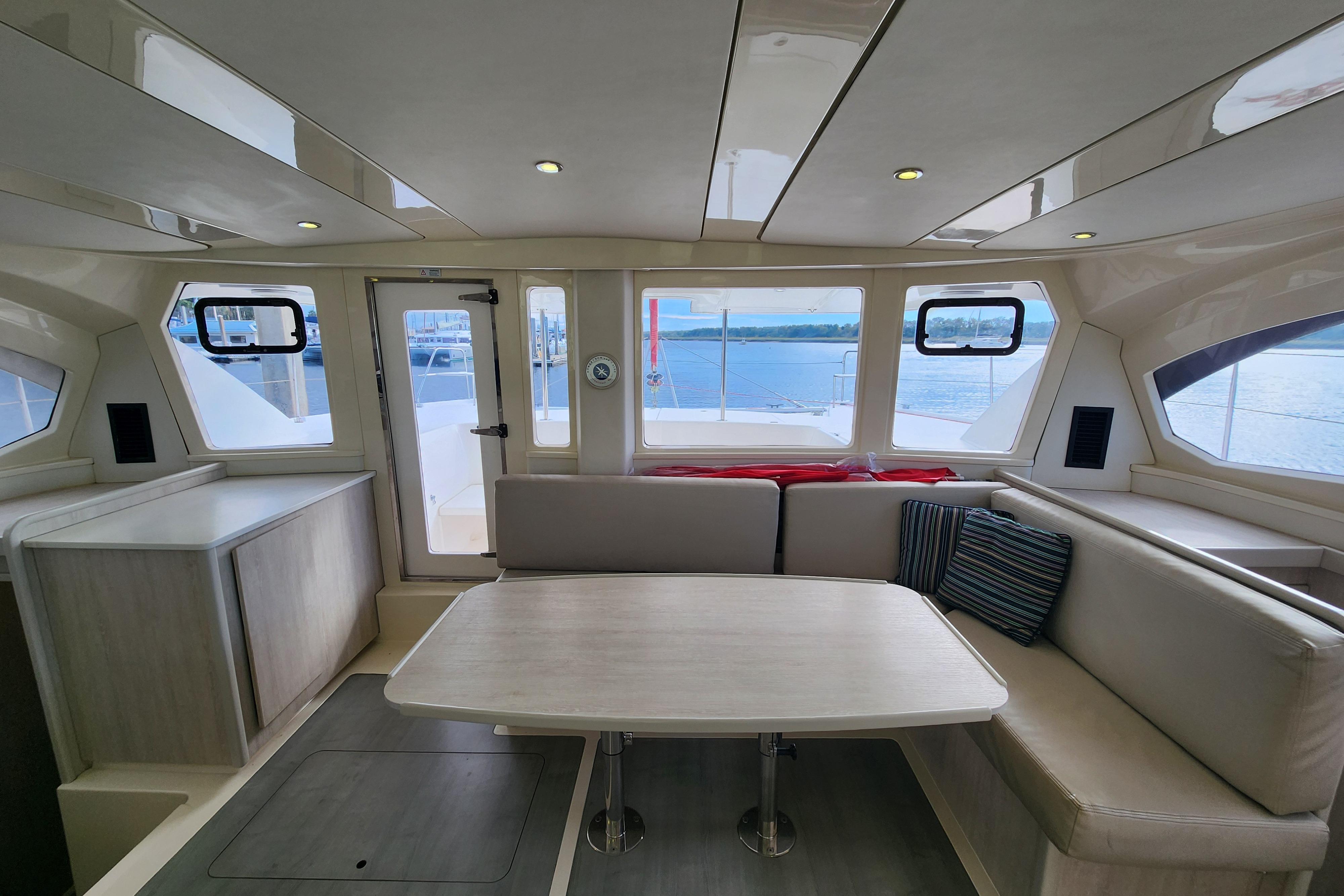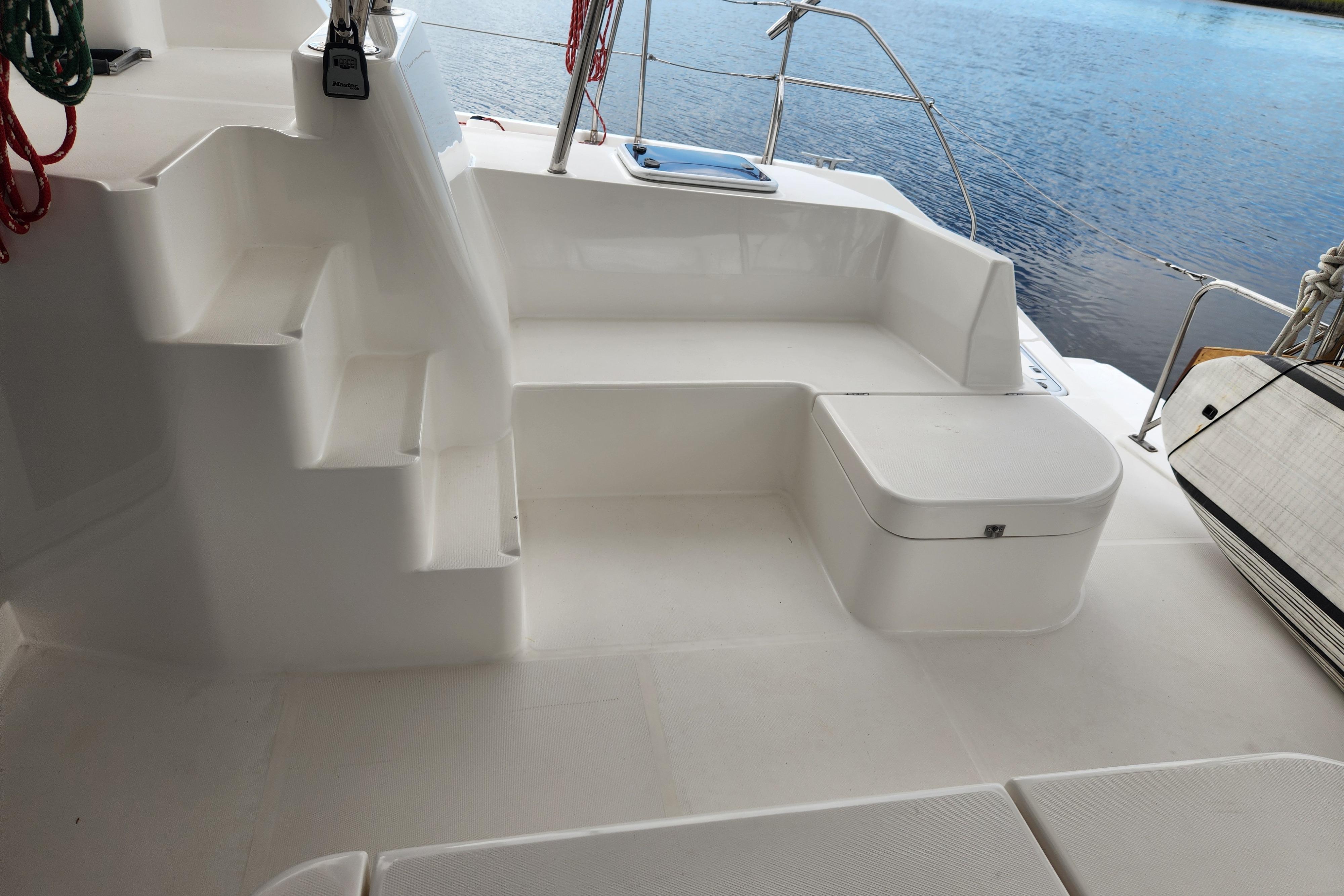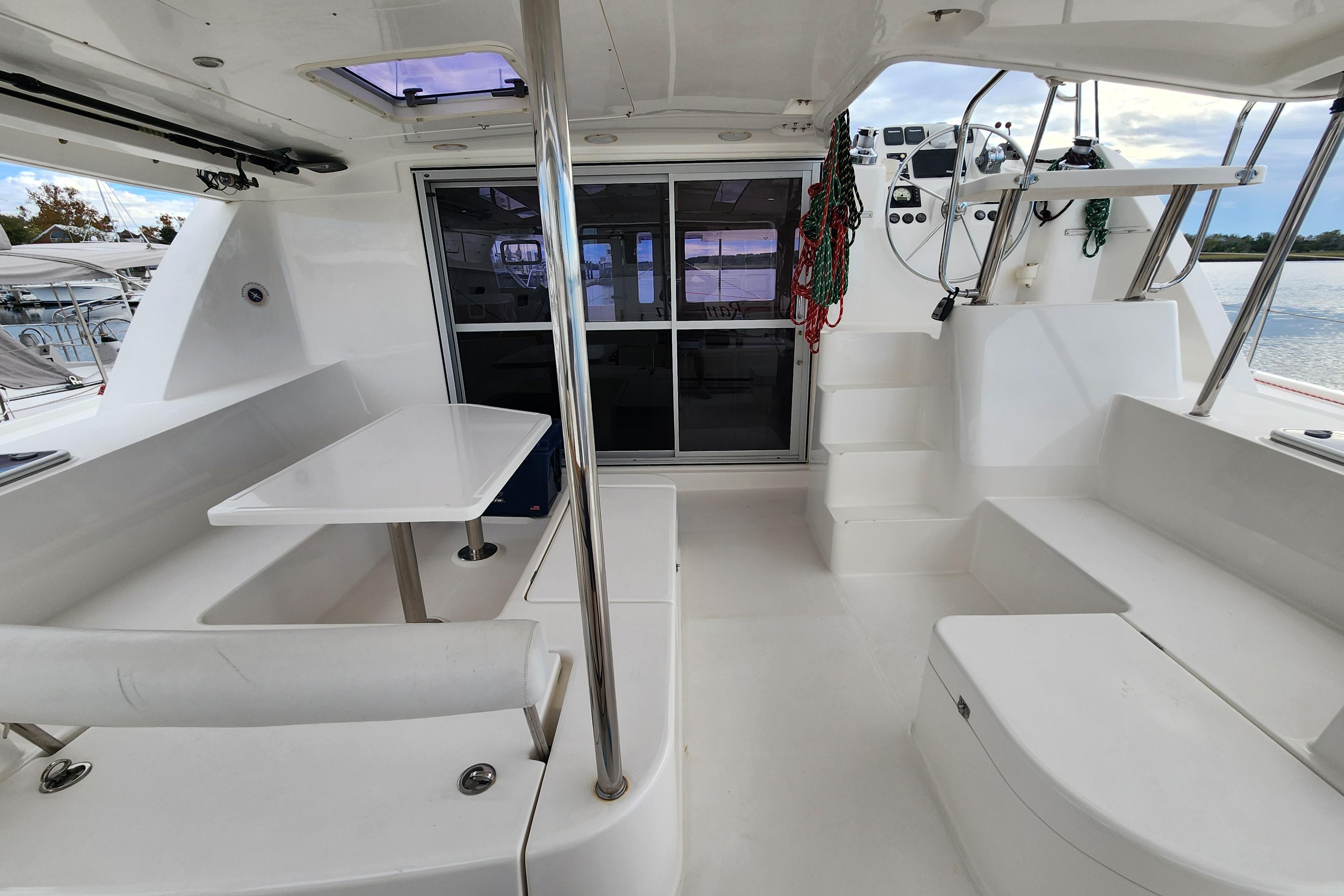 One of the many intriguing features this yacht offers is the forward cockpit with direct access from the saloon. While a forward cockpit is conventional on the modern cruising catamaran, the Leopard 44 distinctively offers an integral hardtop bimini, protecting the forward and aft cockpit, while also creating a comfortable outdoor living space.