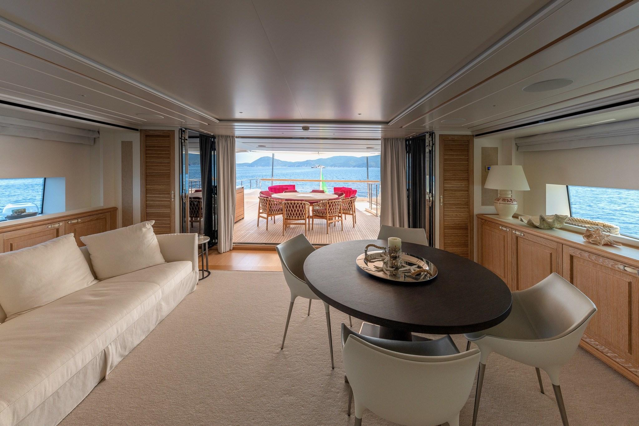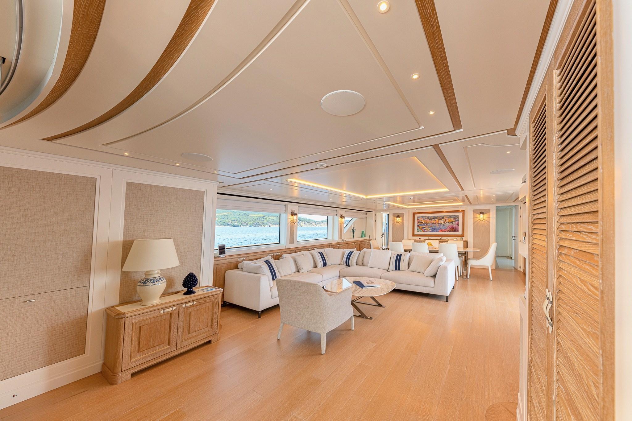 La conception du yacht met l’accent sur l’intimité, avec un aménagement qui sépare les quartiers de l’équipage des cabines des invités via un escalier dédié. L’intérieur présente une palette de couleurs neutres, des matériaux luxueux tels que le parquet, le marbre et des tissus d’ameublement sur mesure, mêlant élégance contemporaine et tradition maritime.