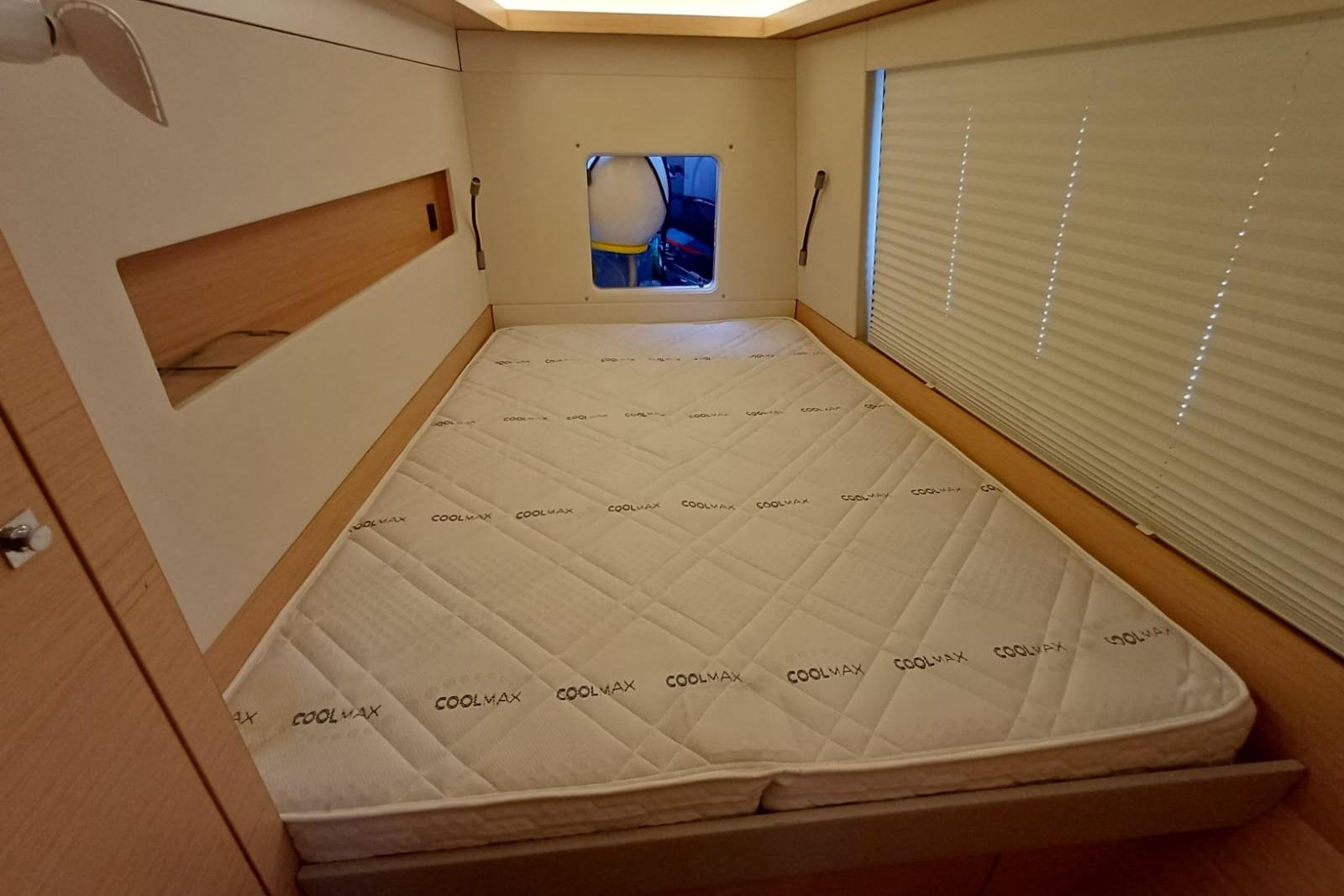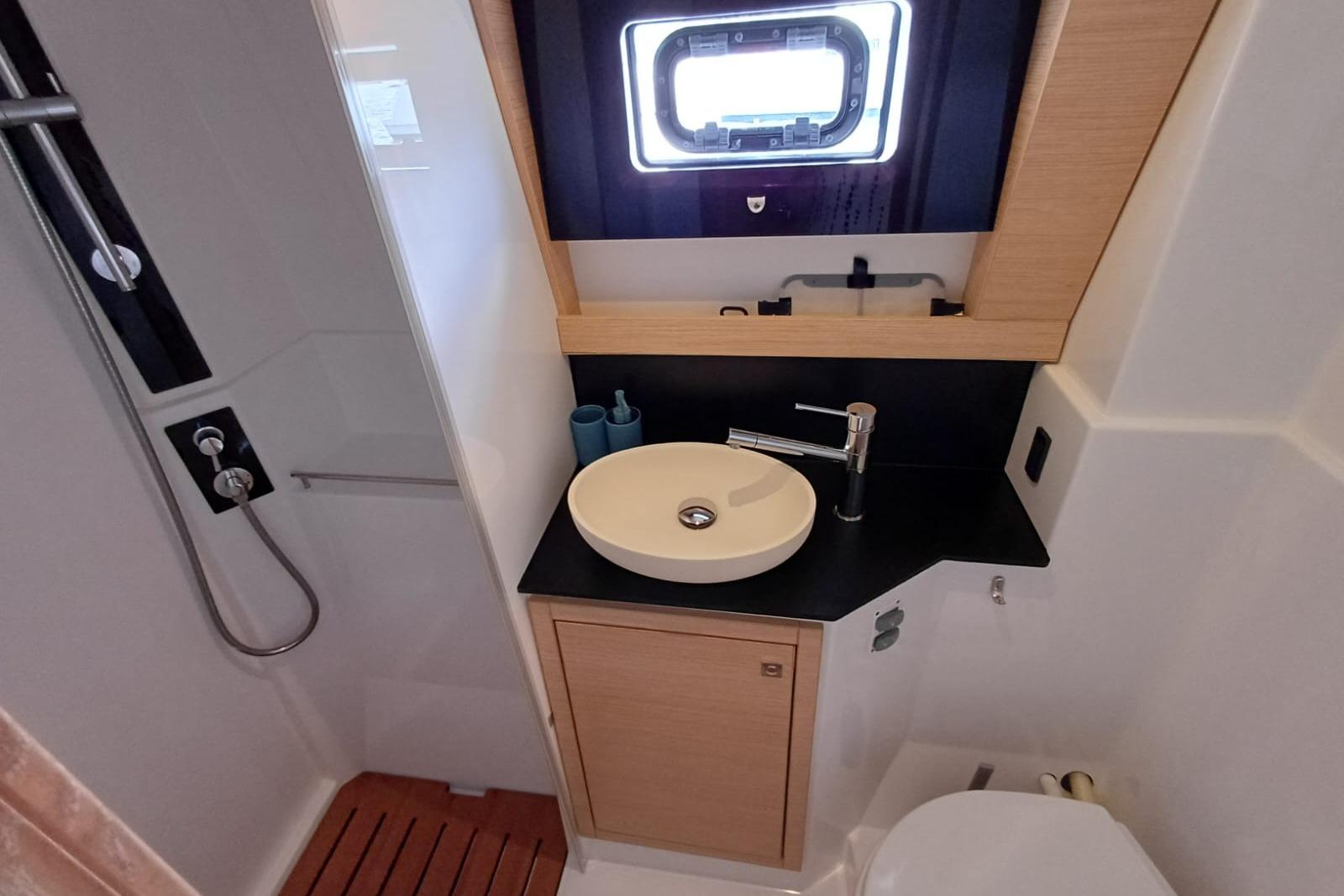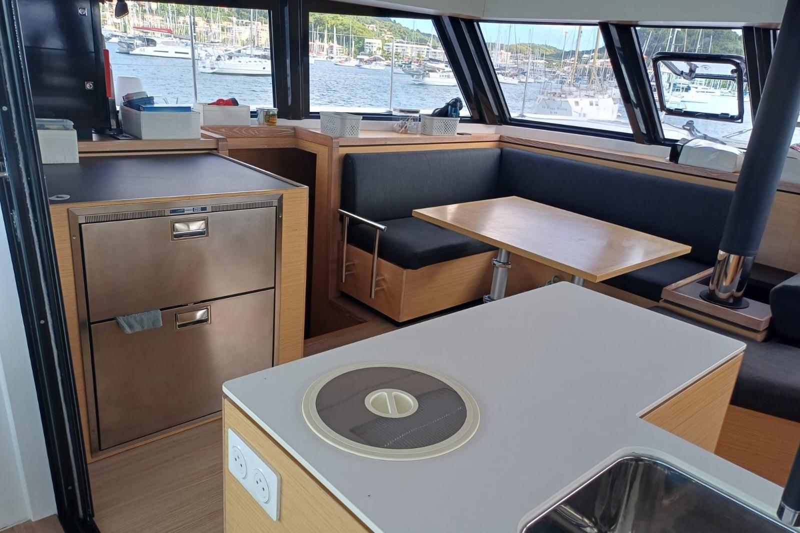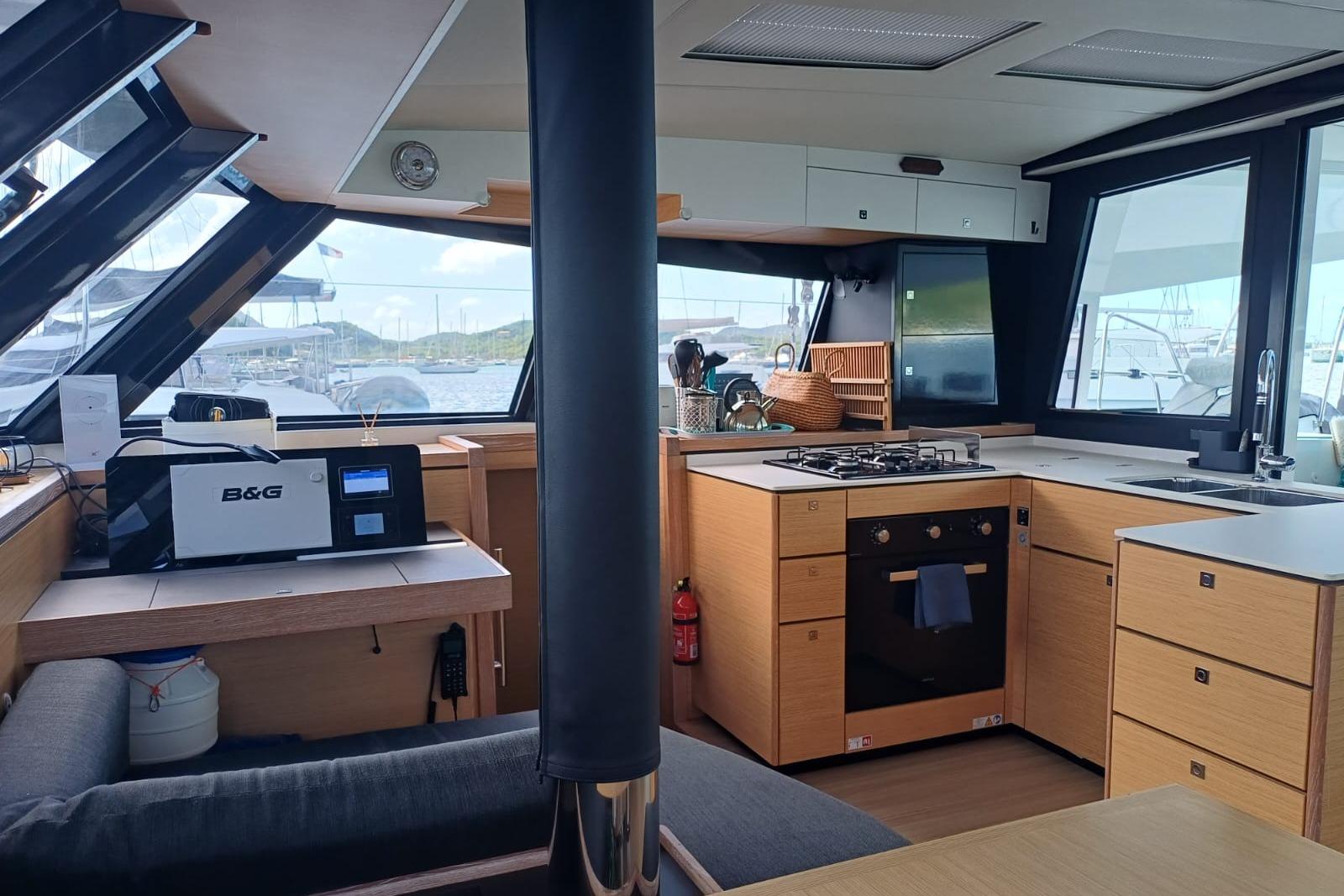 Le bateau dispose d’un cockpit ouvert, d’espaces de vie lumineux et d’une circulation fluide entre les zones intérieures et extérieures. L’aménagement et les équipements permettent une utilisation prolongée en autonomie, y compris pour des navigations au long cours.