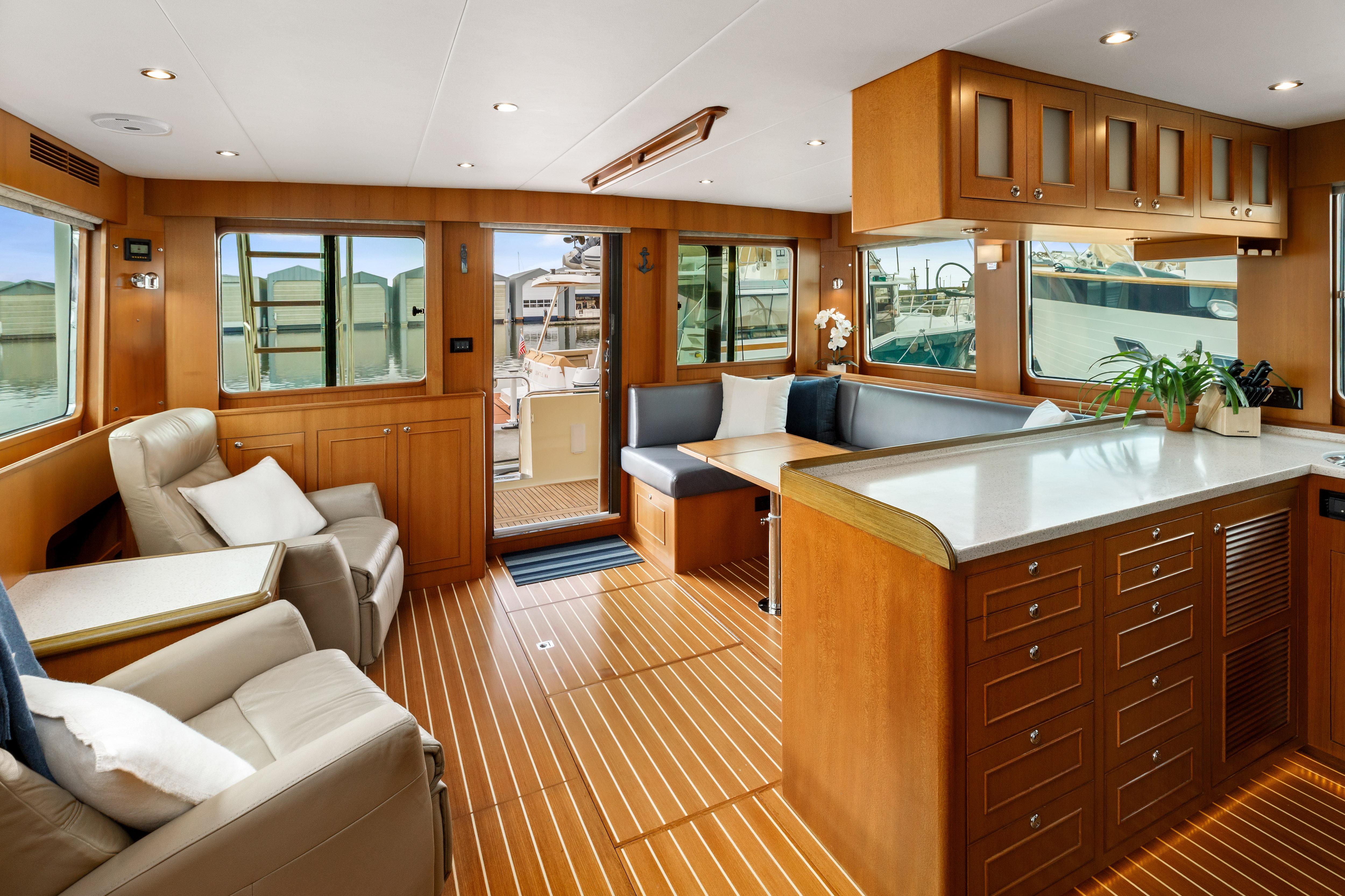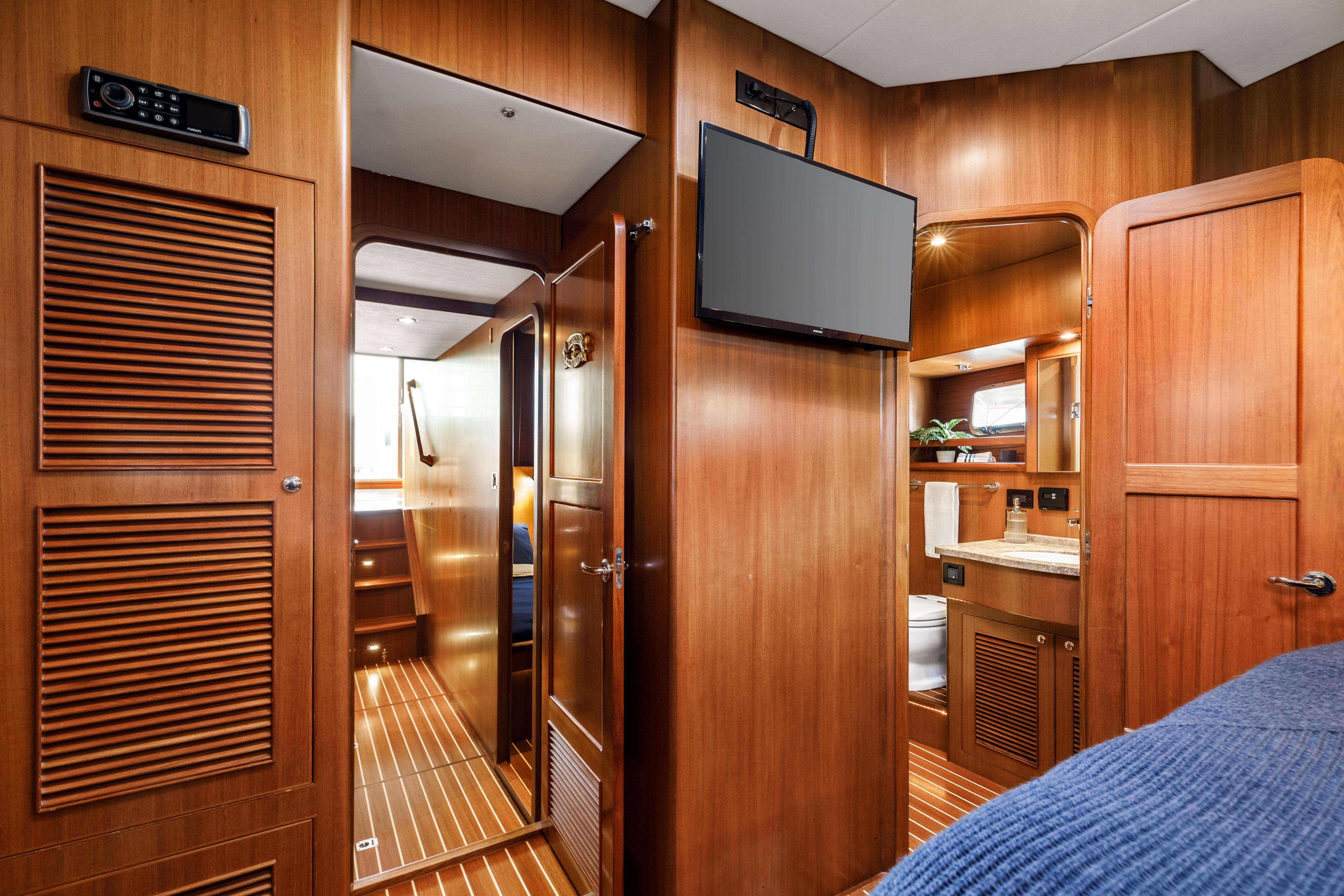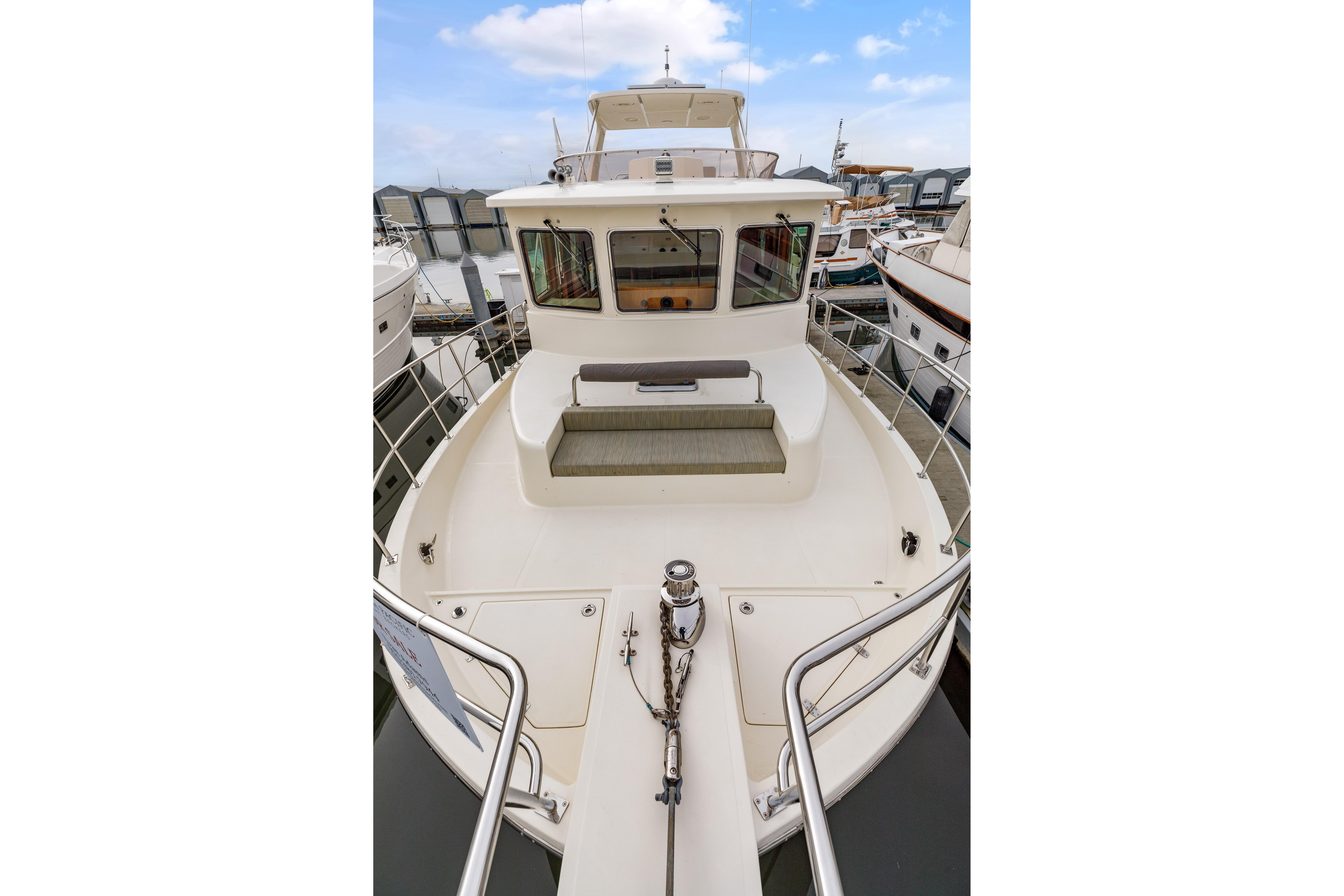 The NP49 has a rugged and practical exterior for ease of maintenance, and a world class interior finish for maximum comfort. Tumbleweed was built with the most popular layout, featuring a raised pilothouse with centerline helm, large galley with full size residential style refrigerator, and space for two household recliners facing the dinette and pop up TV. Below deck are two spacious staterooms and heads. The guest stateroom has two single beds that can slide together to make a queen, plus a fold down bunk. The outside bunk also converts into an innovative home office desk space. The master stateroom has a surprising amount of storage and features a low, island queen bed that is easily accessible. Tumbleweed has a large swimstep and cockpit (which is fully covered by the boat deck above). The flybridge is accessed via safe and comfortable stairs through either door on the side of the pilothouse, or from the ladder in the cockpit. The flybridge features the popular hardtop, refrigerator, sink, comfortable seating, and a Nick Jackson crane.