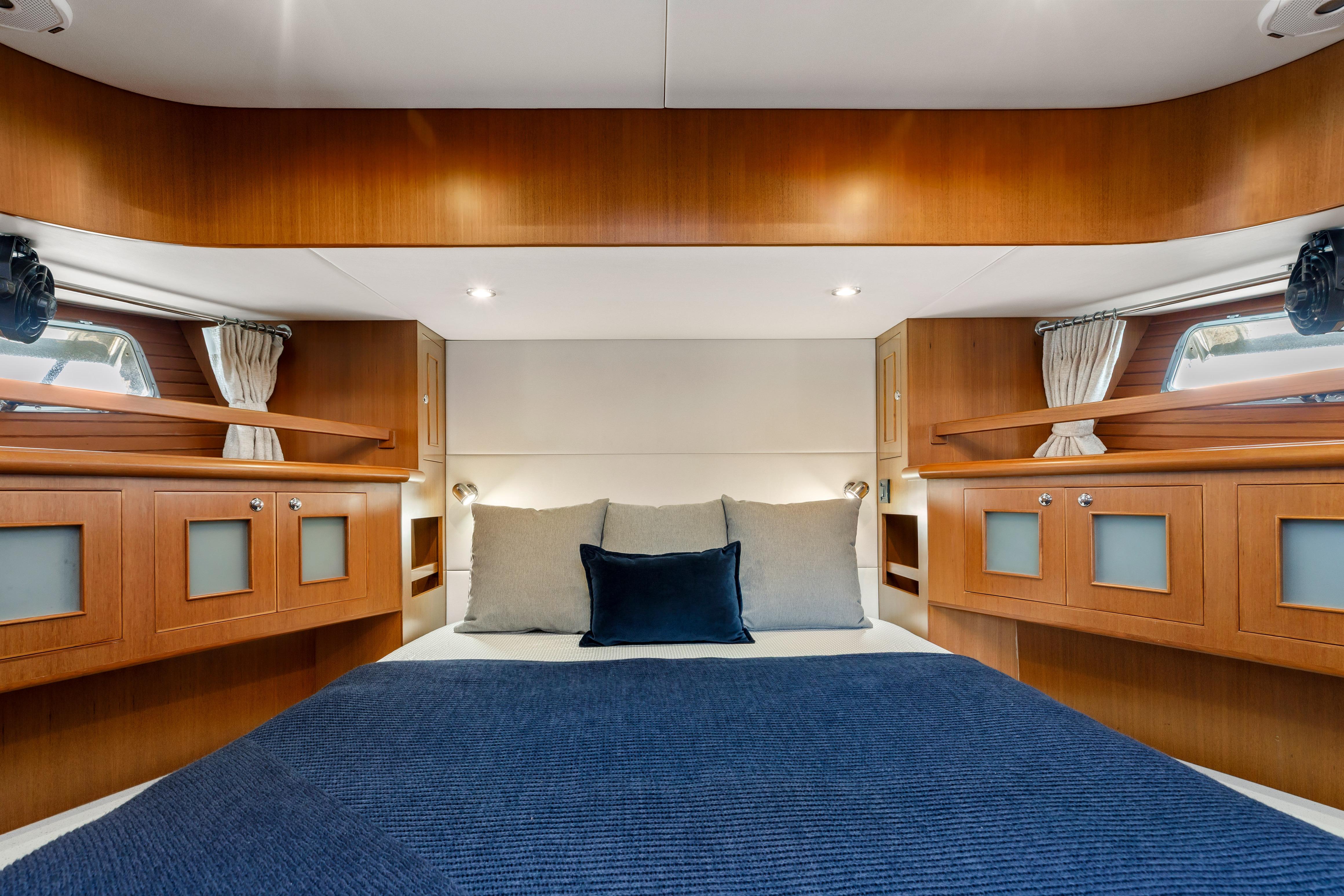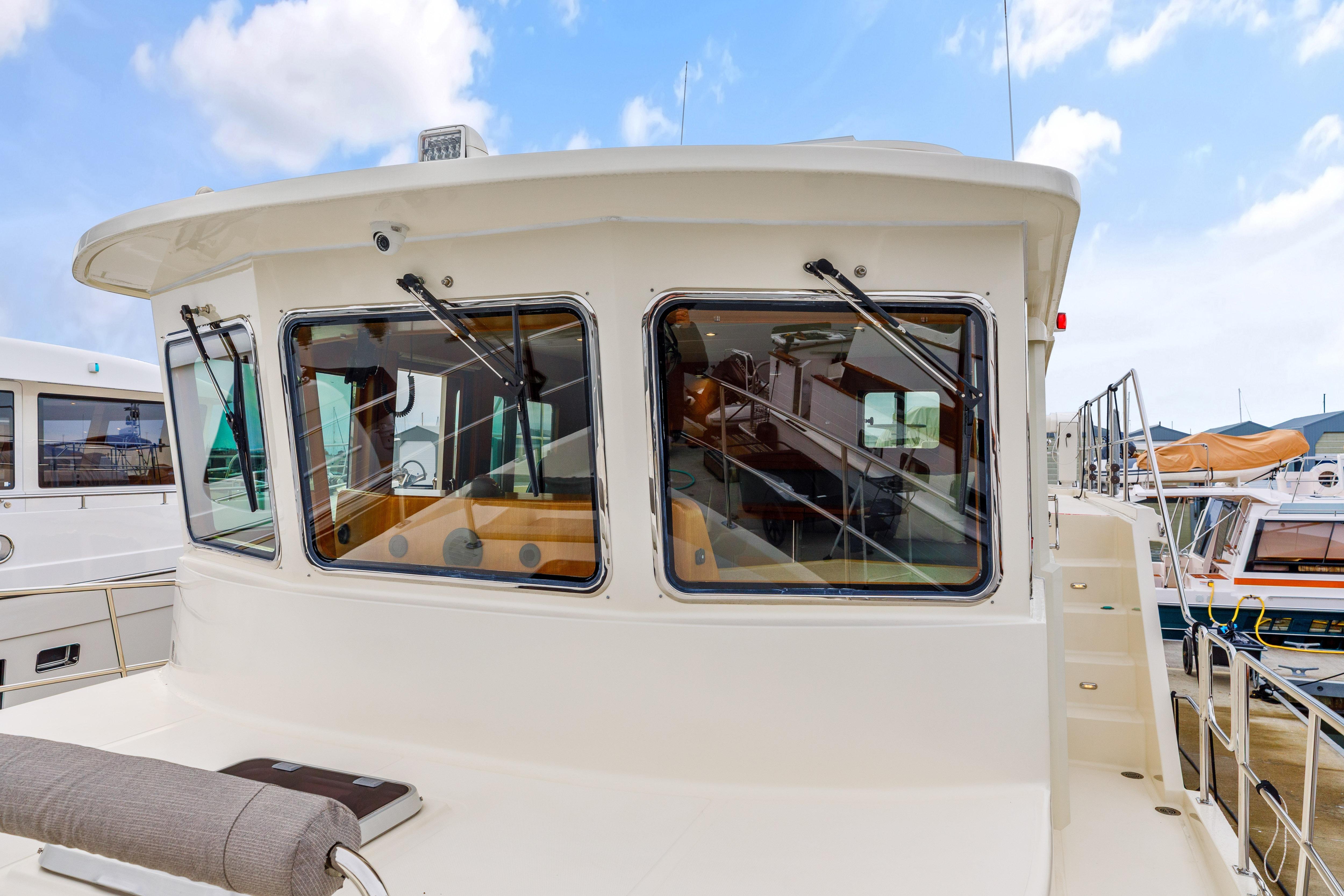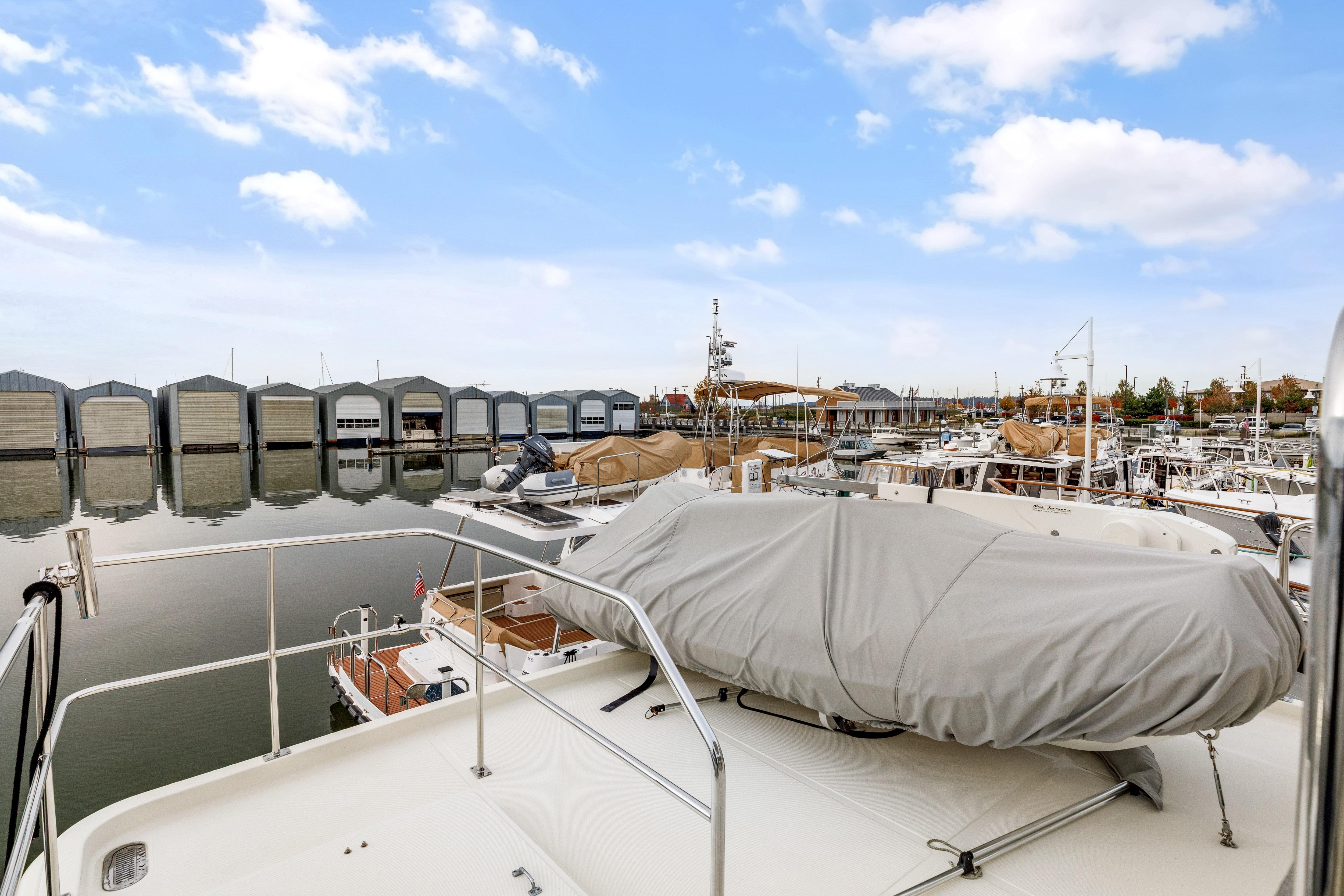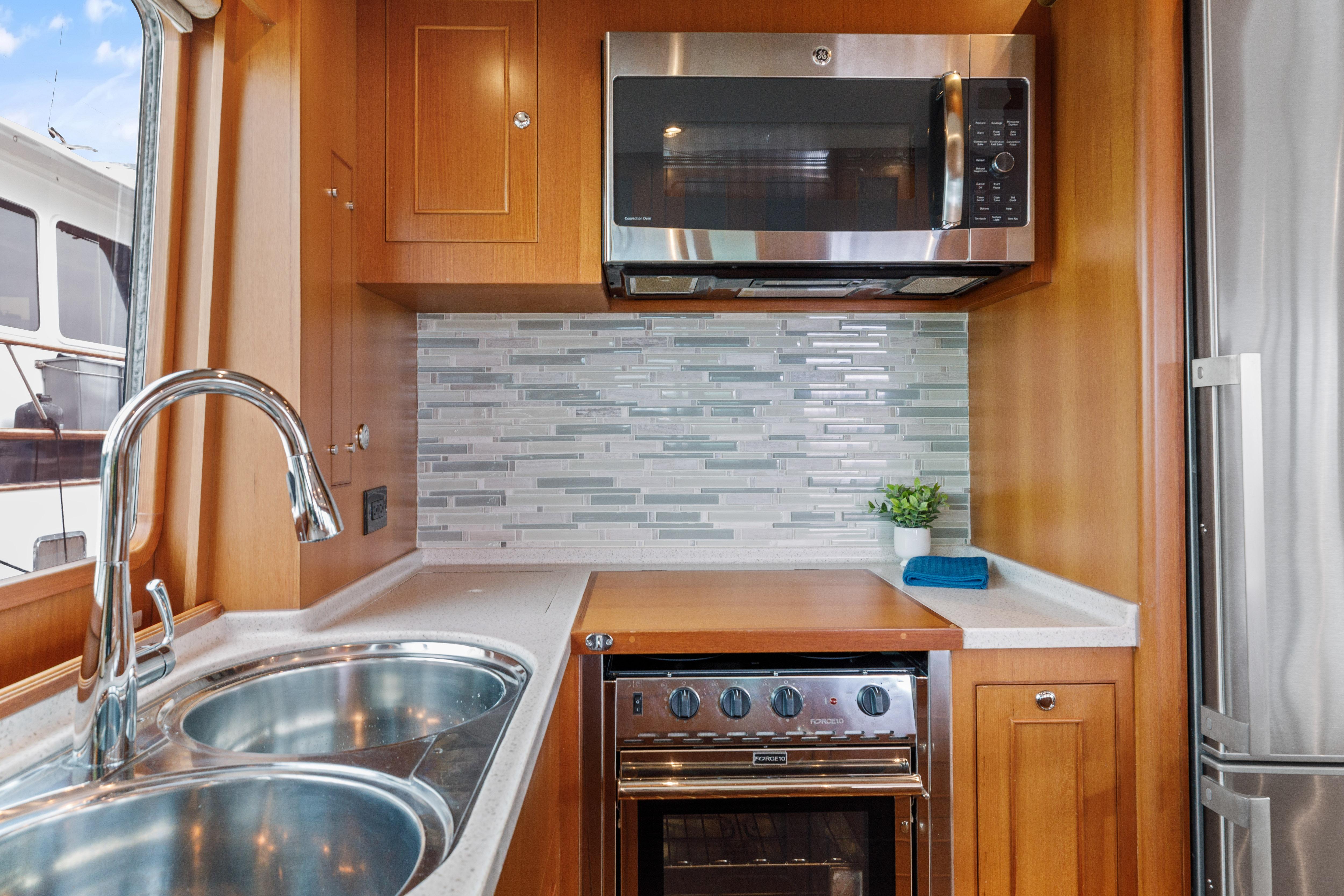 The NP49 has a rugged and practical exterior for ease of maintenance, and a world class interior finish for maximum comfort. Tumbleweed was built with the most popular layout, featuring a raised pilothouse with centerline helm, large galley with full size residential style refrigerator, and space for two household recliners facing the dinette and pop up TV. Below deck are two spacious staterooms and heads. The guest stateroom has two single beds that can slide together to make a queen, plus a fold down bunk. The outside bunk also converts into an innovative home office desk space. The master stateroom has a surprising amount of storage and features a low, island queen bed that is easily accessible. Tumbleweed has a large swimstep and cockpit (which is fully covered by the boat deck above). The flybridge is accessed via safe and comfortable stairs through either door on the side of the pilothouse, or from the ladder in the cockpit. The flybridge features the popular hardtop, refrigerator, sink, comfortable seating, and a Nick Jackson crane.