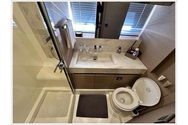 - Esterni: Ampio pozzetto con tavolo e sedute imbottite, area prendisole a prua e grande plancetta bagno idraulica, ideale per alaggio tender o jet ski. Le finiture in teak aggiungono un tocco di lusso.