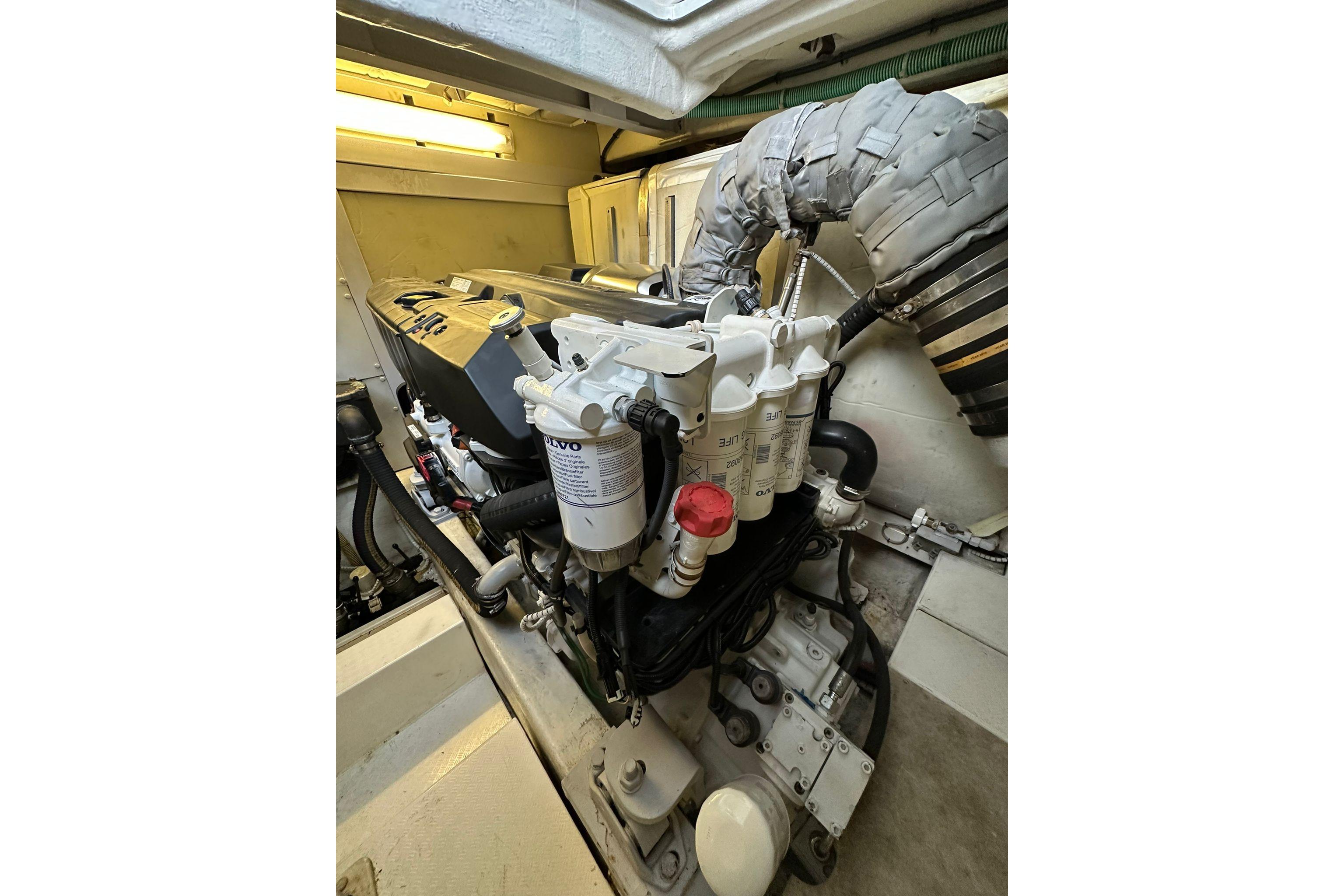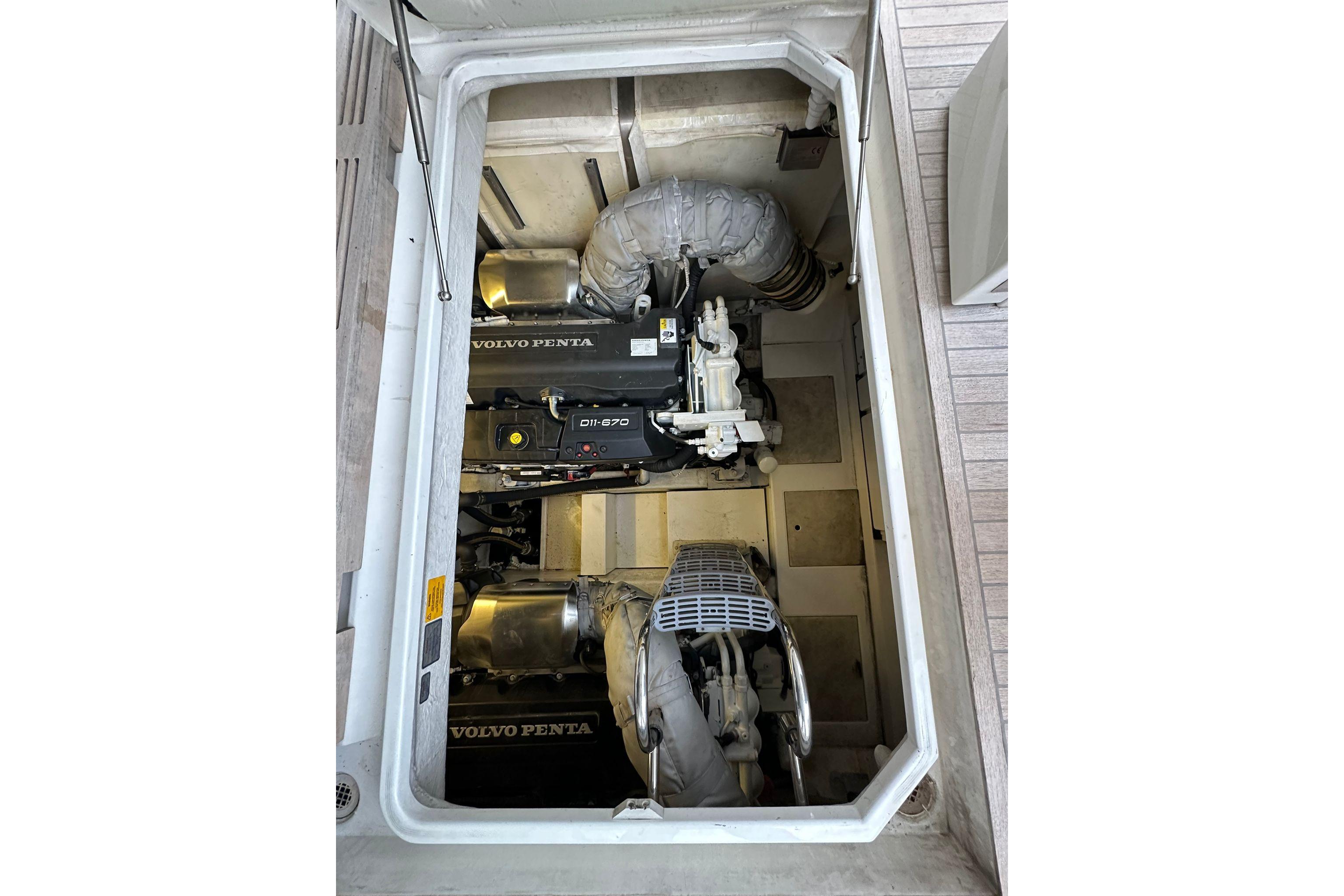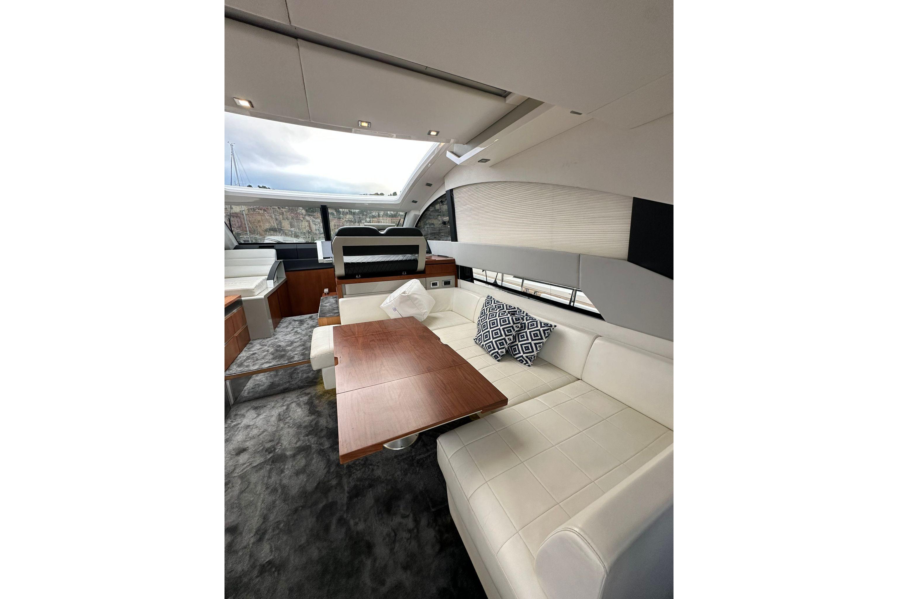 The cockpit is fitted with a teak deck and a wet bar with a grill and fridge. The seating area can be converted into a sunbathing space, maximizing outdoor relaxation. At the stern, a hydraulic swim platform allows easy access to the water and can carry a tender or jet ski.