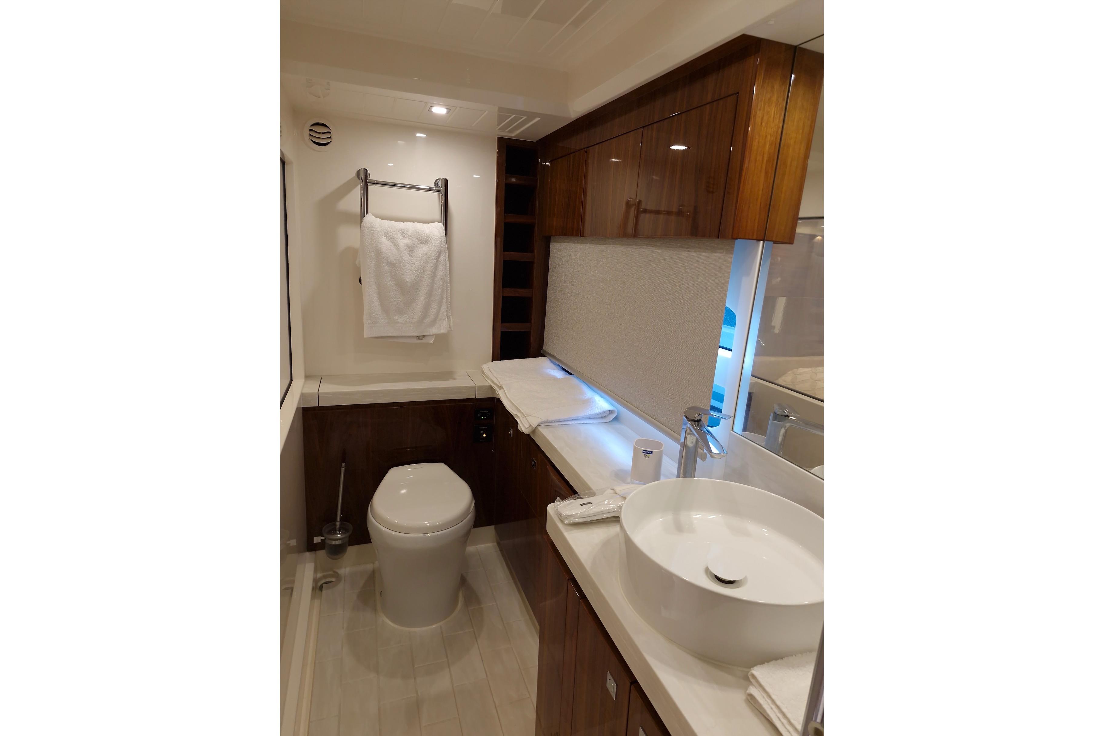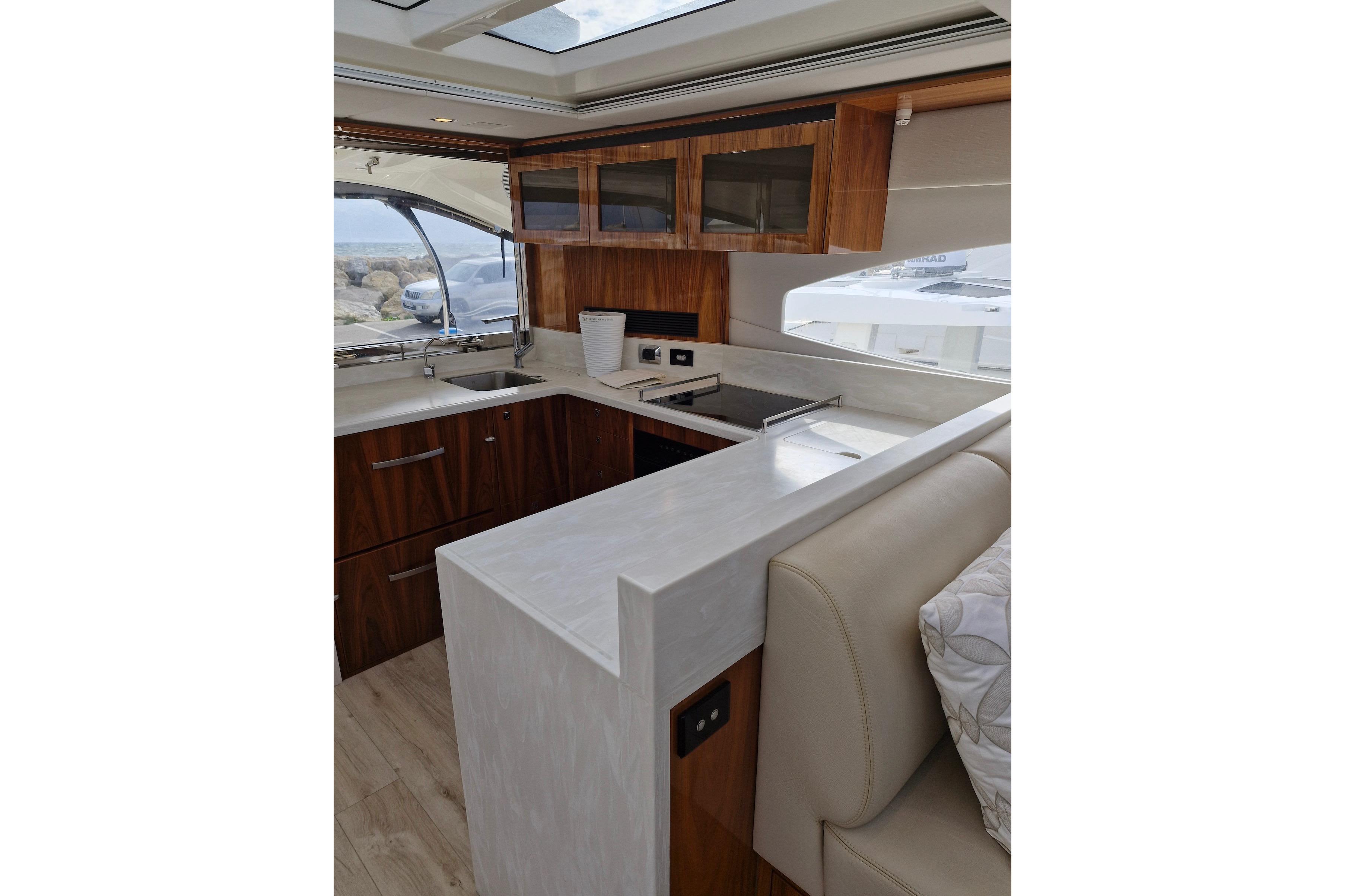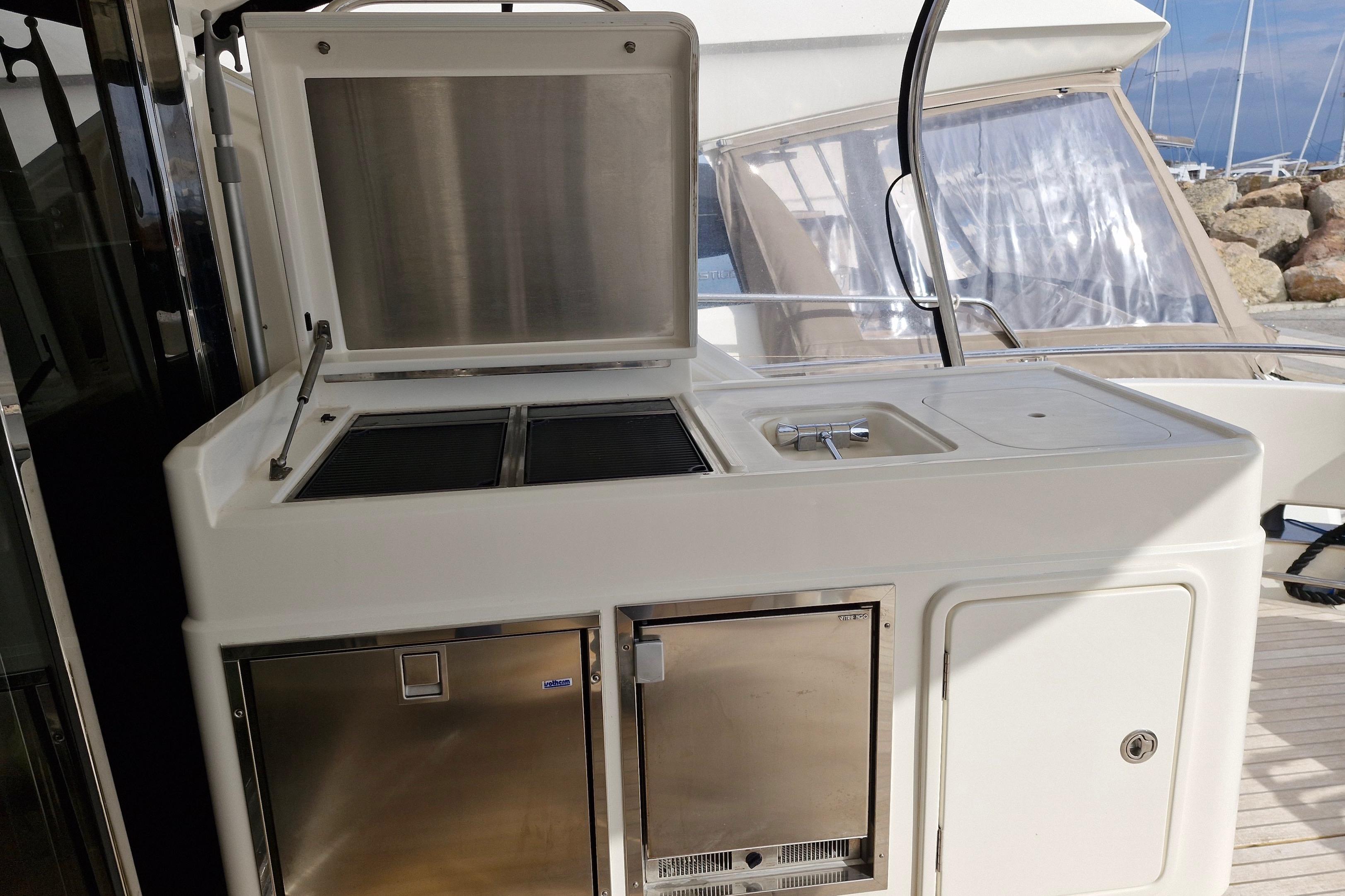 La cuisine, située à l'arrière du carré et donnant sur le cockpit, est entièrement équipée d'appareils de cuisson Miele, d'un réfrigérateur spacieux, de plans de travail en Corian et d'un lave-vaisselle. Le bloc cuisine du cockpit, idéalement situé sous le capot moteur, comprend une plaque de cuisson, un barbecue, un réfrigérateur et une machine à glaçons.