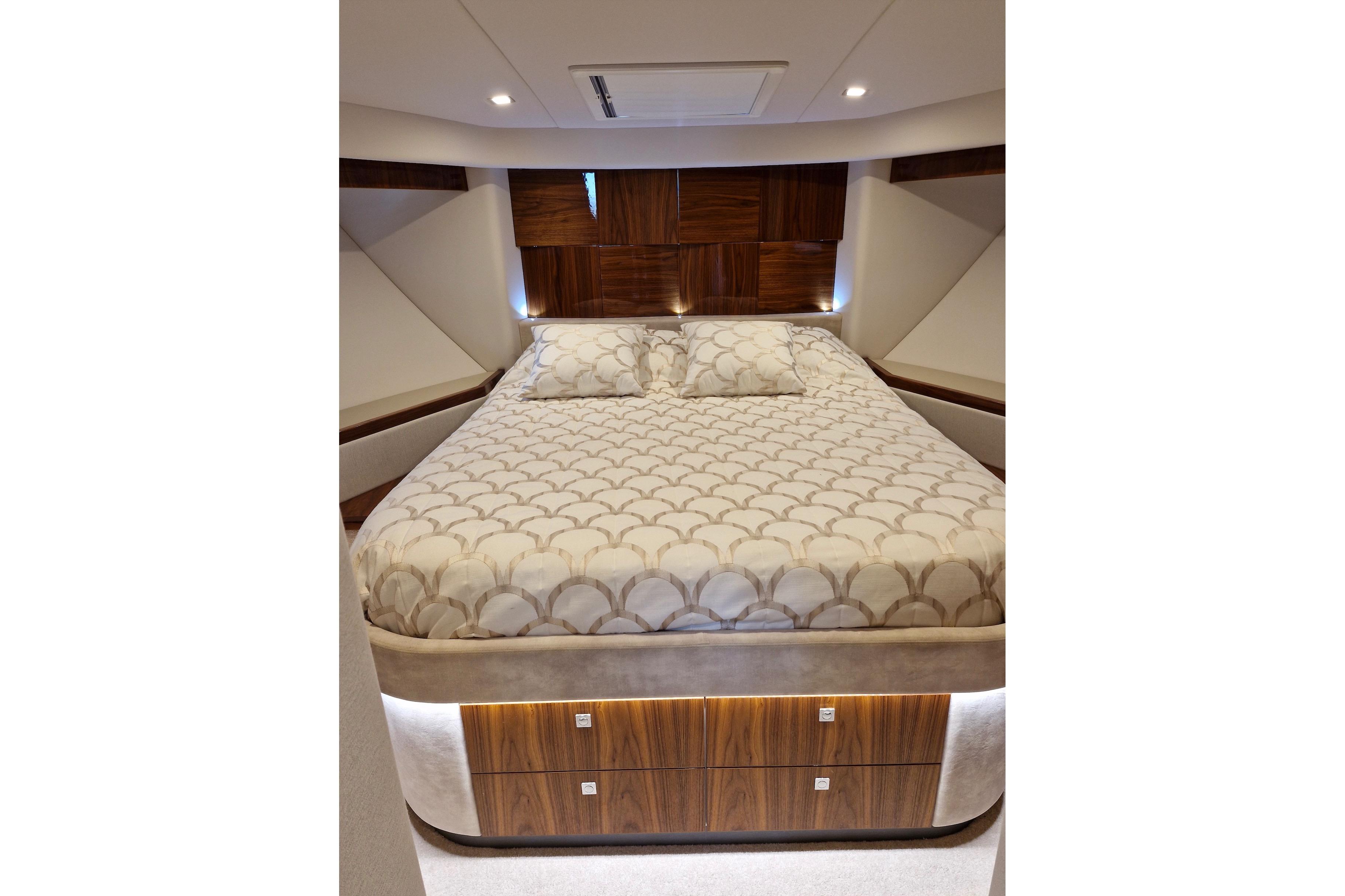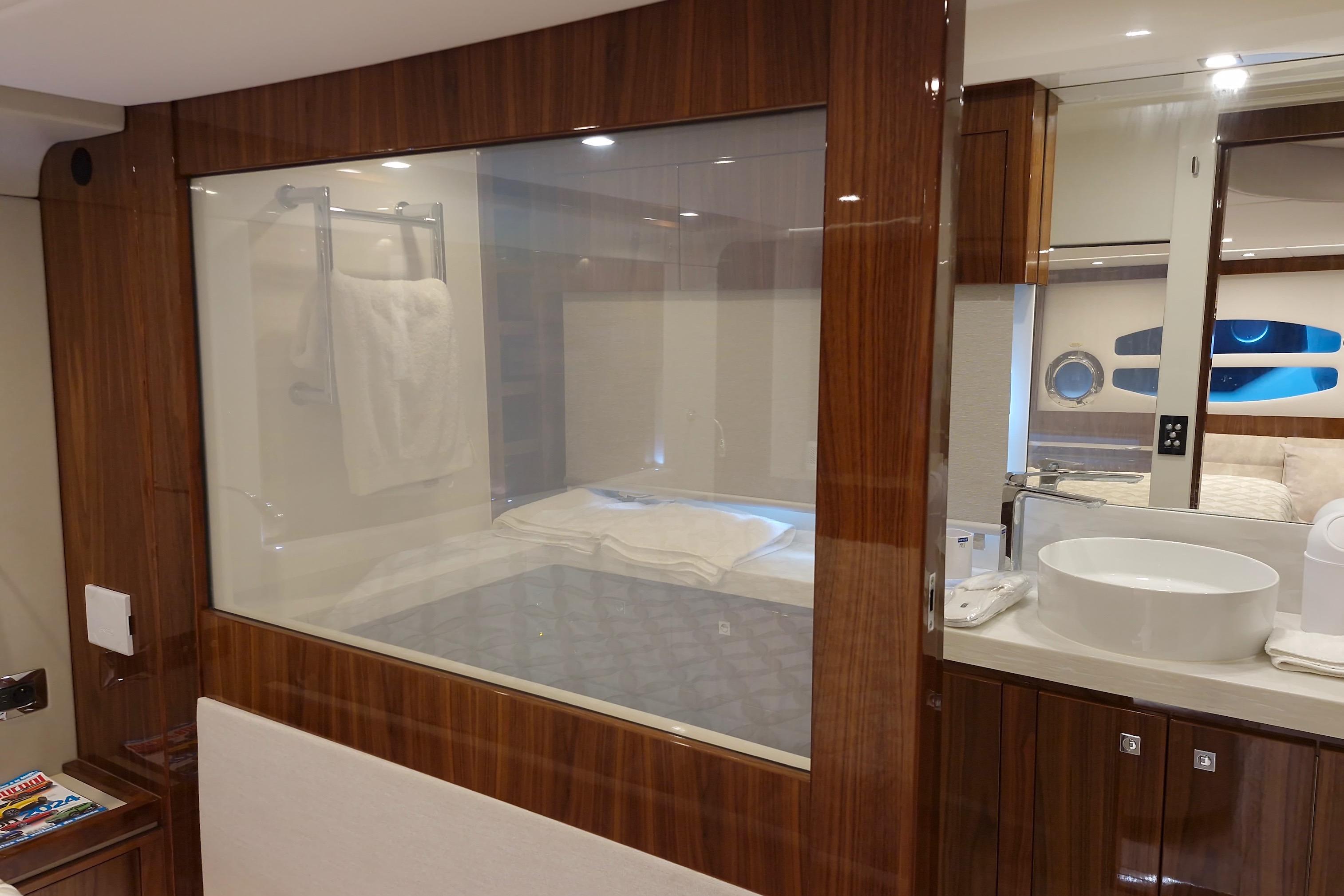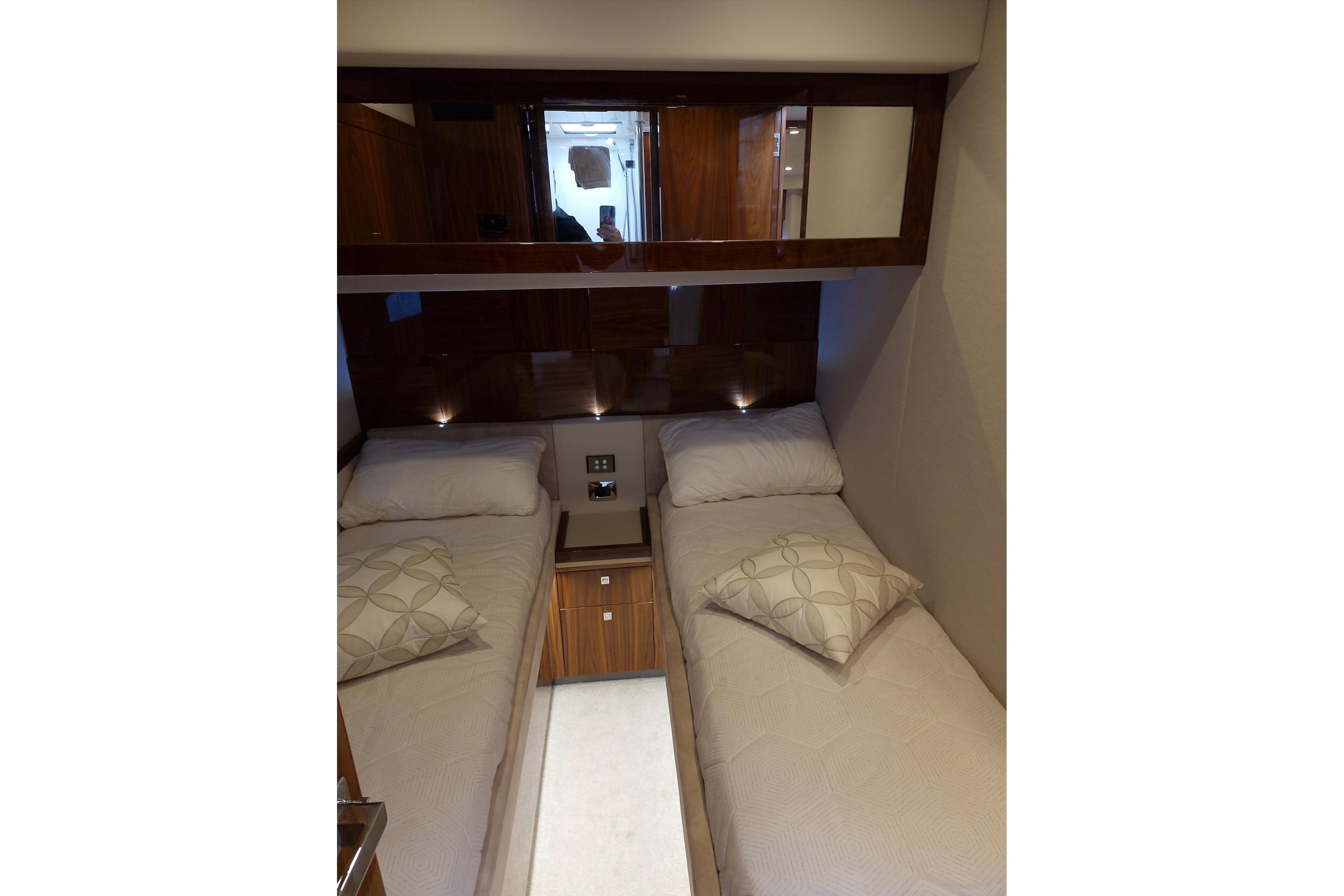 L'aménagement le plus prisé de la gamme Riviera comprend quatre cabines tropicales climatisées, dont la cabine propriétaire pleine largeur avec salle de bain et dressing, la cabine VIP à l'avant avec salle de bain privative, et les deux cabines doubles à tribord et bâbord avec salle de bain partagée. Toutes les cabines et le carré sont équipés de téléviseurs à écran plat connectés. L'éclairage d'ambiance LED, doux et élégant, imprègne tout le Mon Trésor.